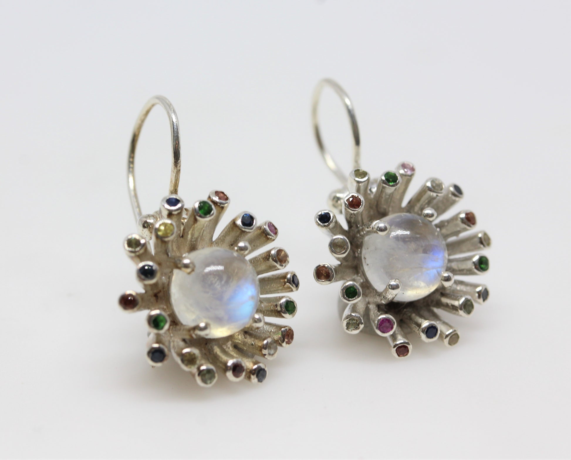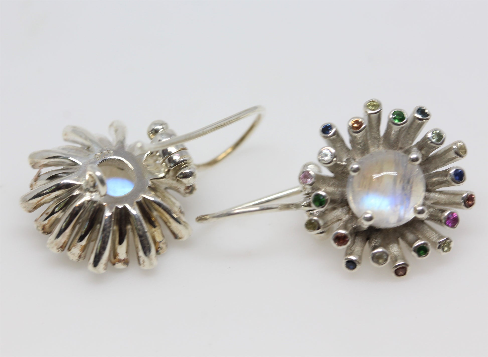 A pair of sterling silver earrings set with a 8mm round moonstone gemstone, and a collection of tourmaline, tsavorite garnet, and blue sapphire accent stones.