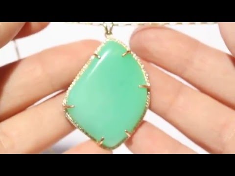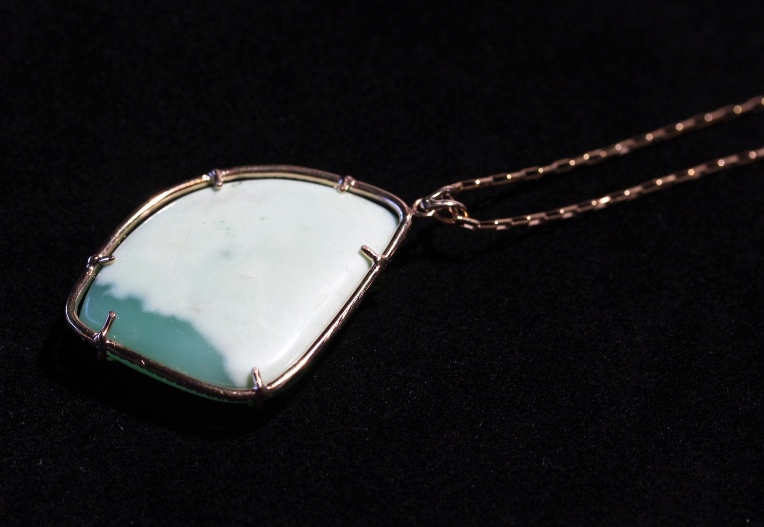 This incredible chrysoprase set into 14k gold and lined with diamonds has the most beautiful glow! It has an aqua blue/green color and a beautiful free form cut.