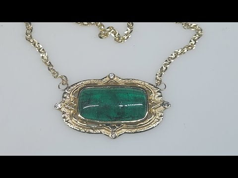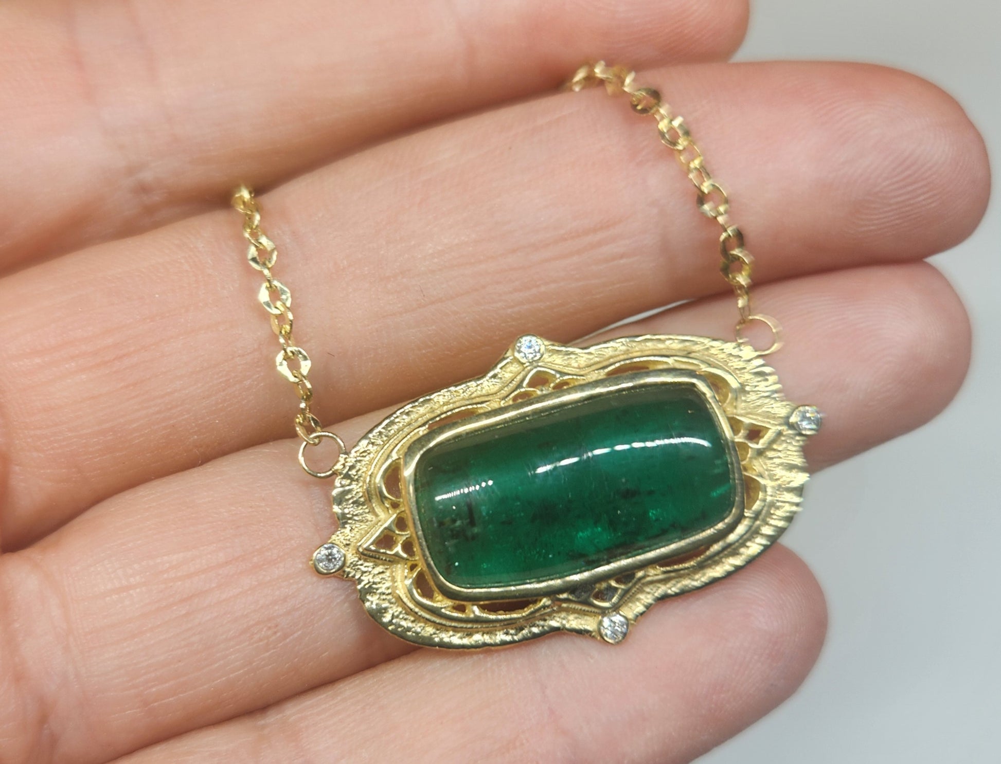 A natural Ethiopian Emerald set in 14k Yellow Gold with four diamond accent stones. The pendant hangs on a 18 inch solid gold split chain.