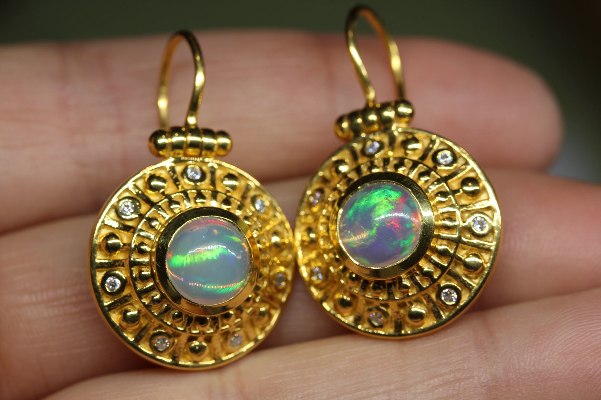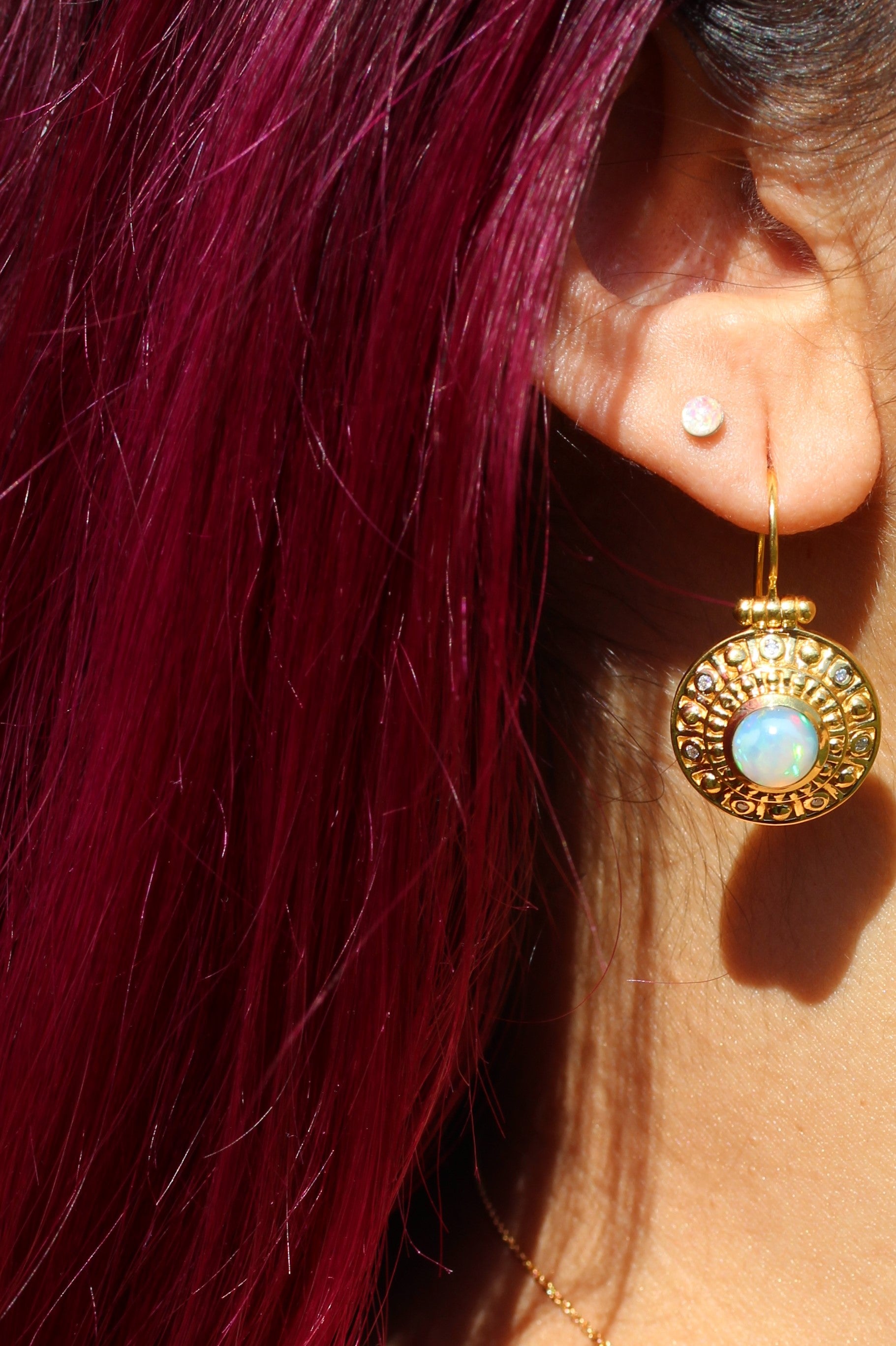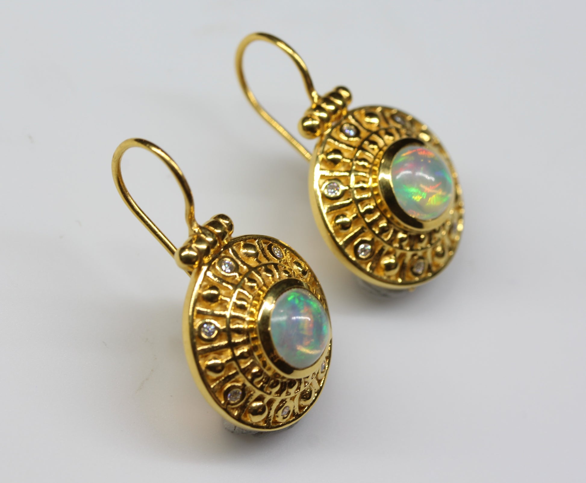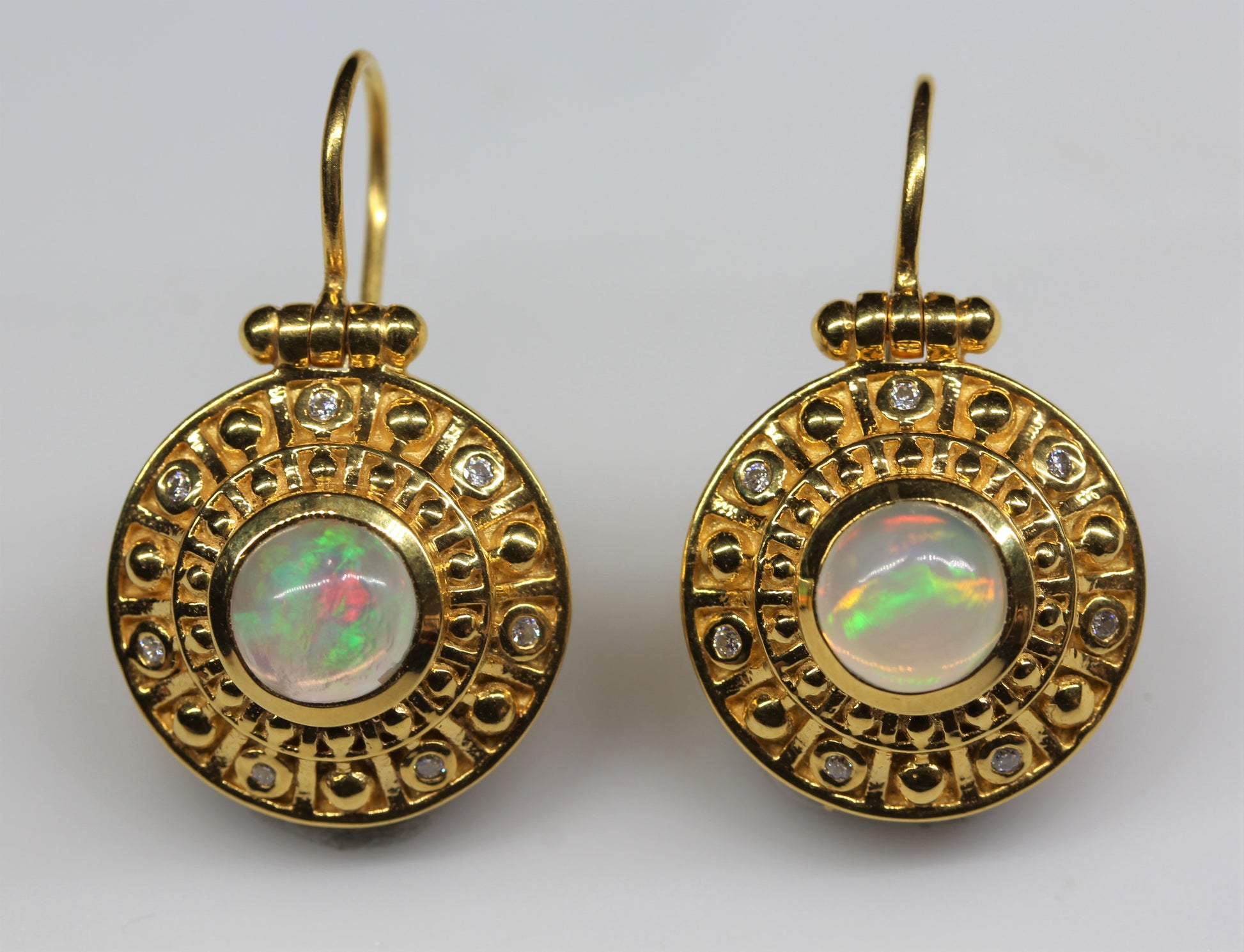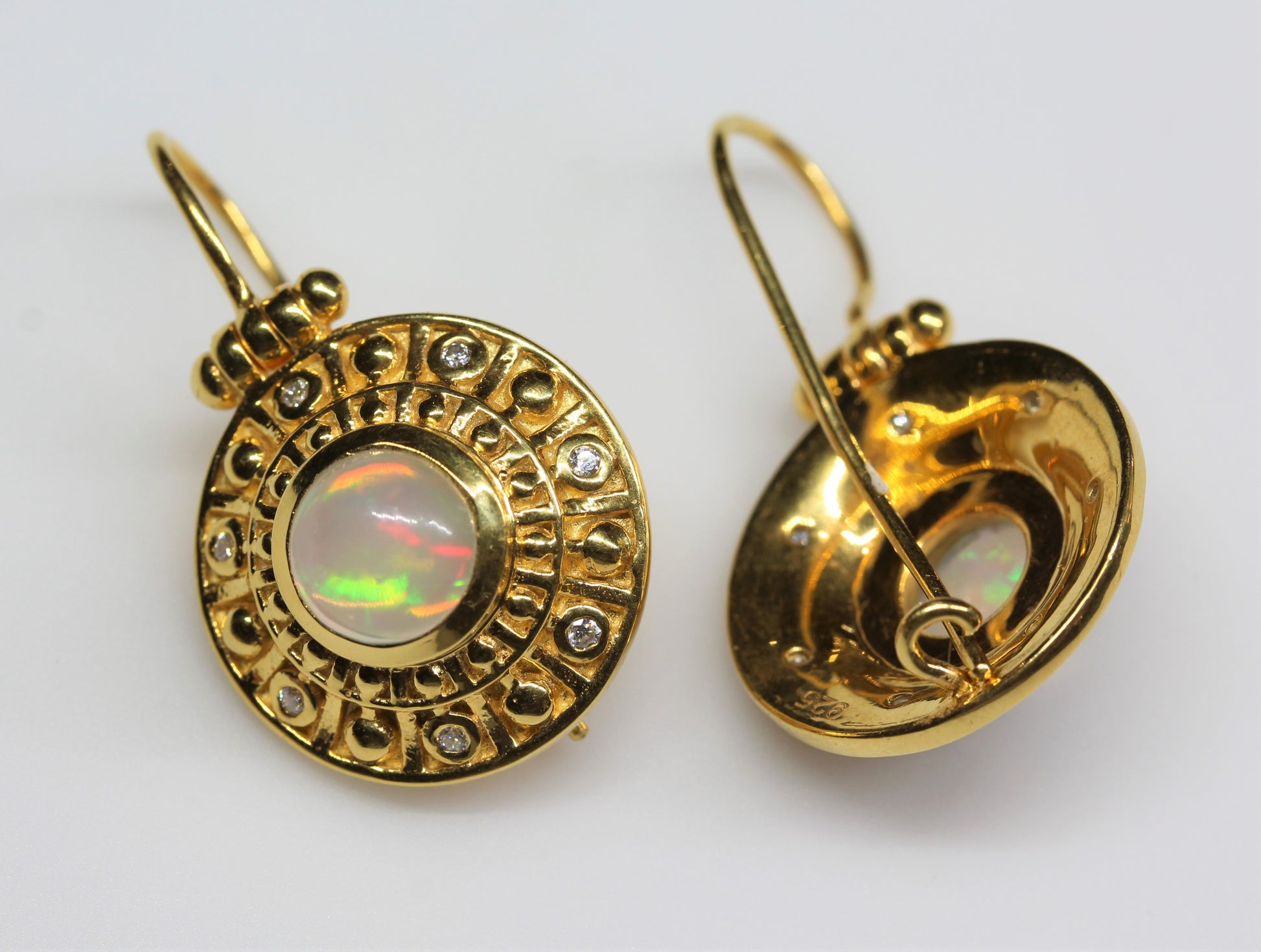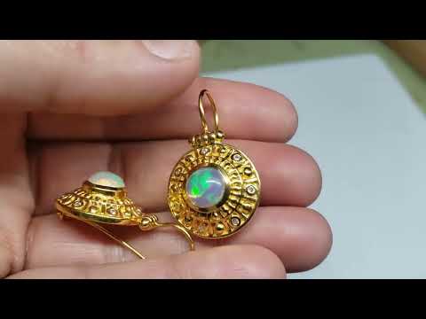 A pair of 24k Gold plated earrings set with a 8mm round opal gemstone, and white moissanite accent stones.