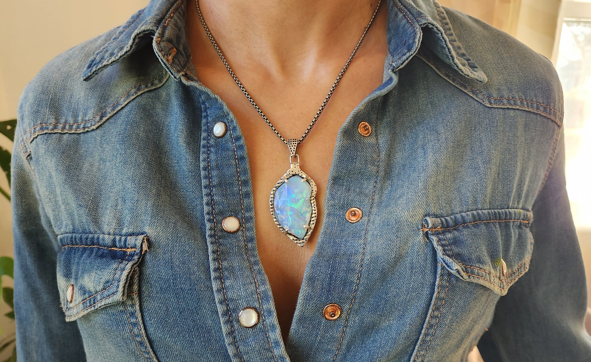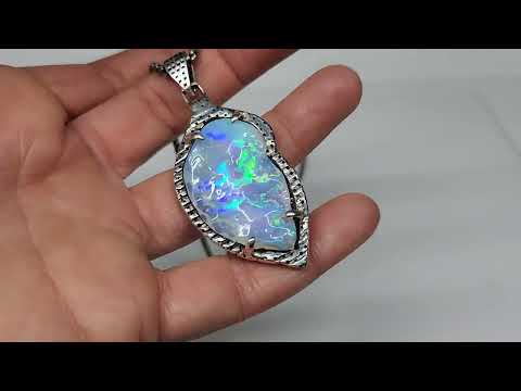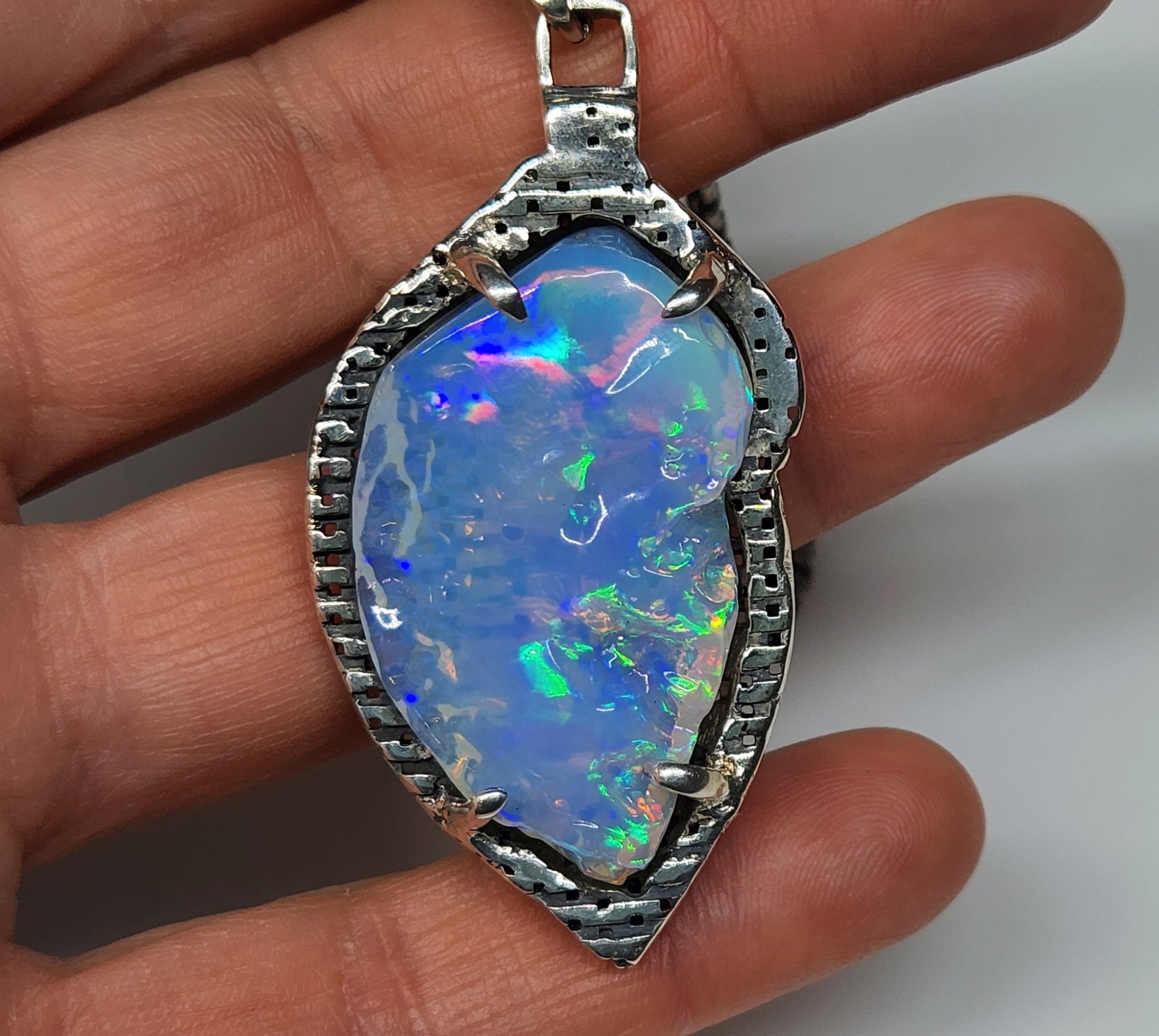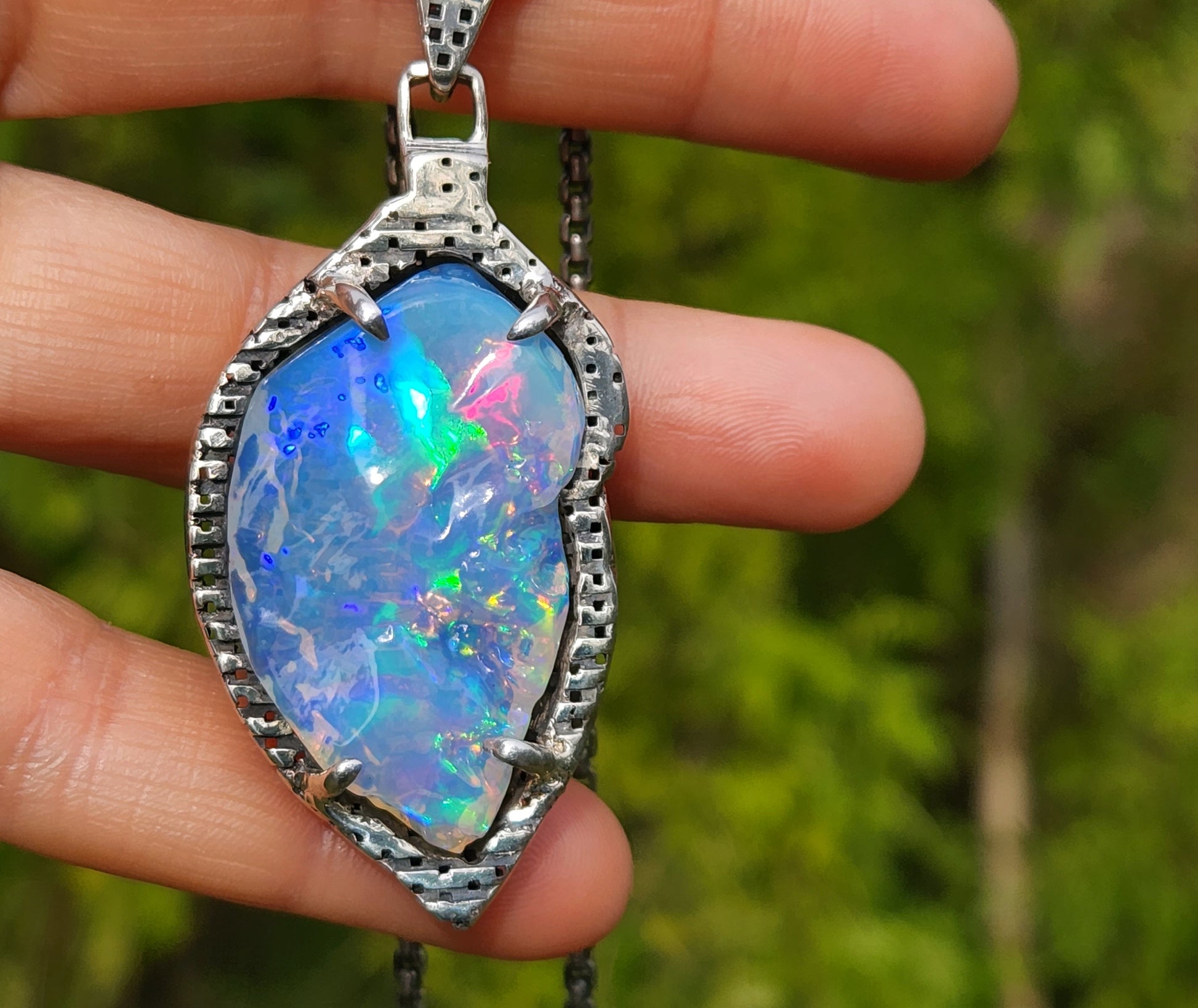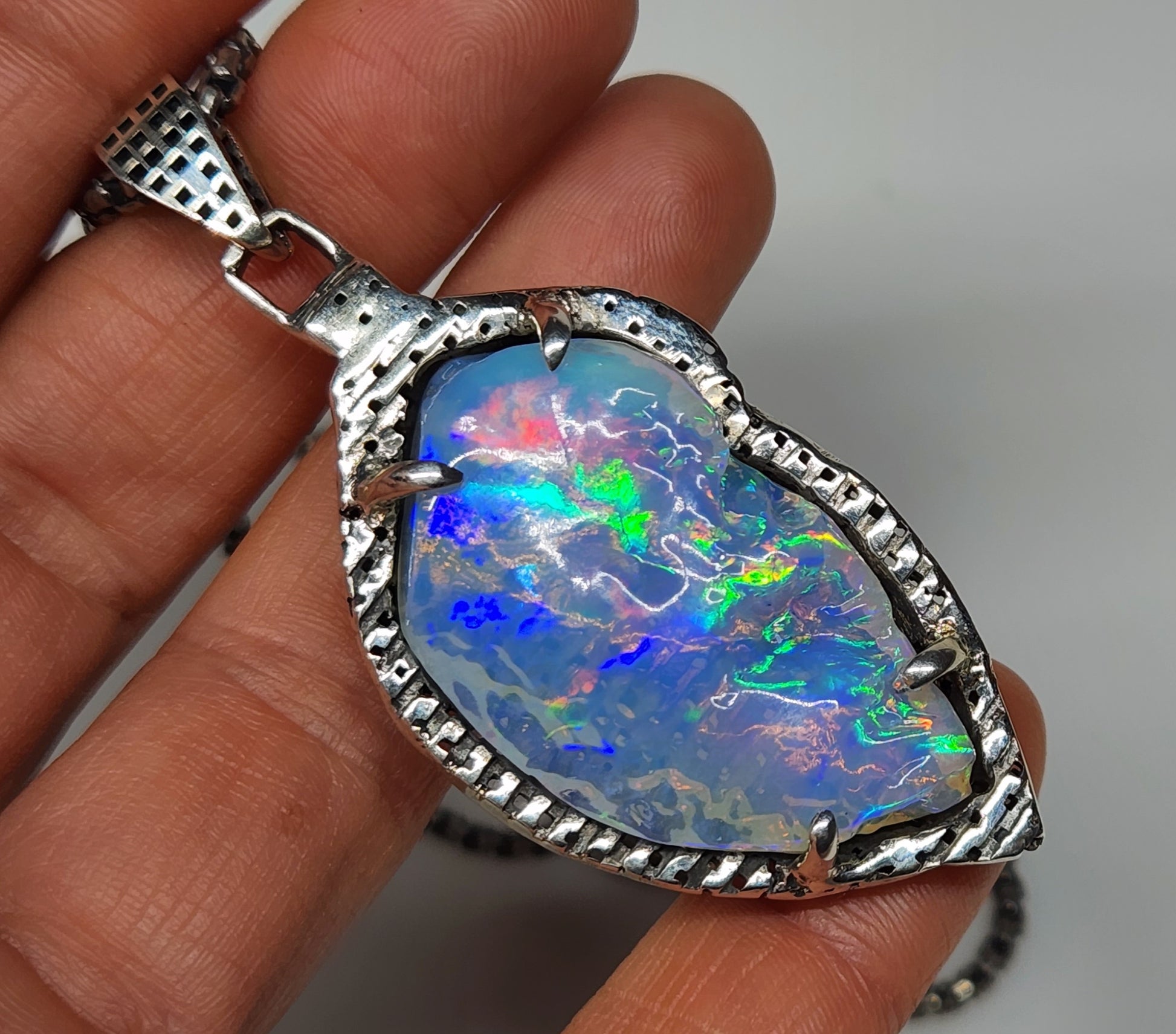 A colorful Natural blue opal with flashes of blue, green and purple fire colors, set in a sterling silver with a sterling silver chain.