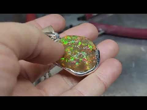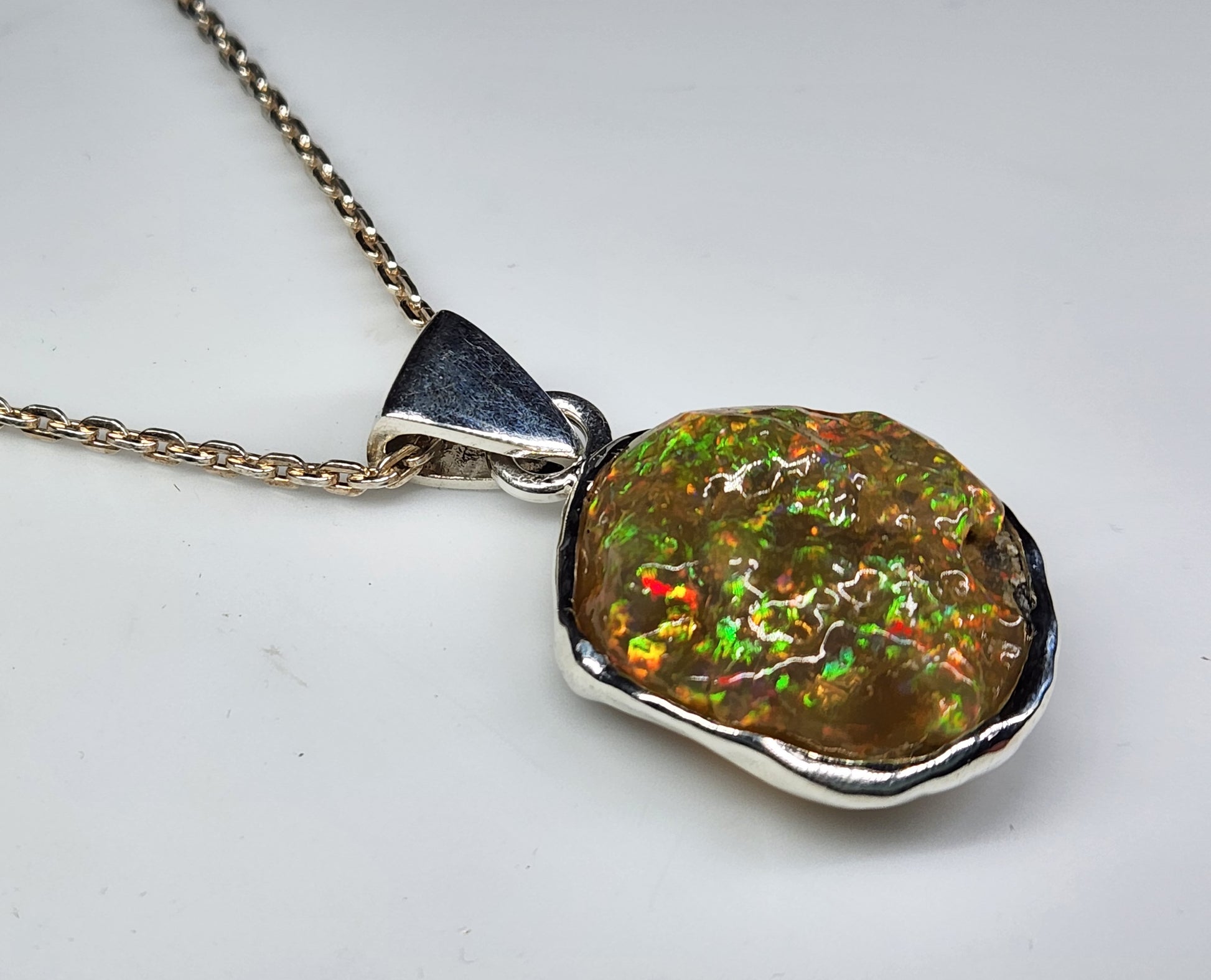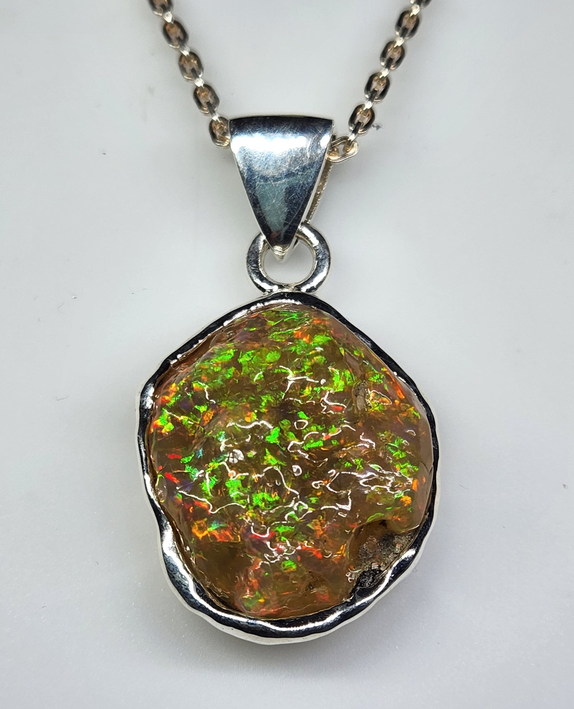 A carved opal specimen with colorful flashes of green and orange fire colors, set in a sterling silver pendant, on a 20inch sterling silver chain.