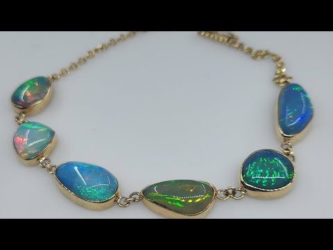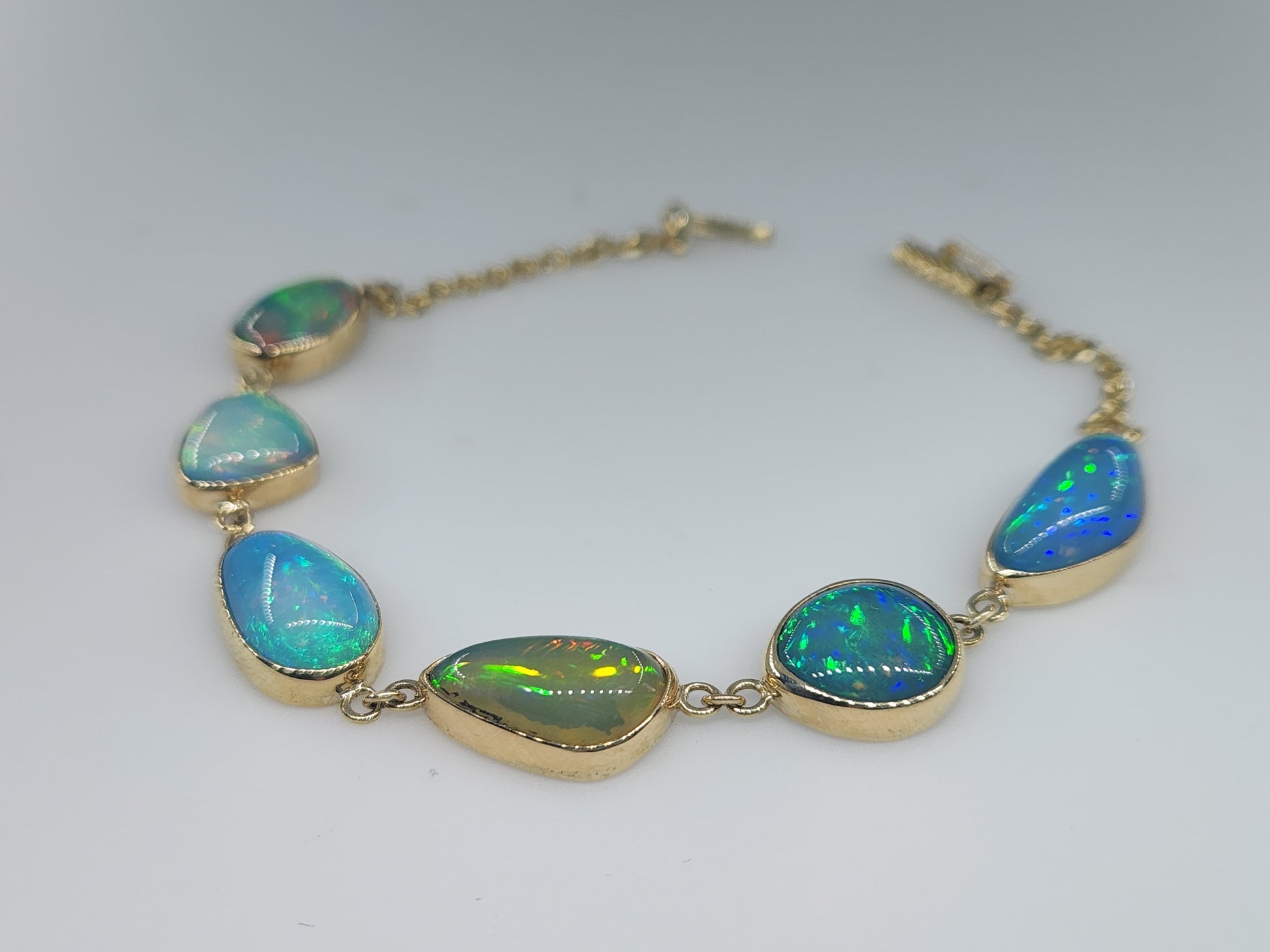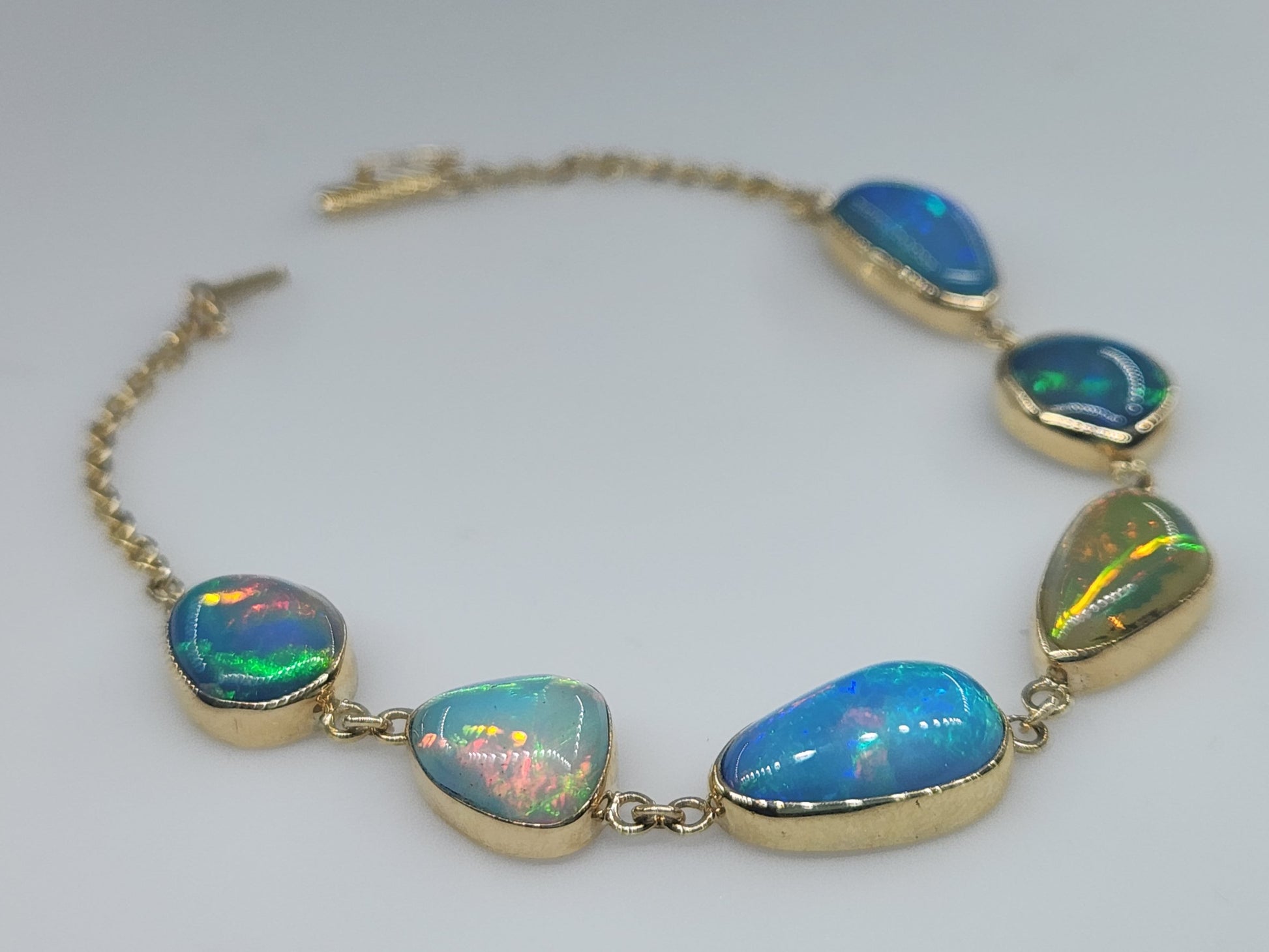 A collection of 6 Ethiopian Opal doublets set in a 14k Yellow Gold link bracelet with a barrel clasp with safety clasp.
