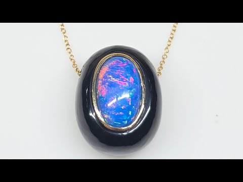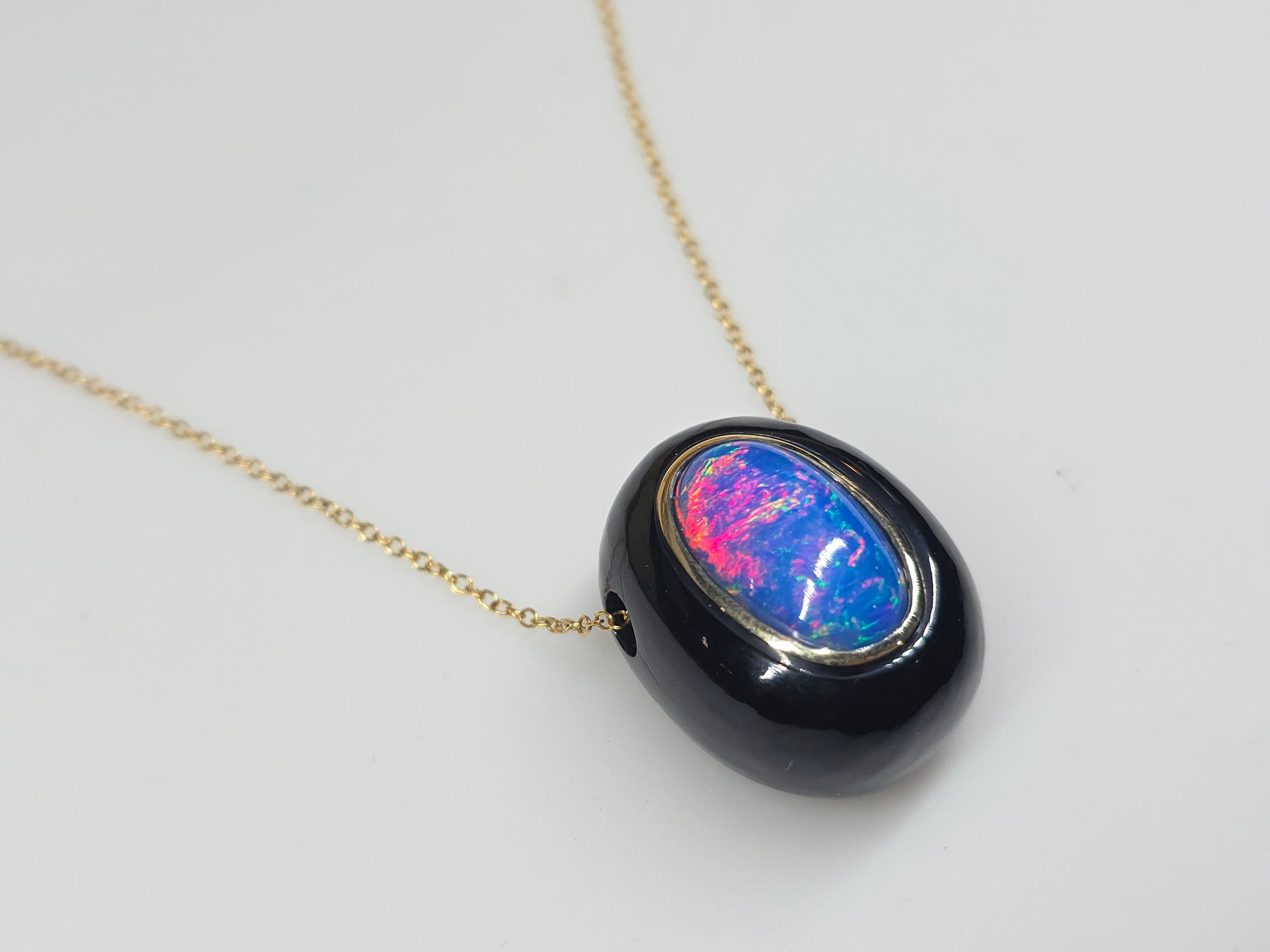 A colorful blue opal with red and green fire colors, set into black onyx with 14k gold bezel.
