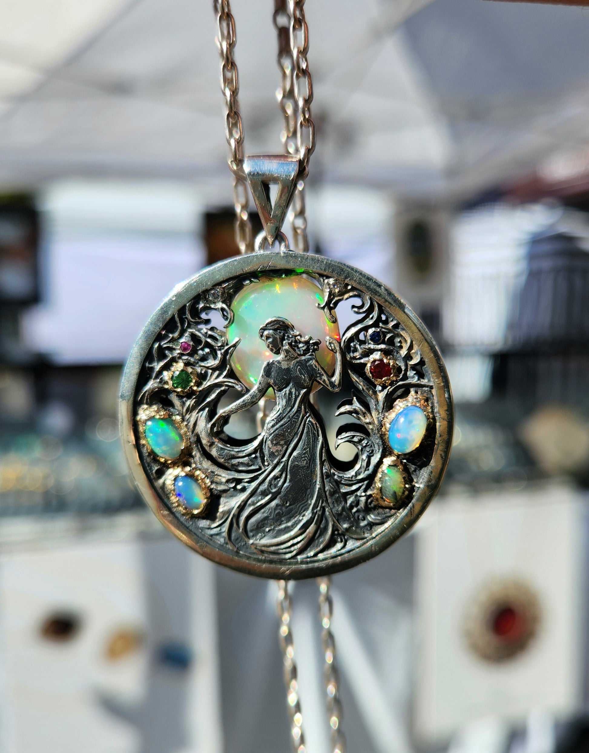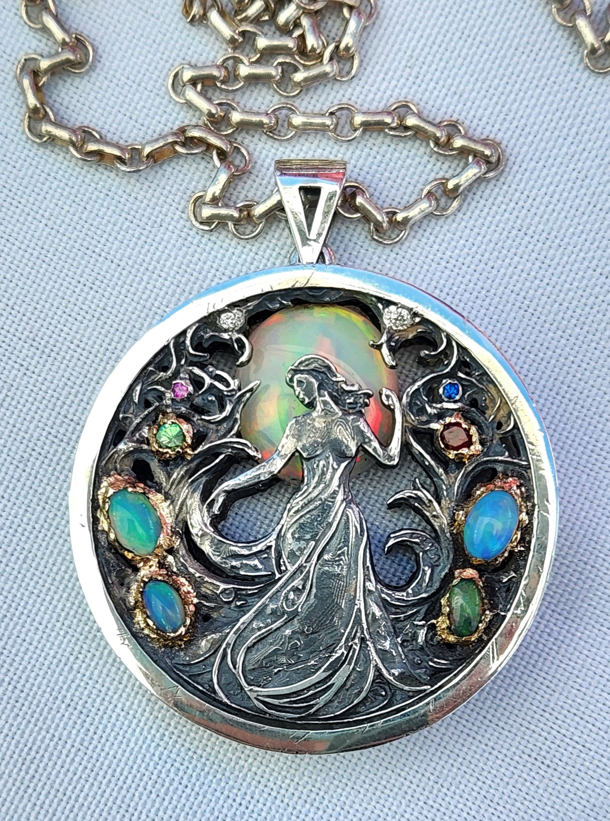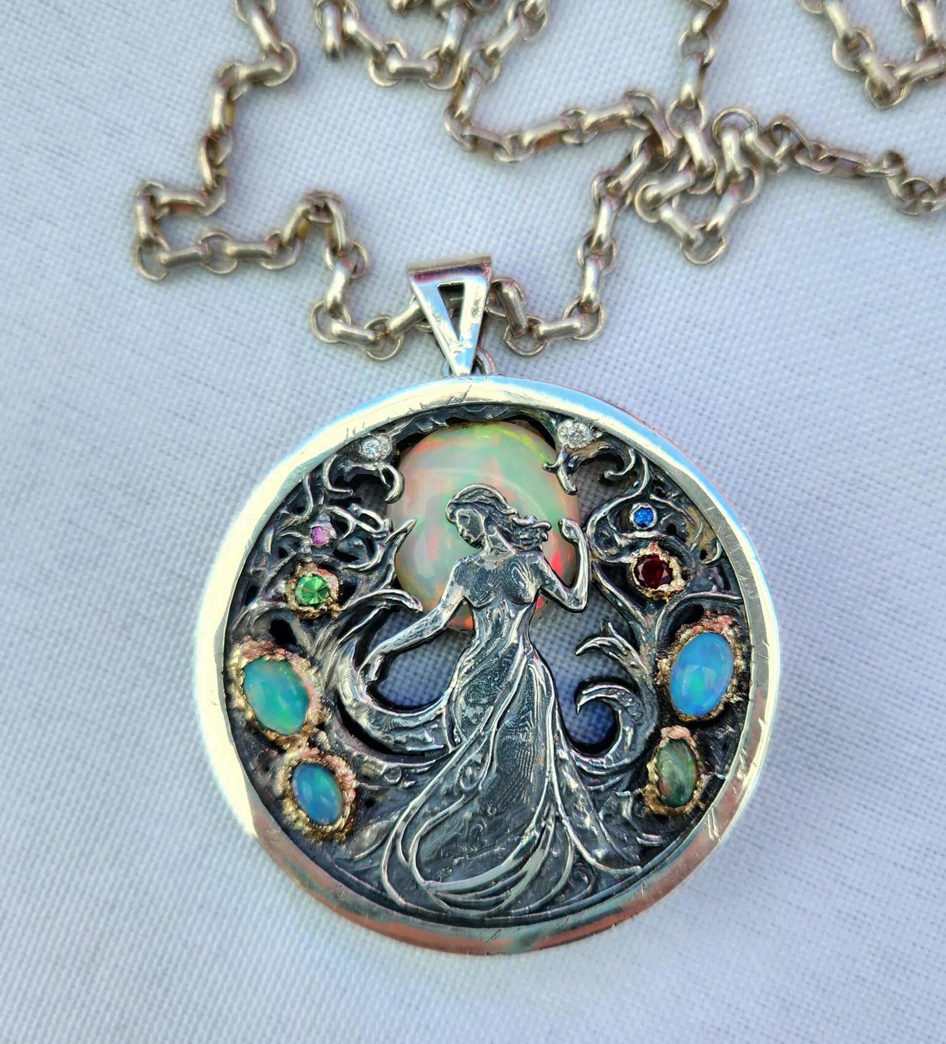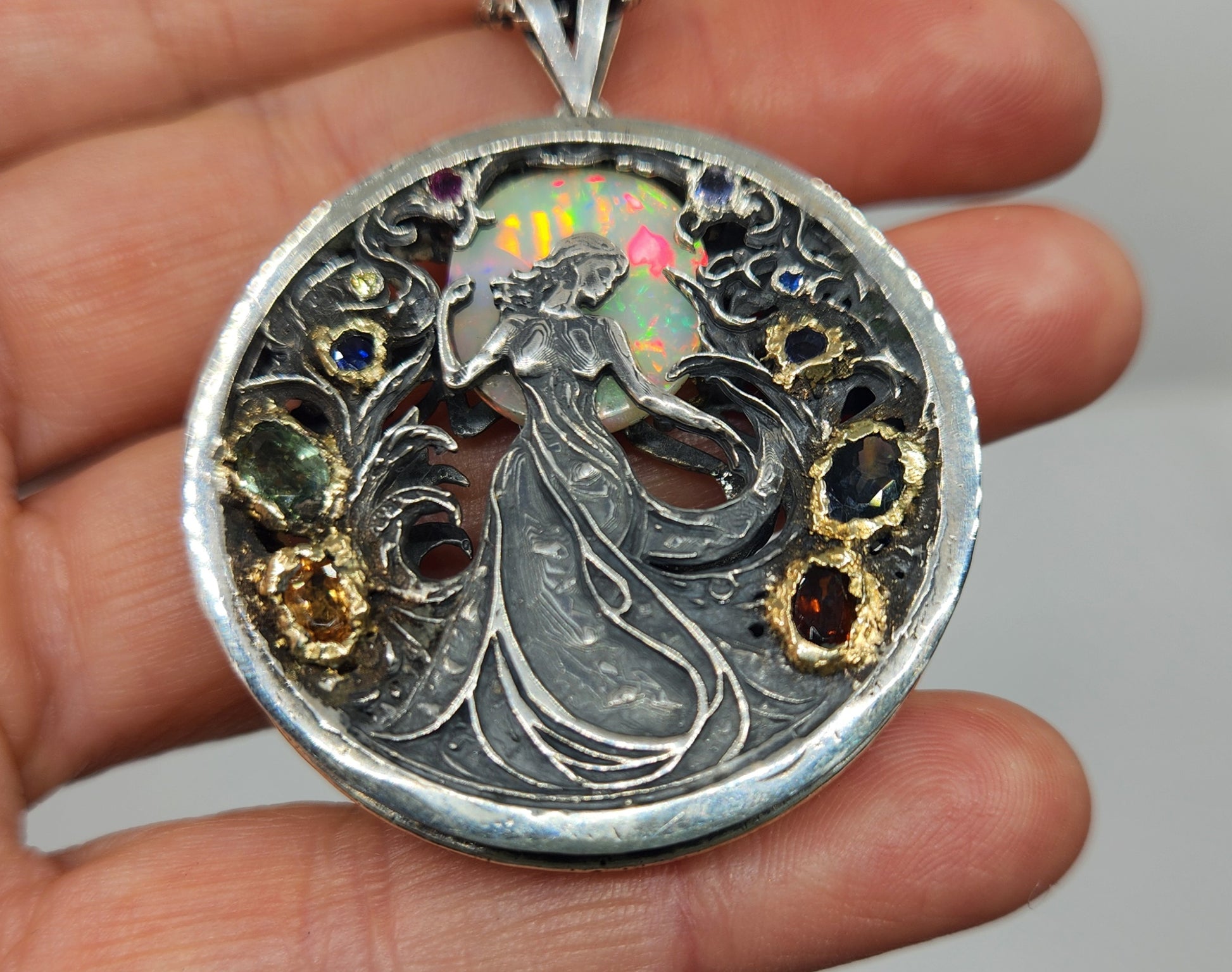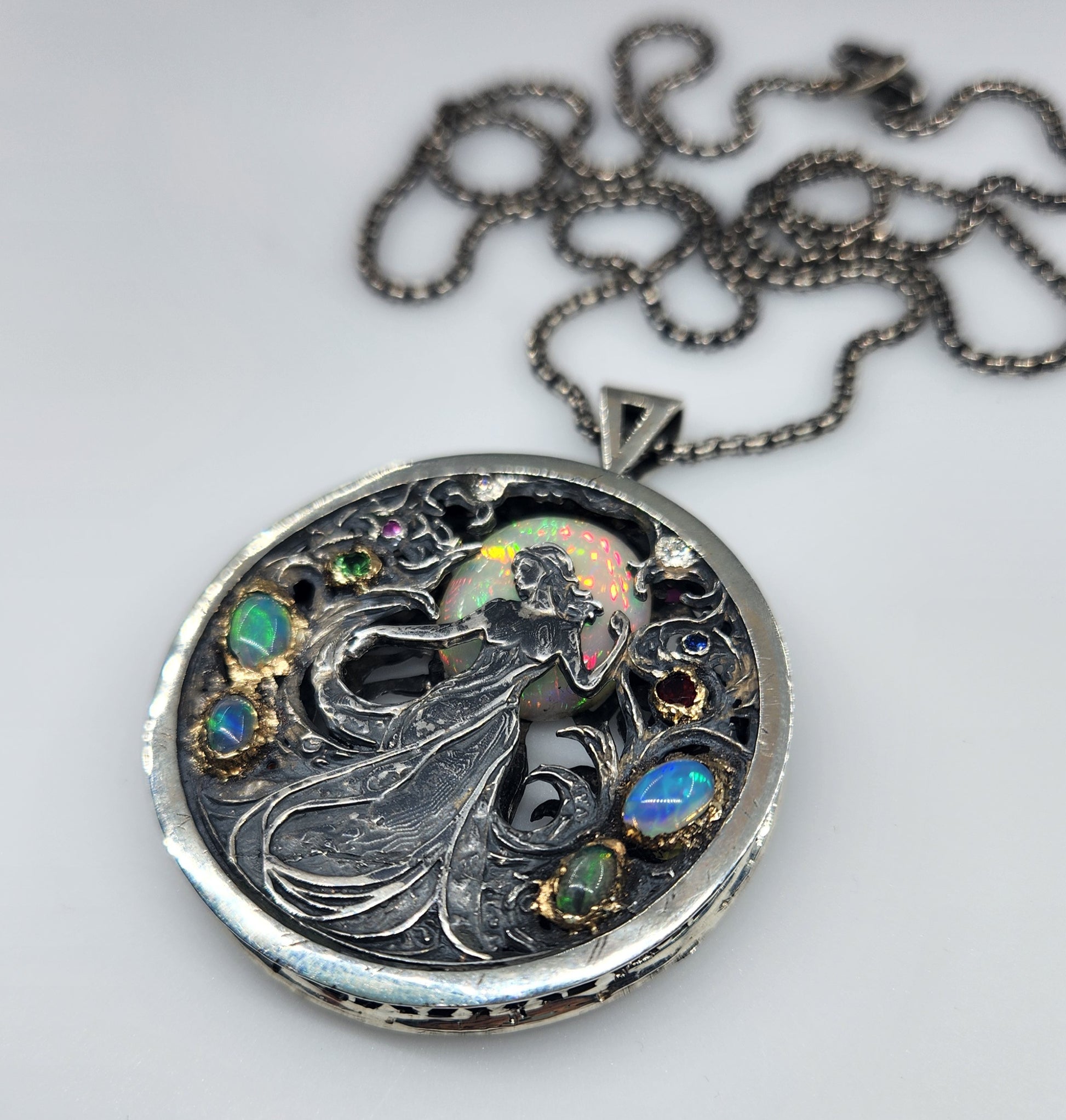 A Sterling Silver medallion pendant with an intricate carving of a lady surrounded by color gemstones. The pendant is two sided, with the center opal visible from both sides of the medallion. Watch the video for a closer look at the pendant details.