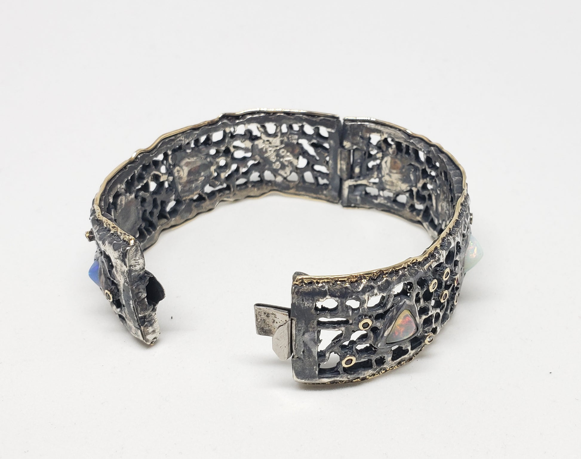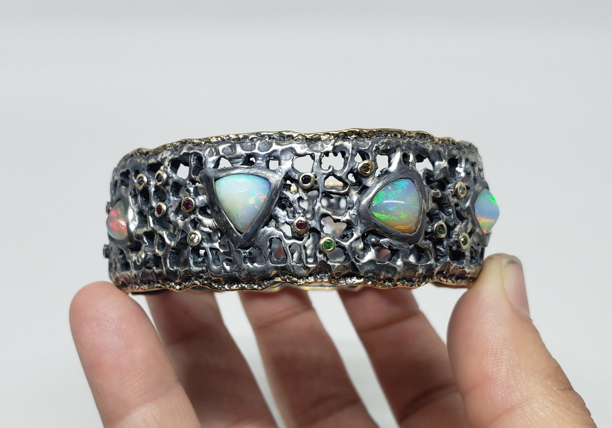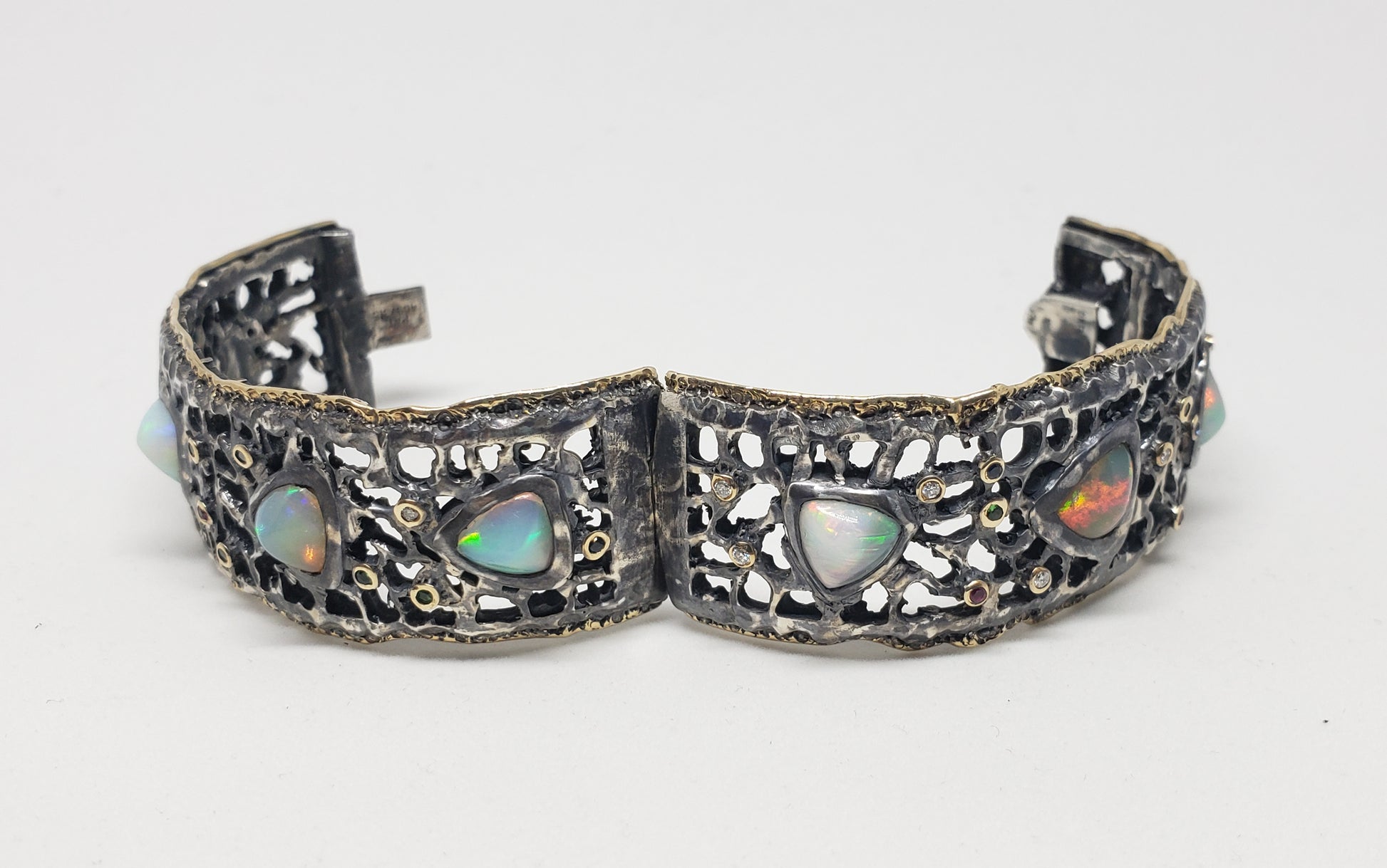 This Sterling Silver & 14k Gold cuff bracelet has 8 colorful opals, and a collection of various accent stones which include: diamonds, ruby, sapphire, and green garnet.