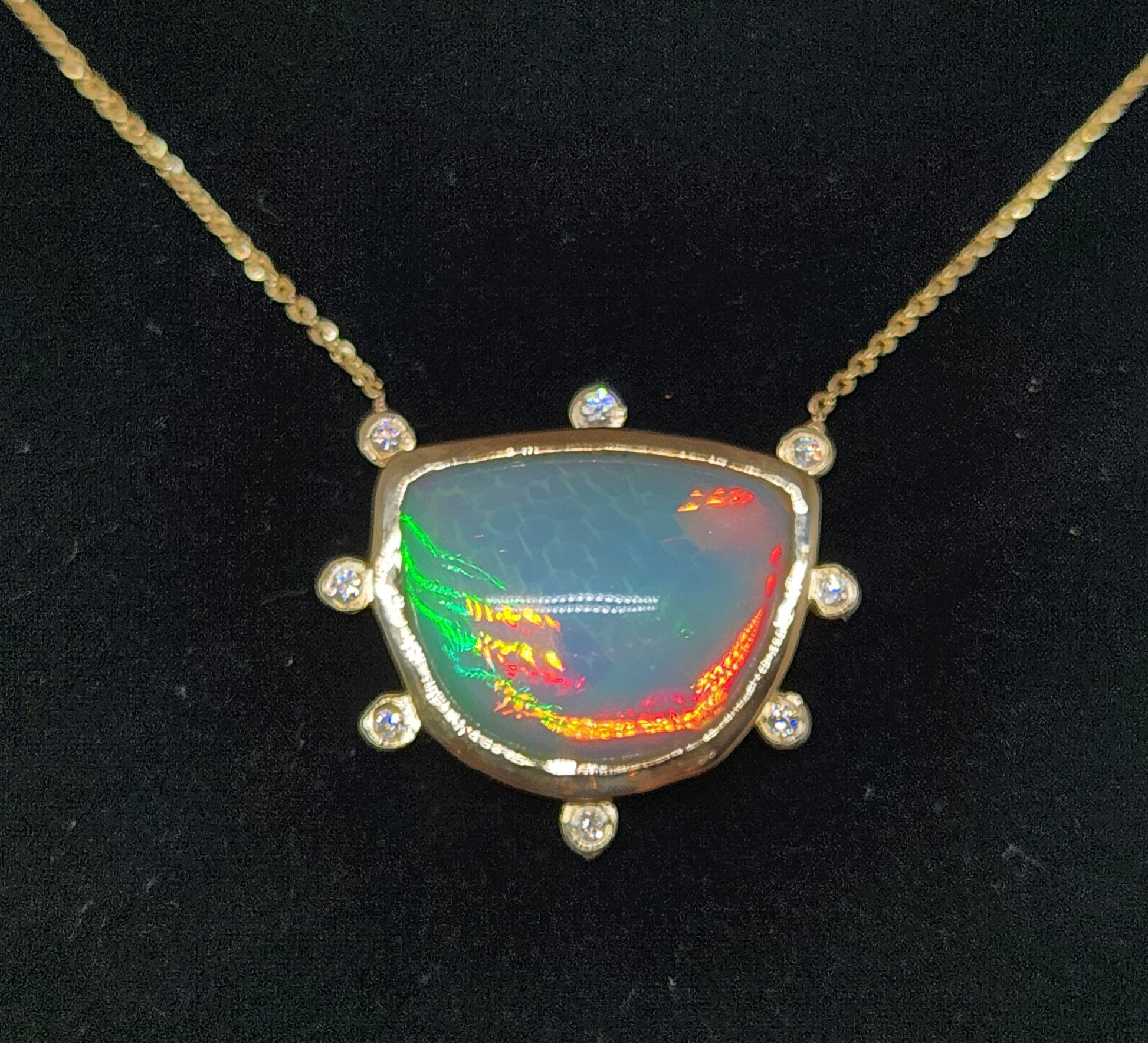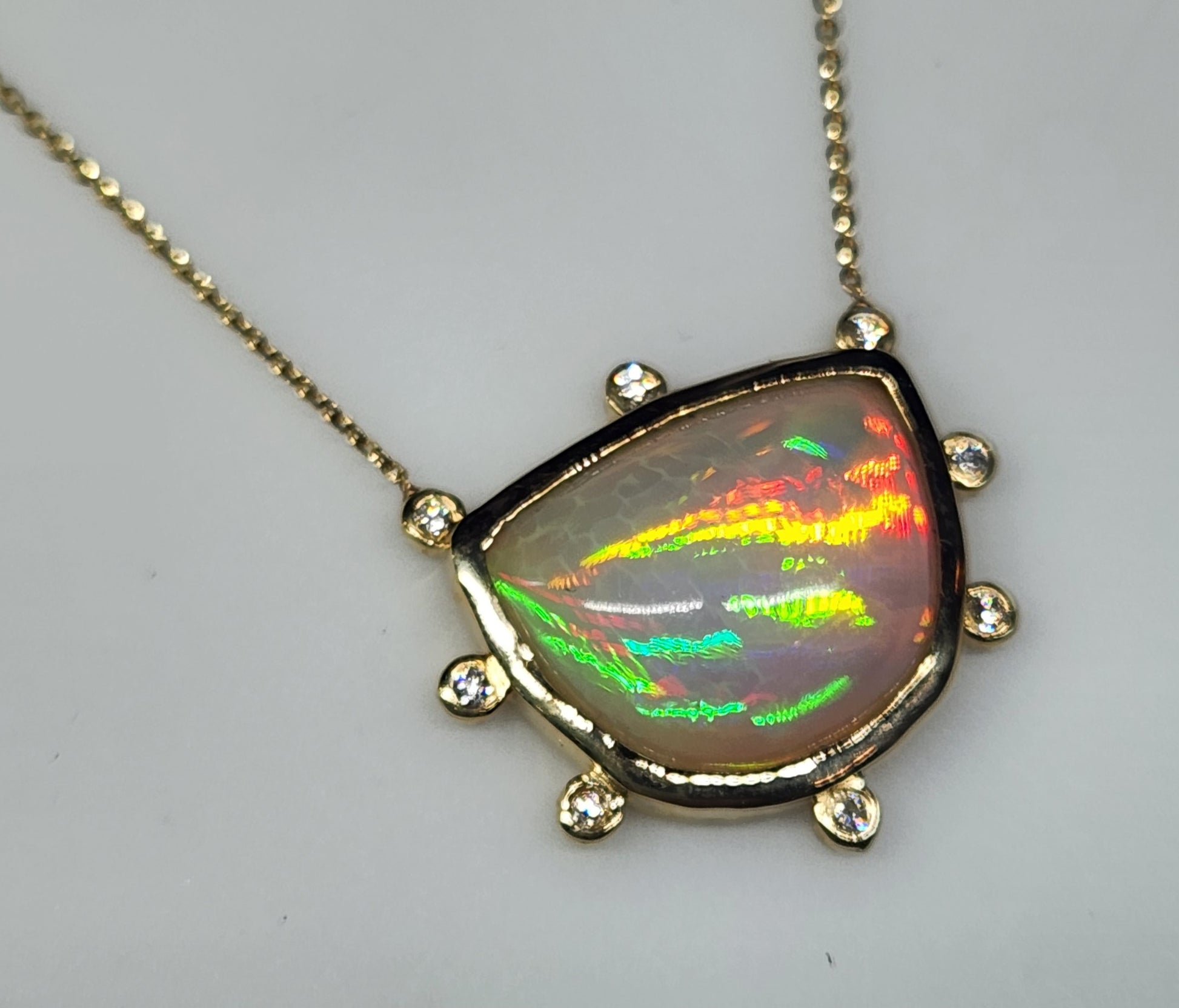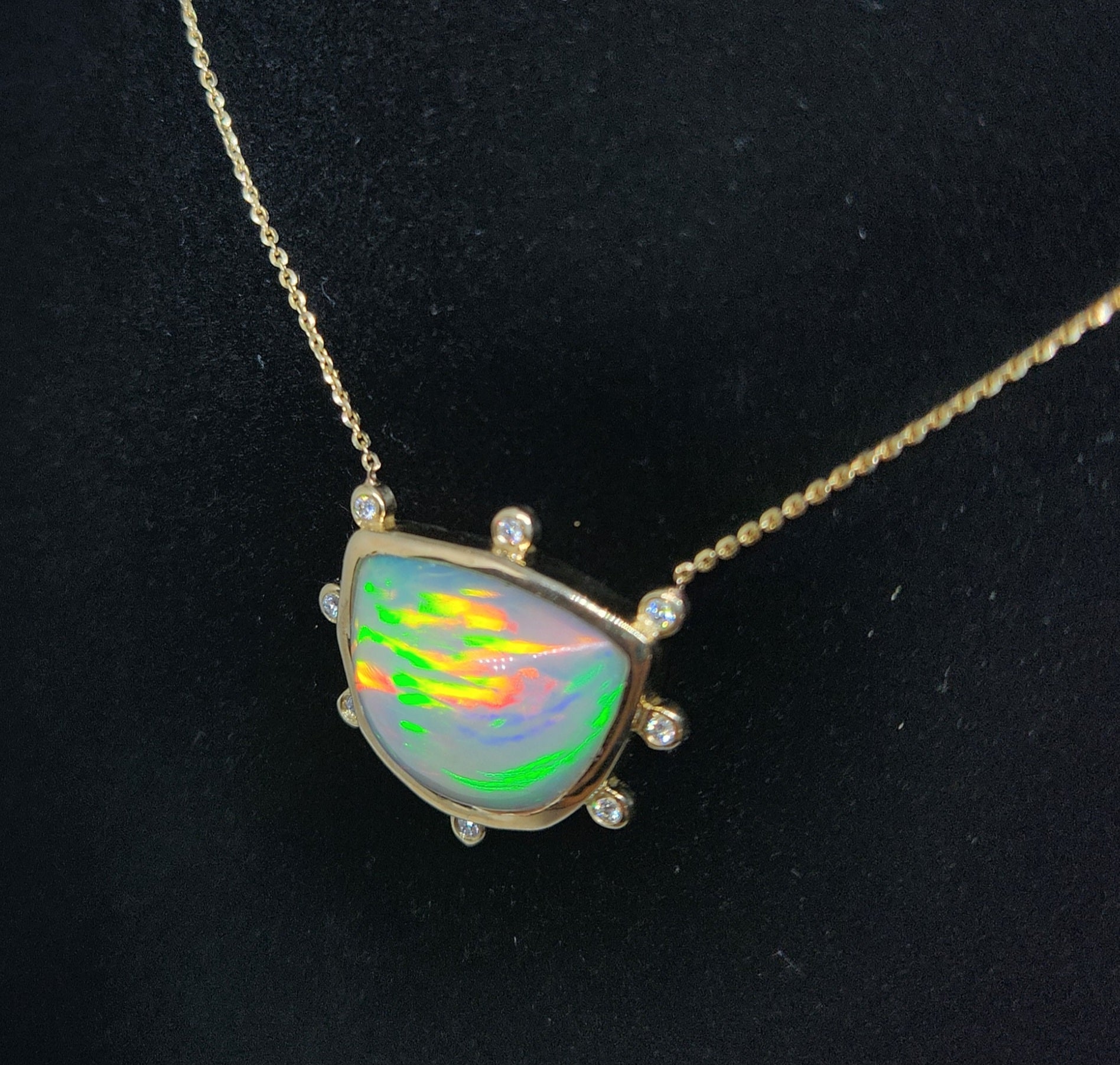 A bright and colorful natural Opal, surrounded by a eight CVD diamonds, set in 14k Gold on a split chain.