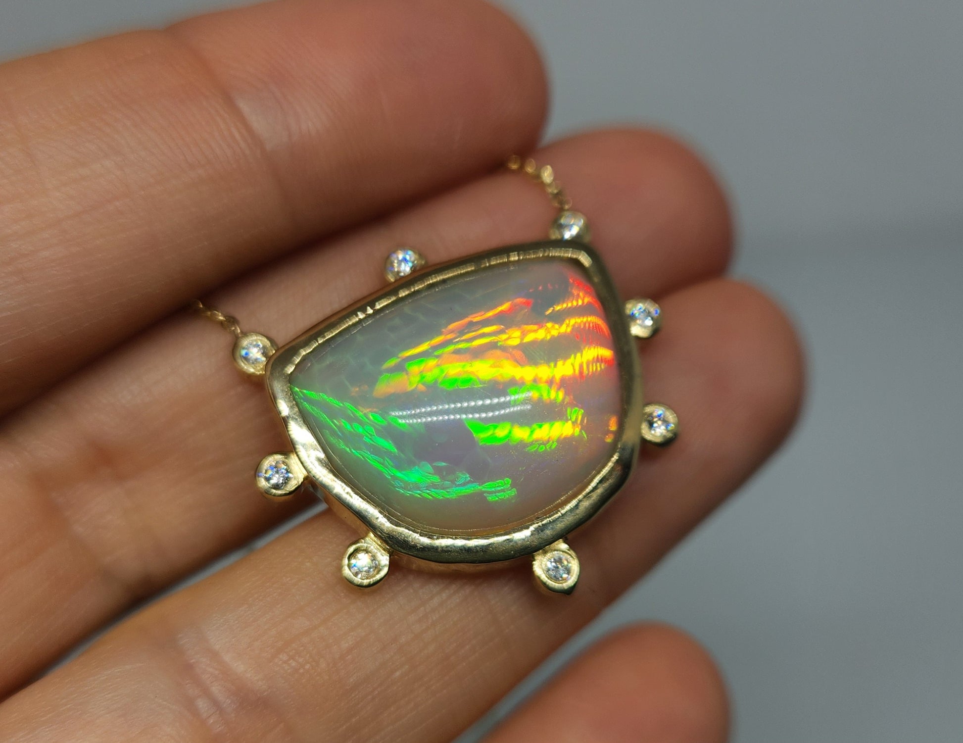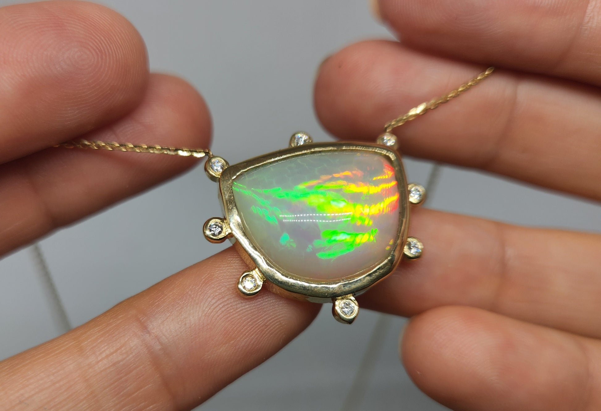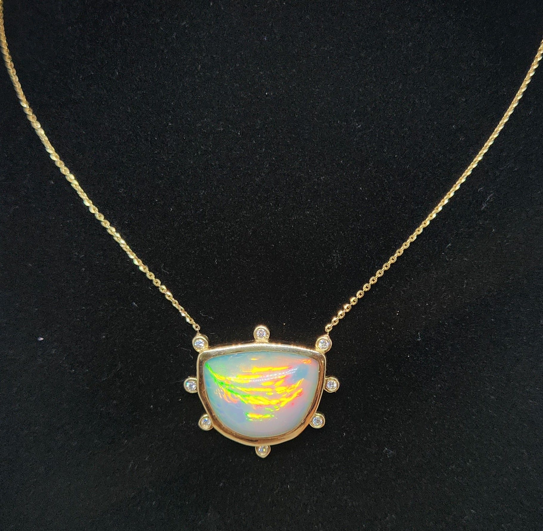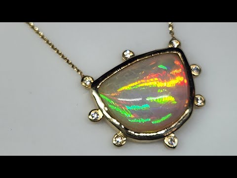 A bright and colorful natural Opal, surrounded by a eight CVD diamonds, set in 14k Gold on a split chain.