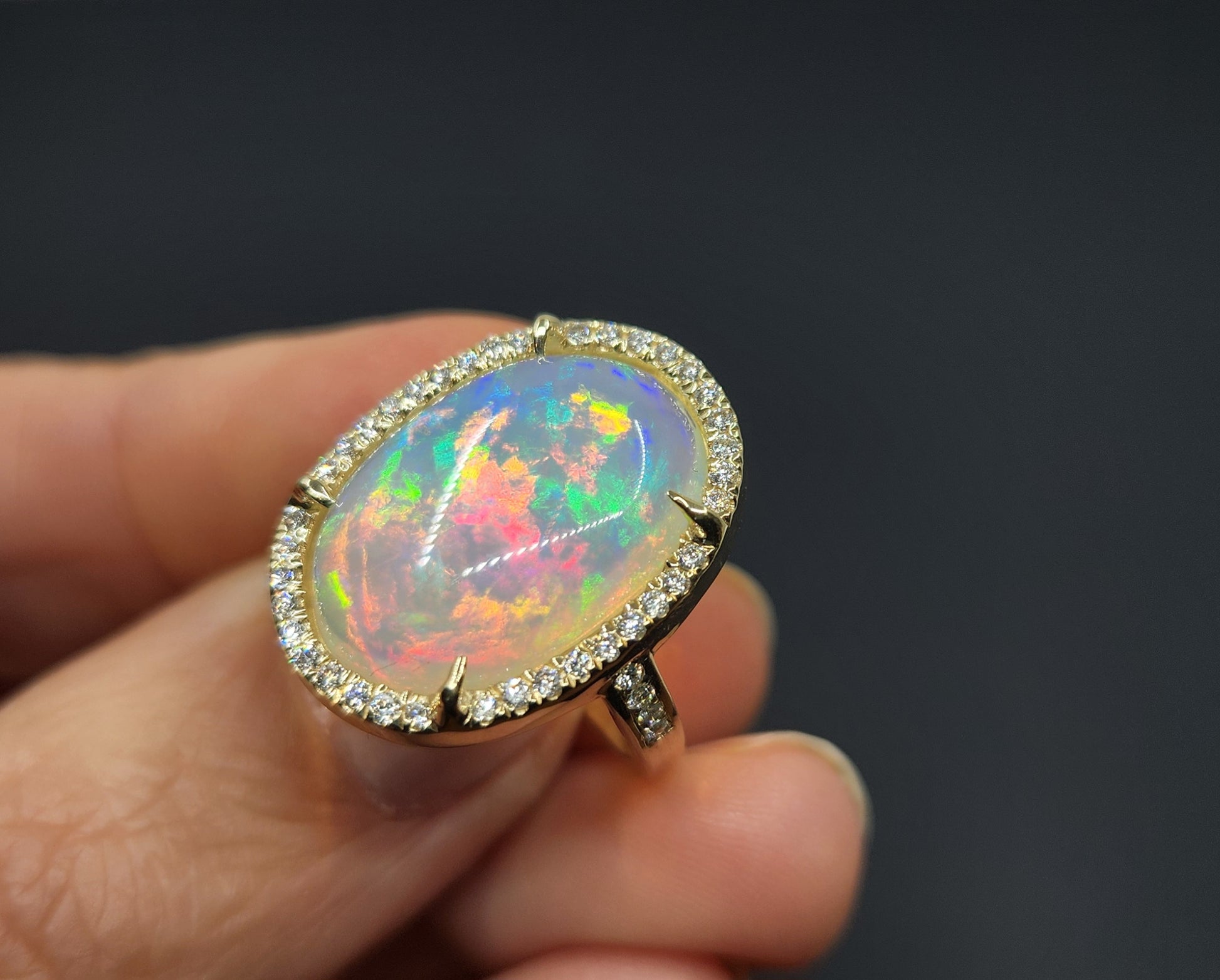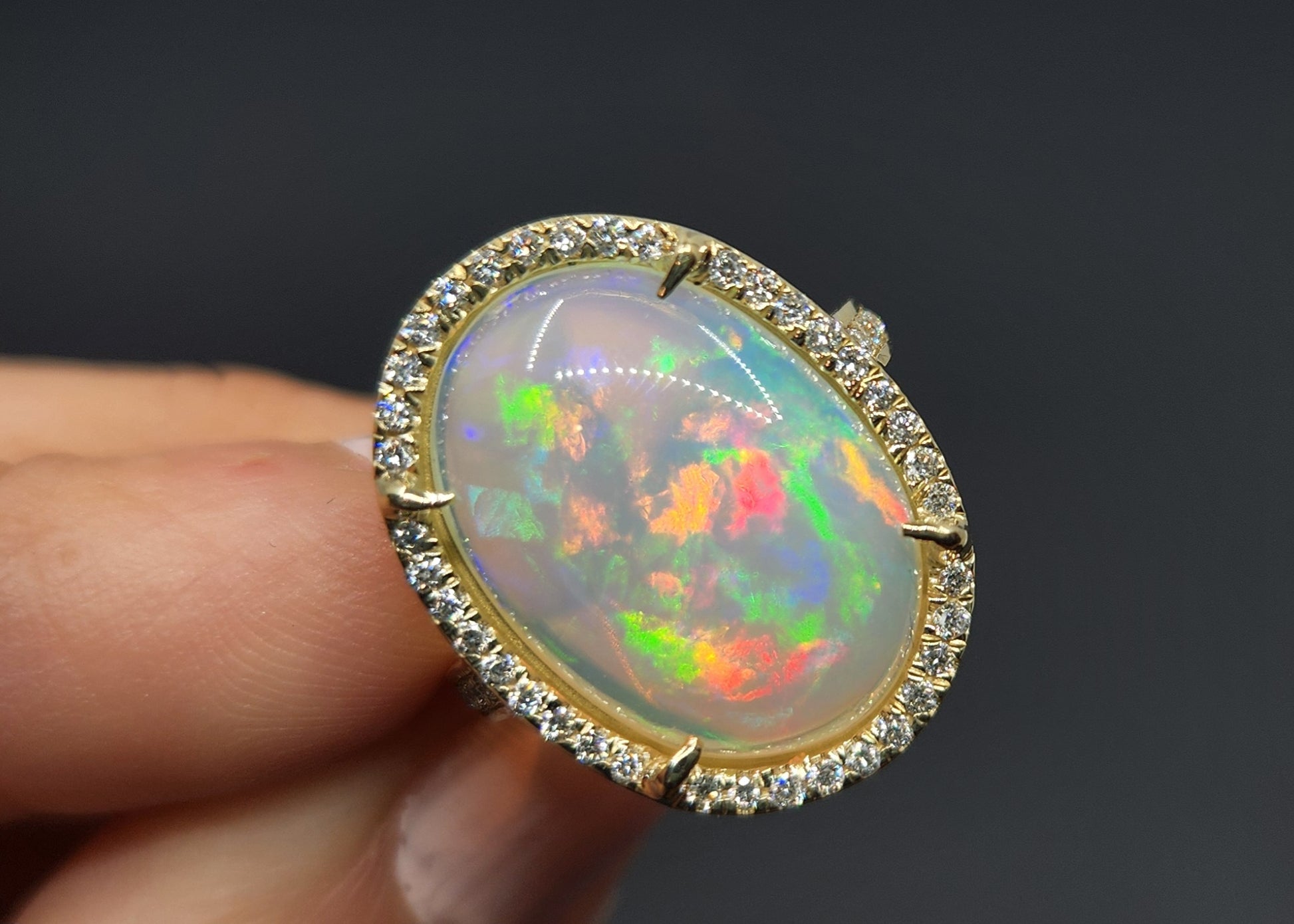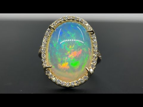 A colorful opal with bright flashes of color, surrounded diamond accent stones set in a 14k solid gold band.