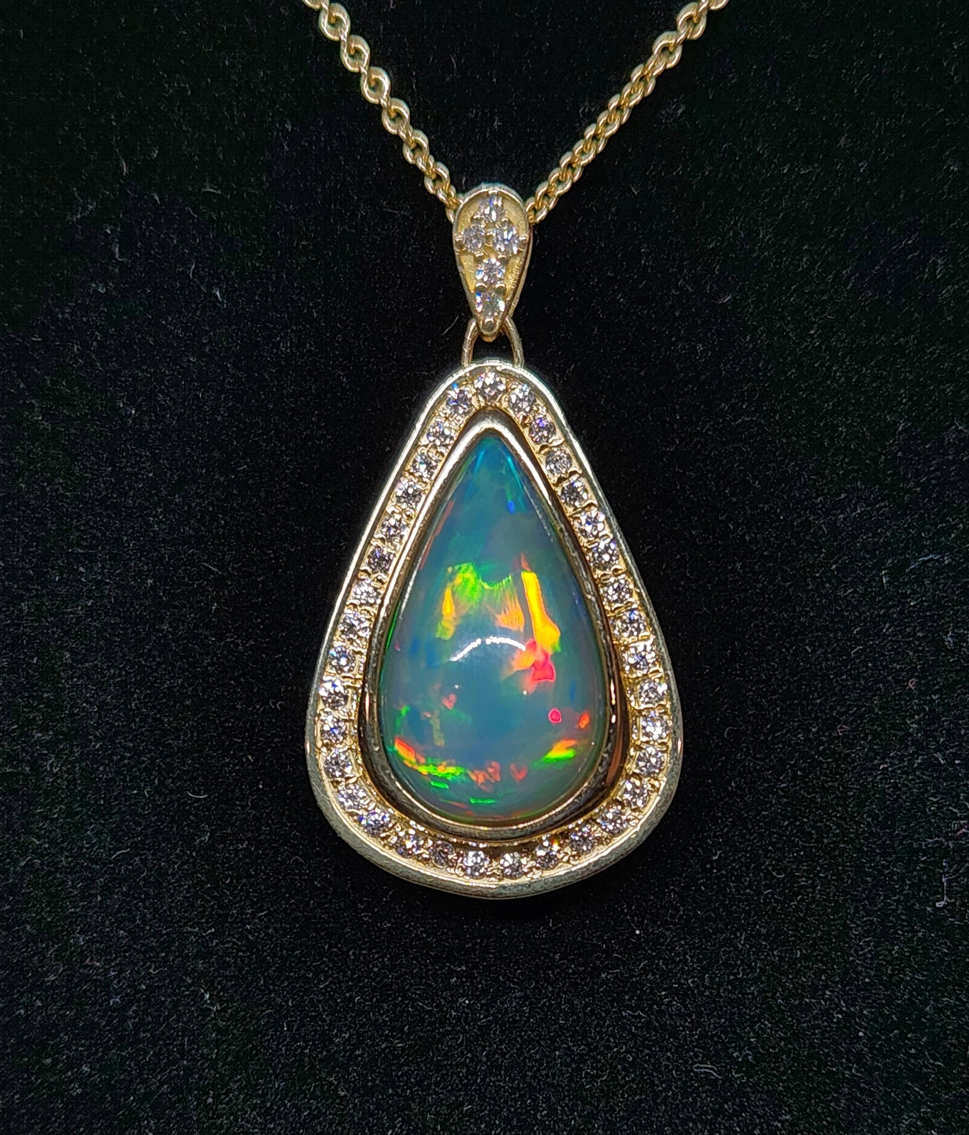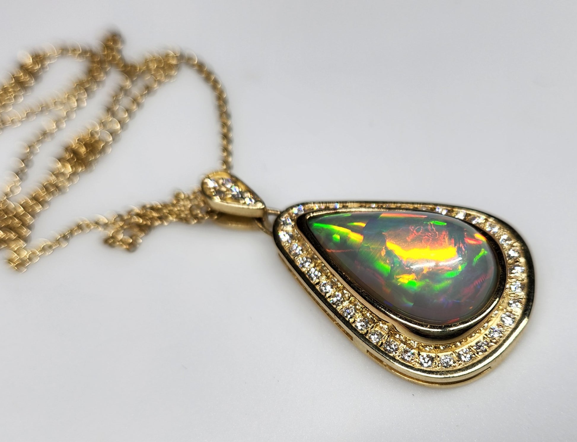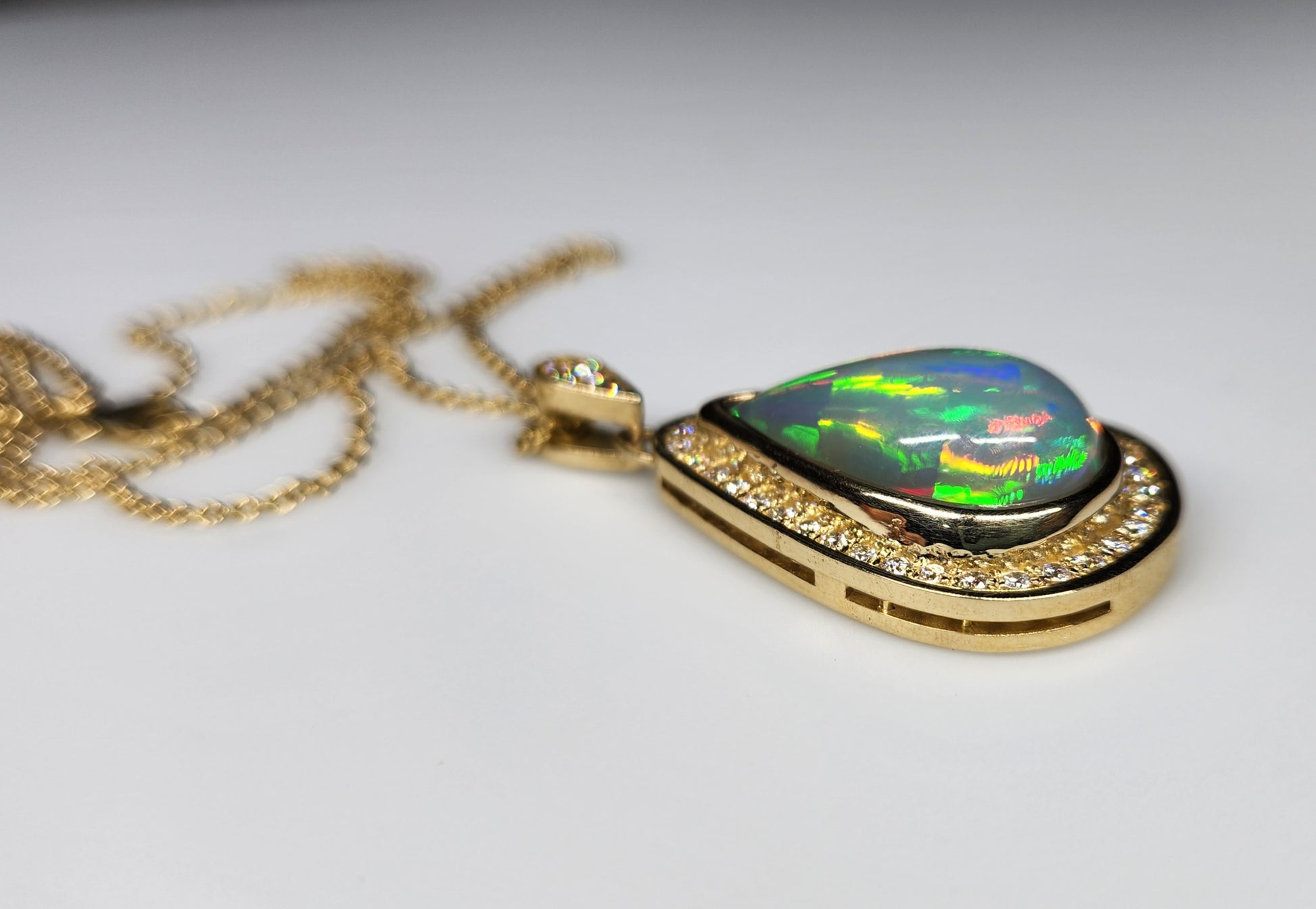 A bright and colorful natural Opal, surrounded by white diamonds, set in 14k Gold.