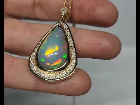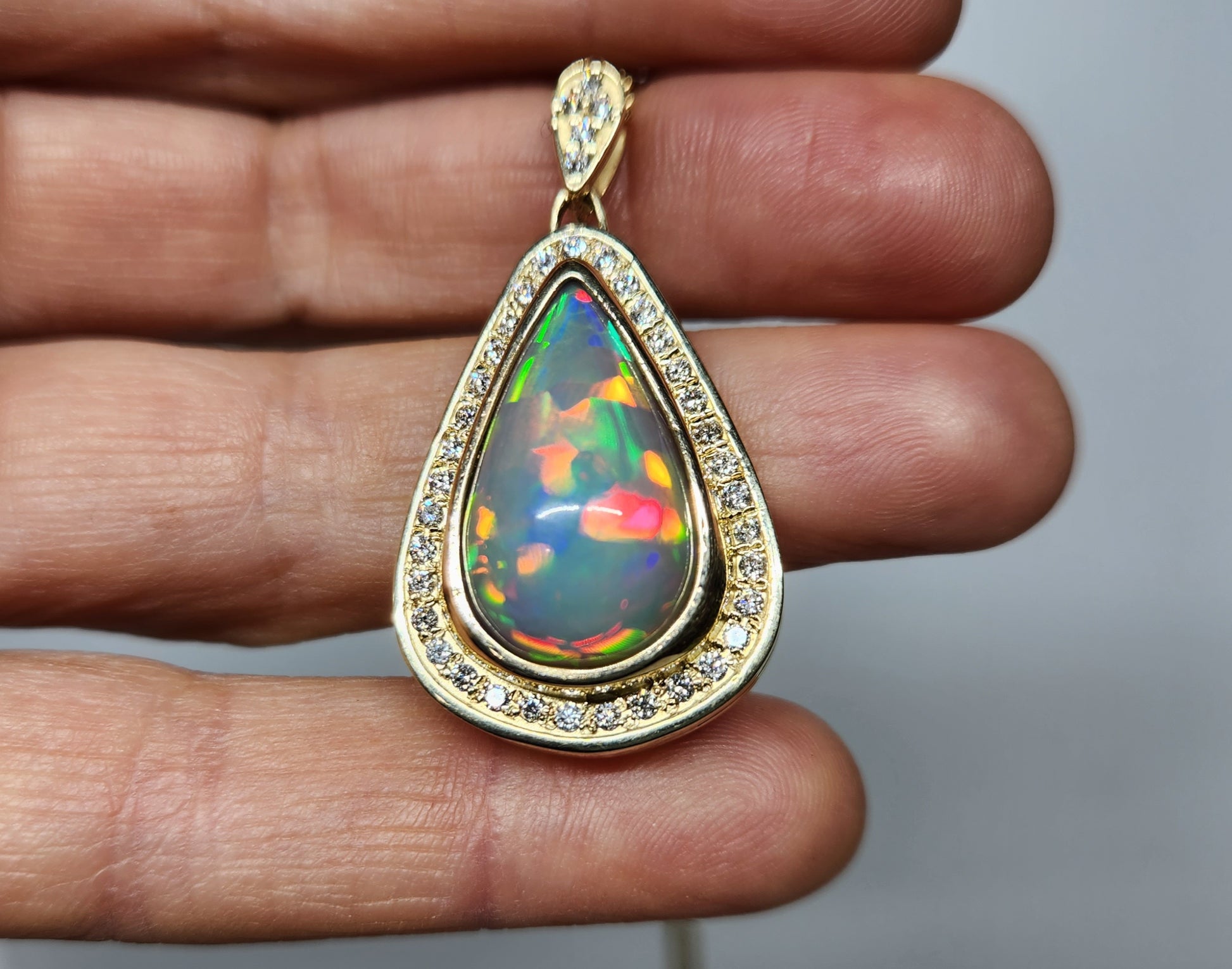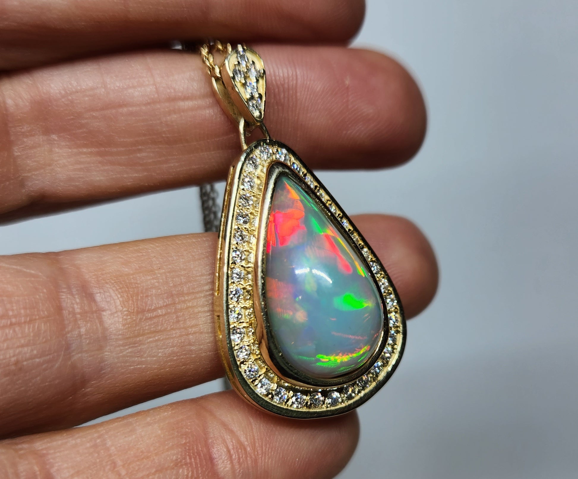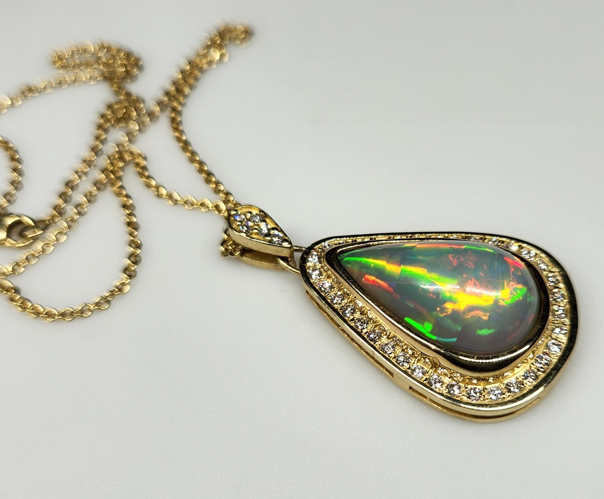 A bright and colorful natural Opal, surrounded by white diamonds, set in 14k Gold.