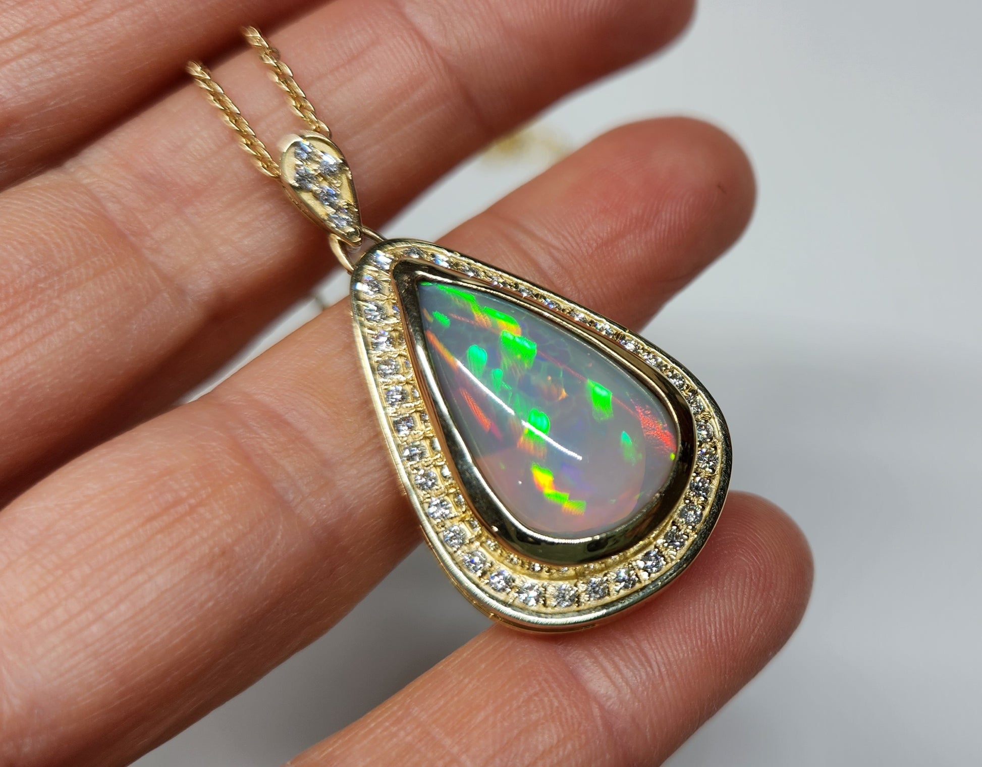 A bright and colorful natural Opal, surrounded by white diamonds, set in 14k Gold.