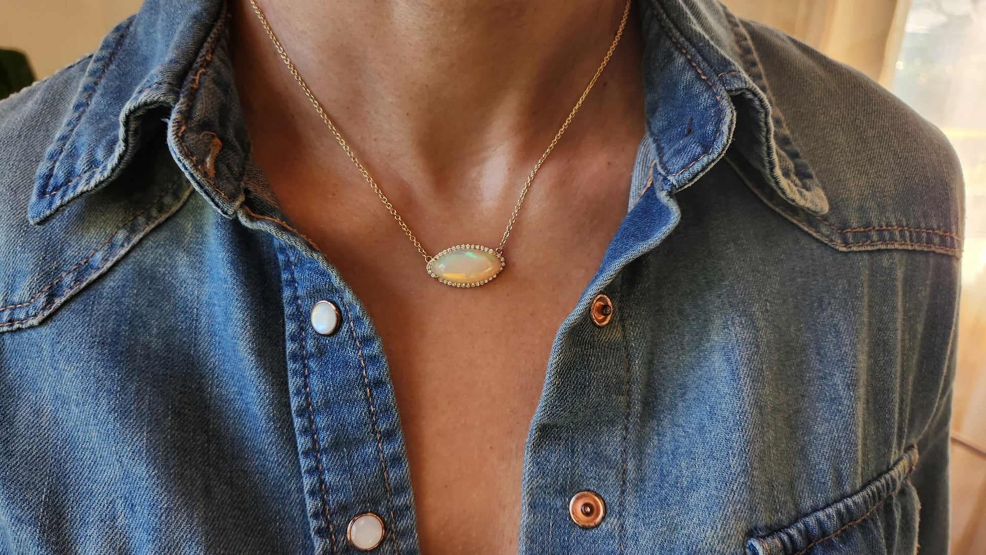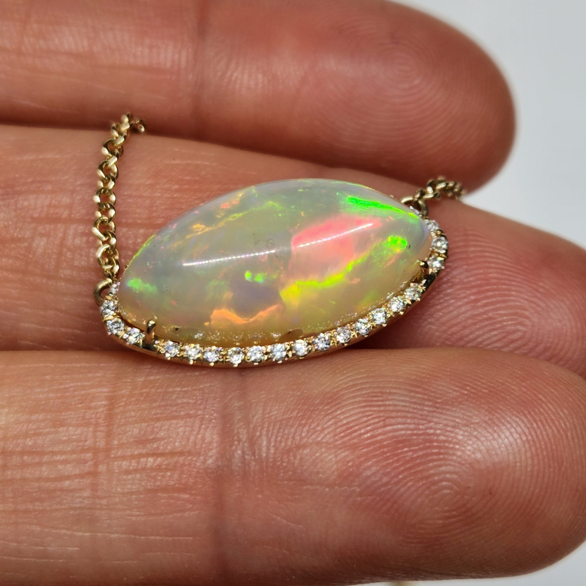 Opal & Diamond Pendant - 14k Gold Split Chain Necklace #365