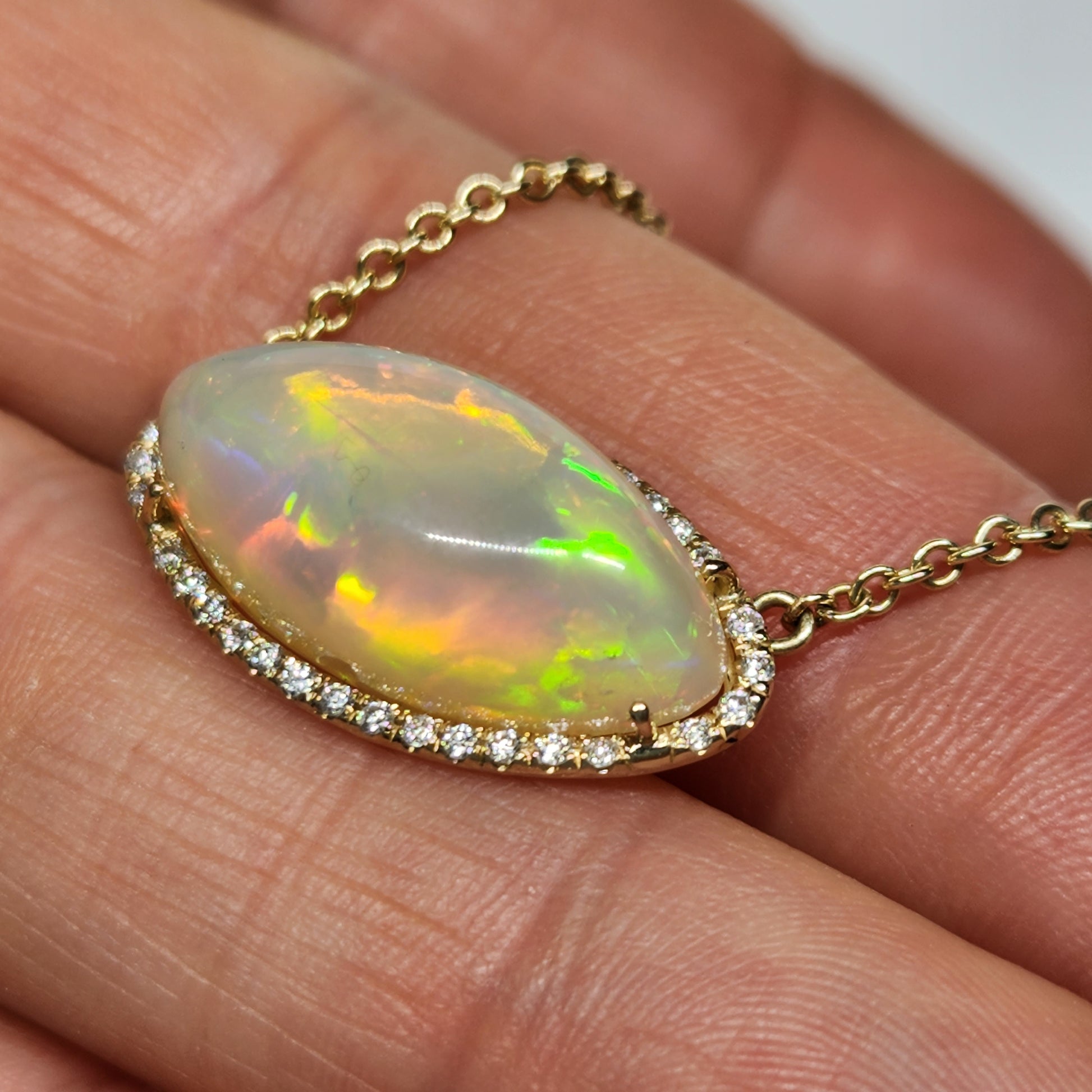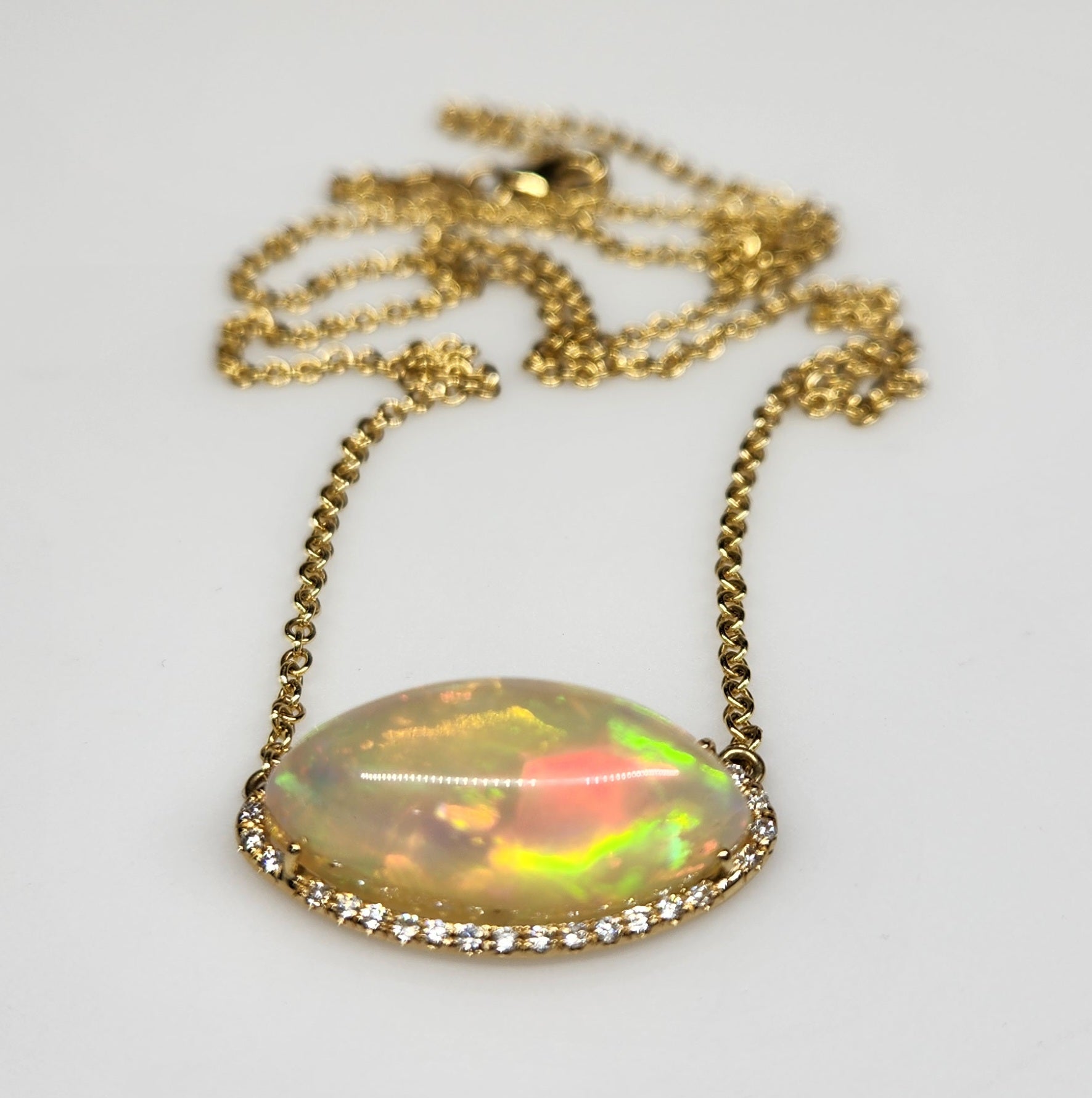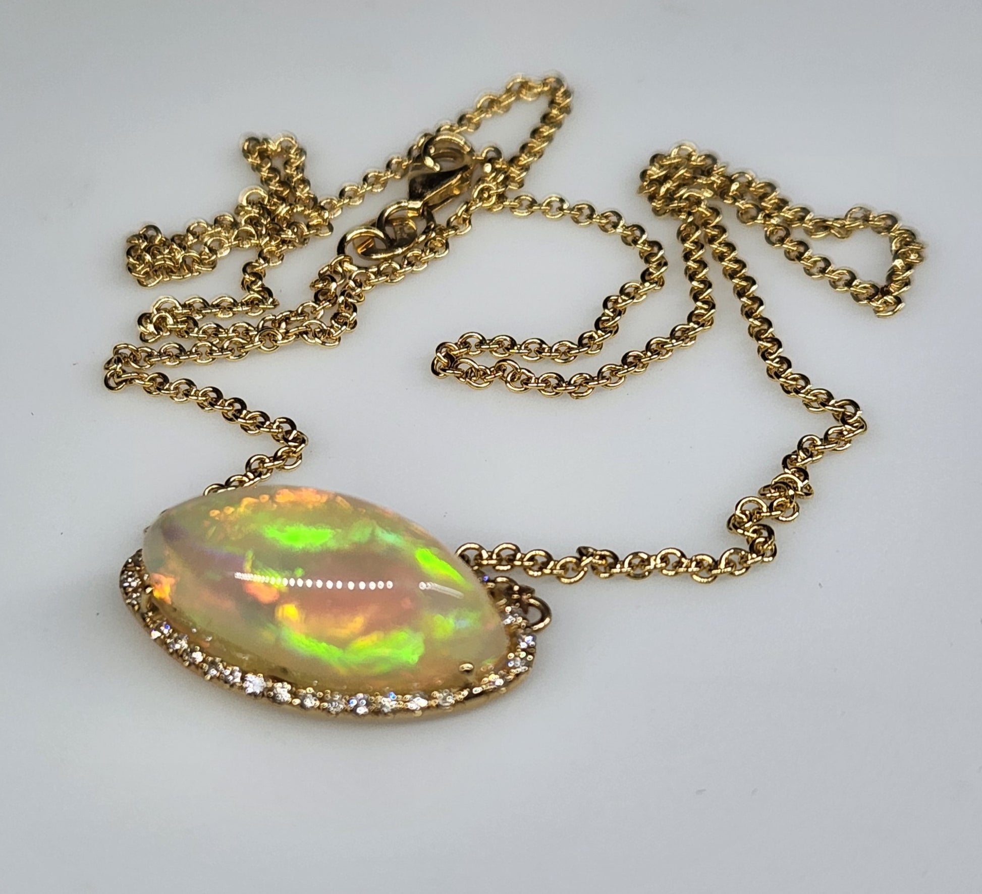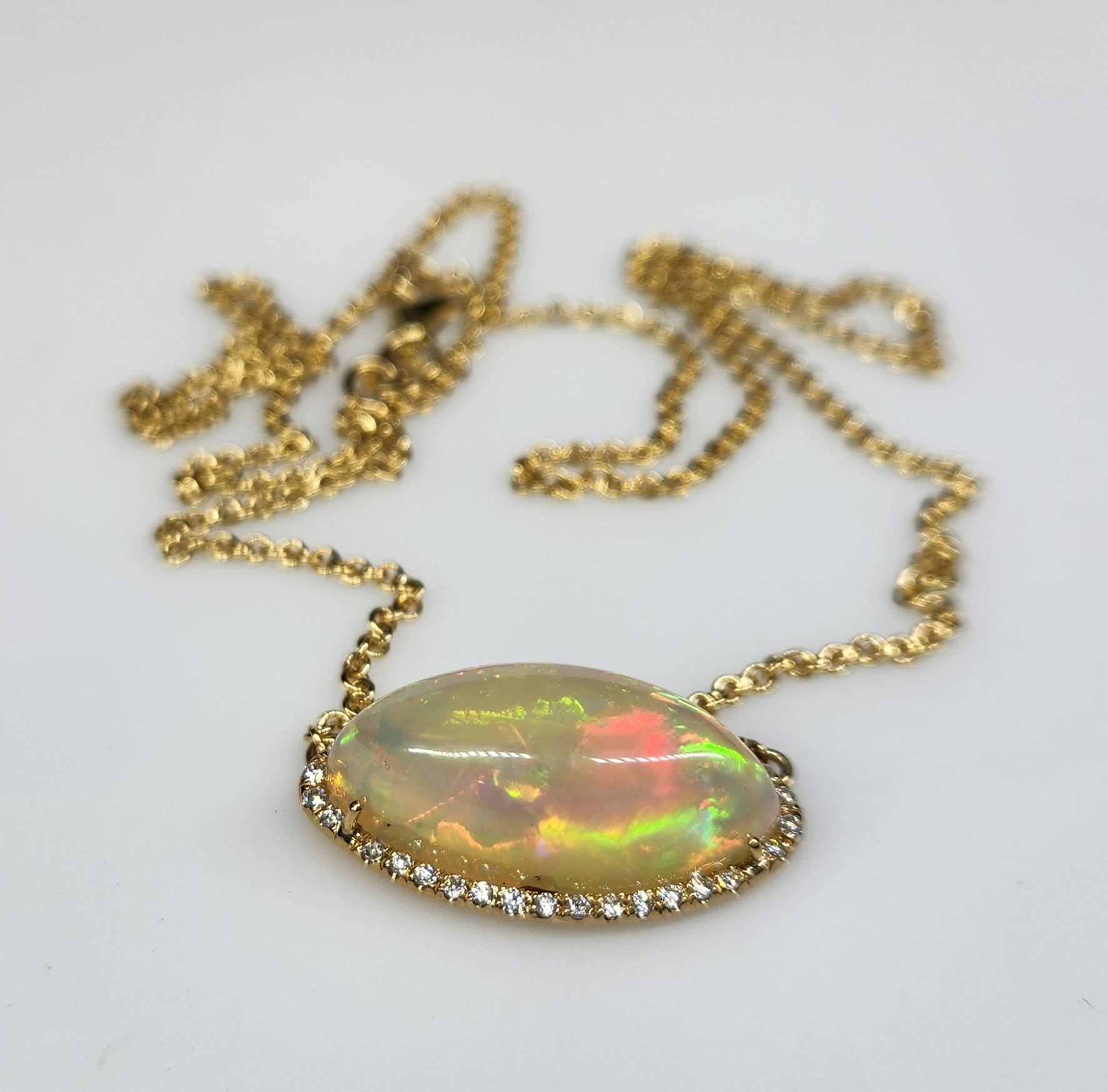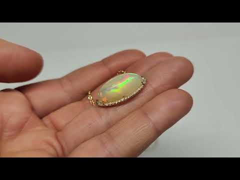 An Ethiopian Opal set in a 14k Yellow Gold with diamond accents. The opal has bright fire colors and a beautiful cabochon cut.