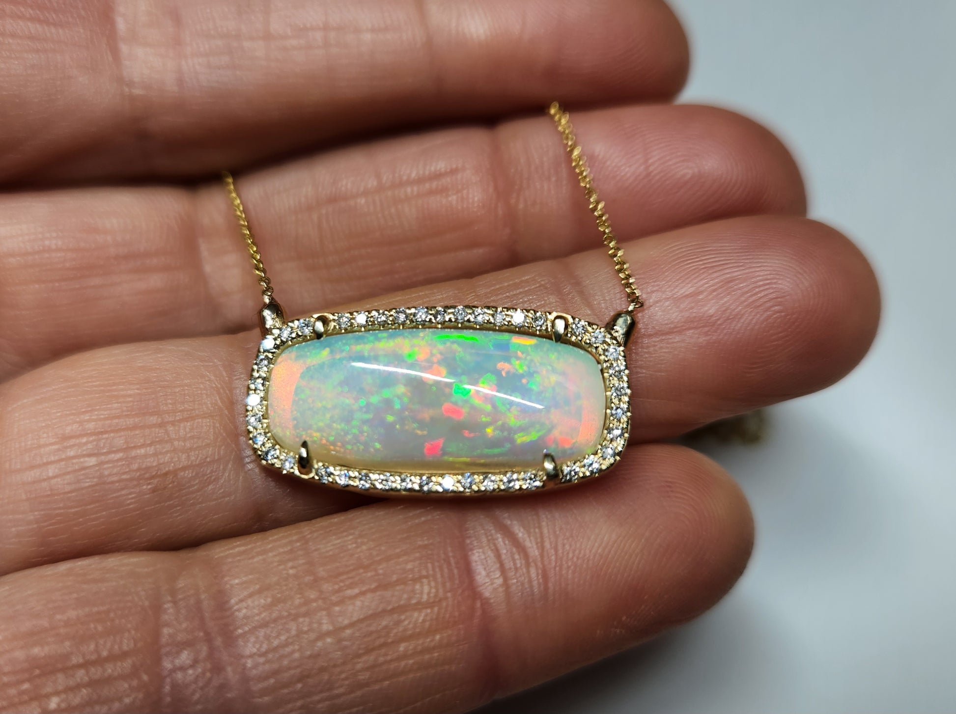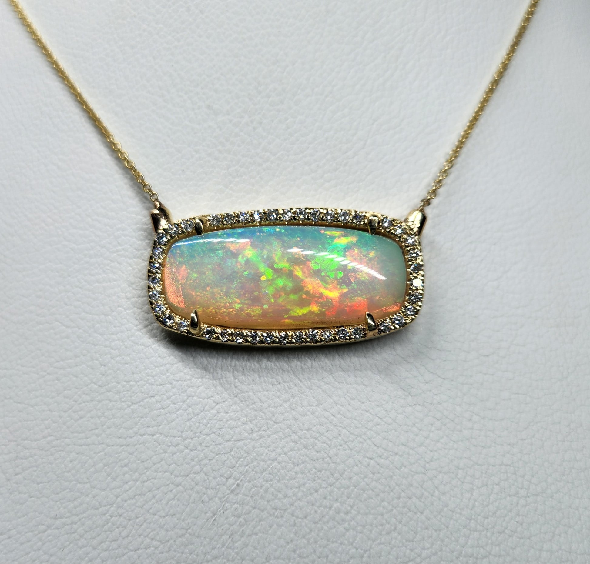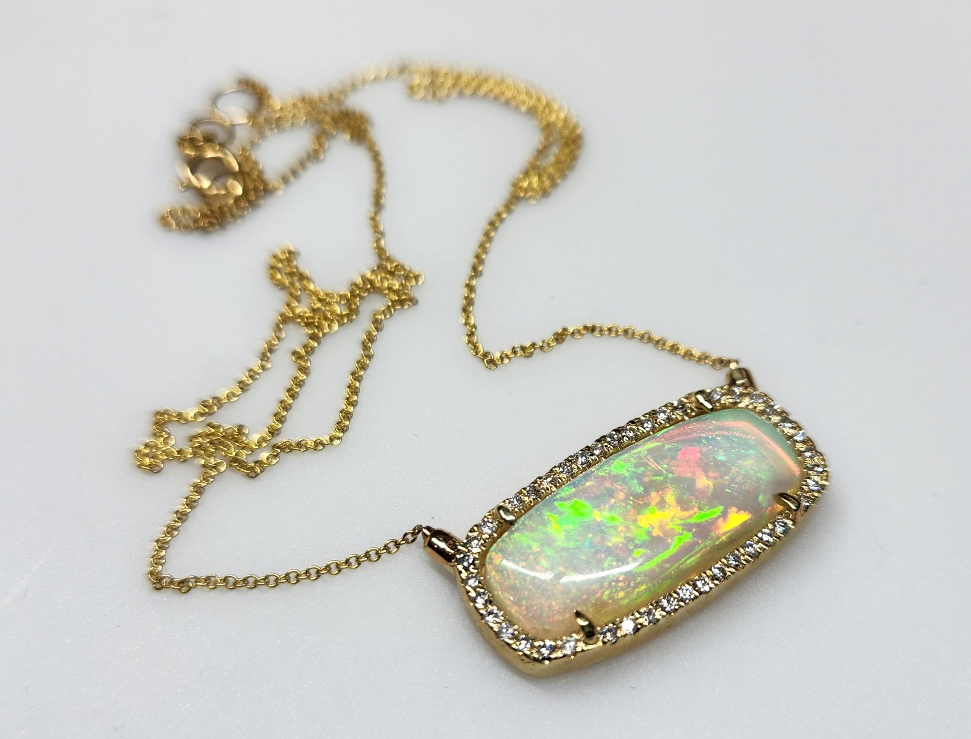 A bright and colorful opal set in 14k yellow gold surrounded by diamonds with a solid 14k gold split chain.