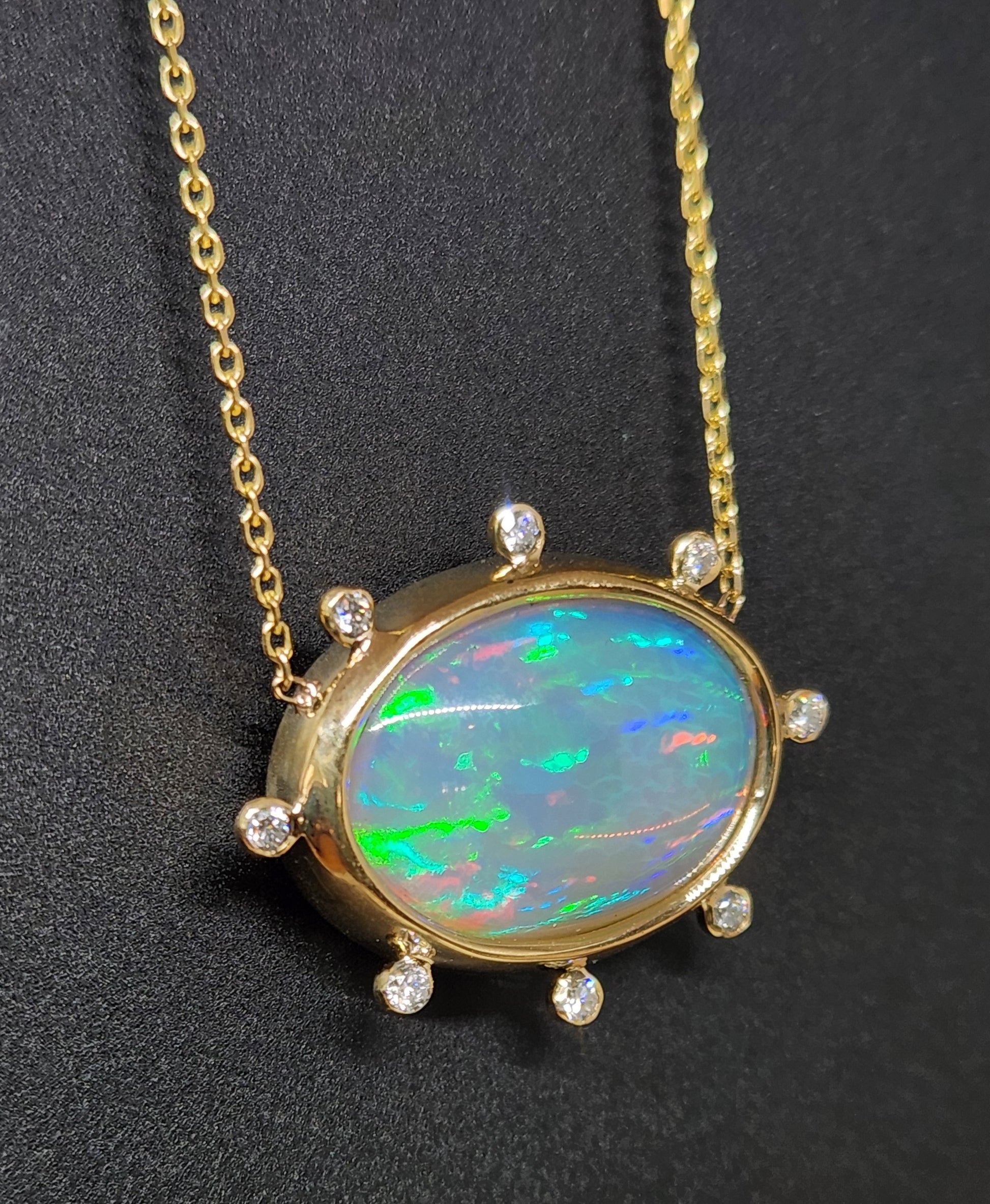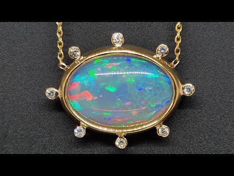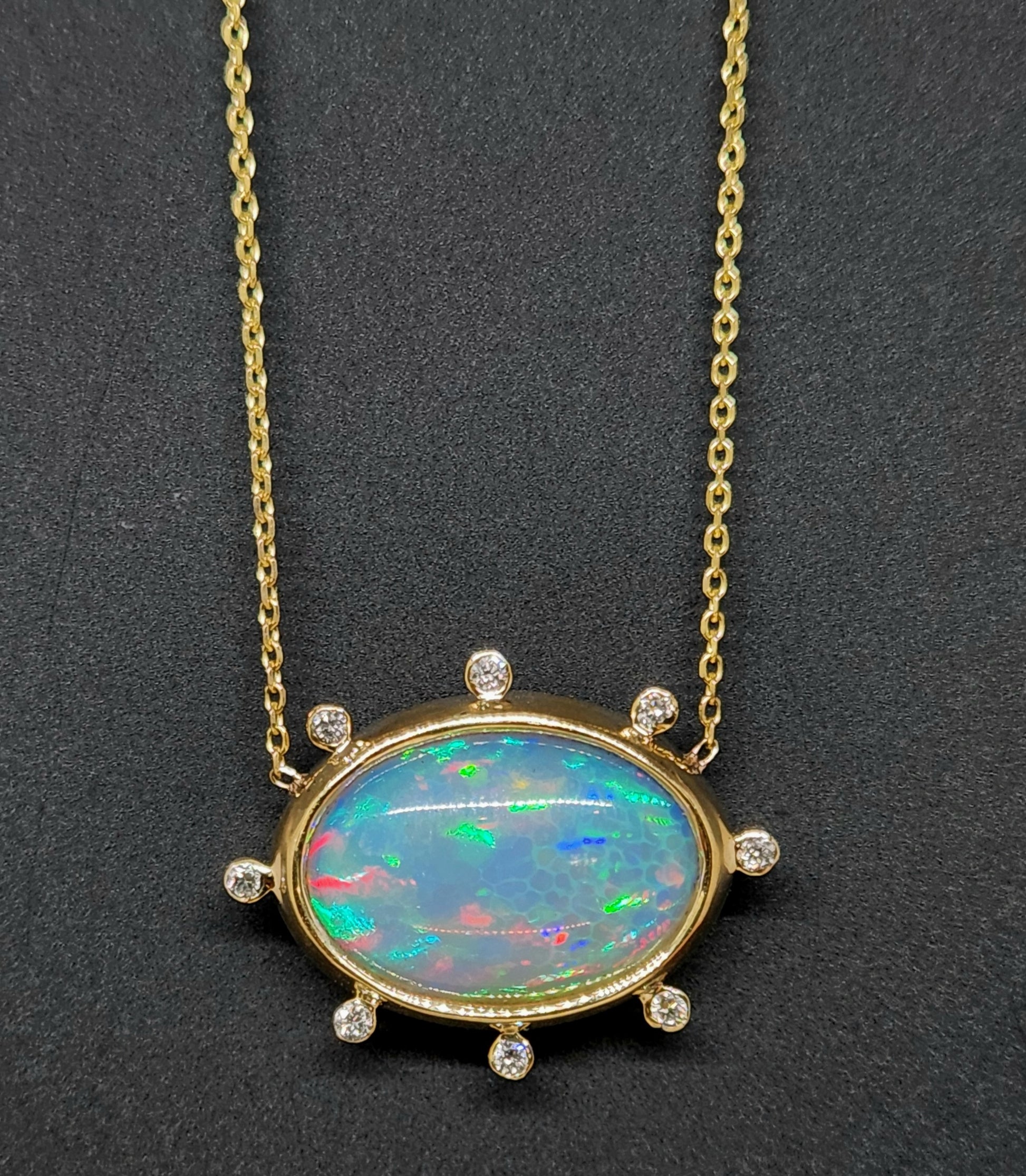 A bright and colorful opal set in 14k yellow gold surrounded by diamonds with a solid 14k gold split chain. The pendant has an open back exposing the opal.