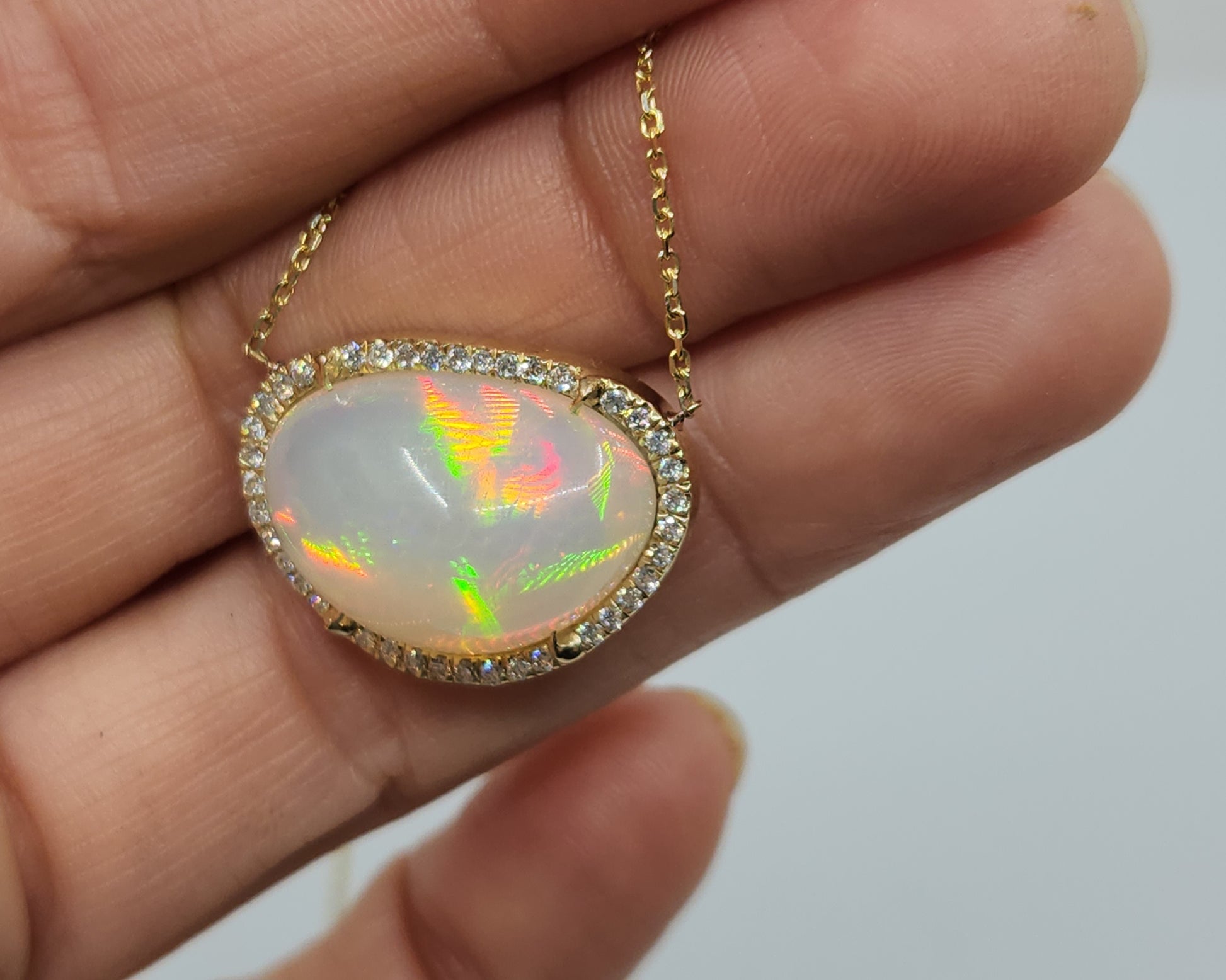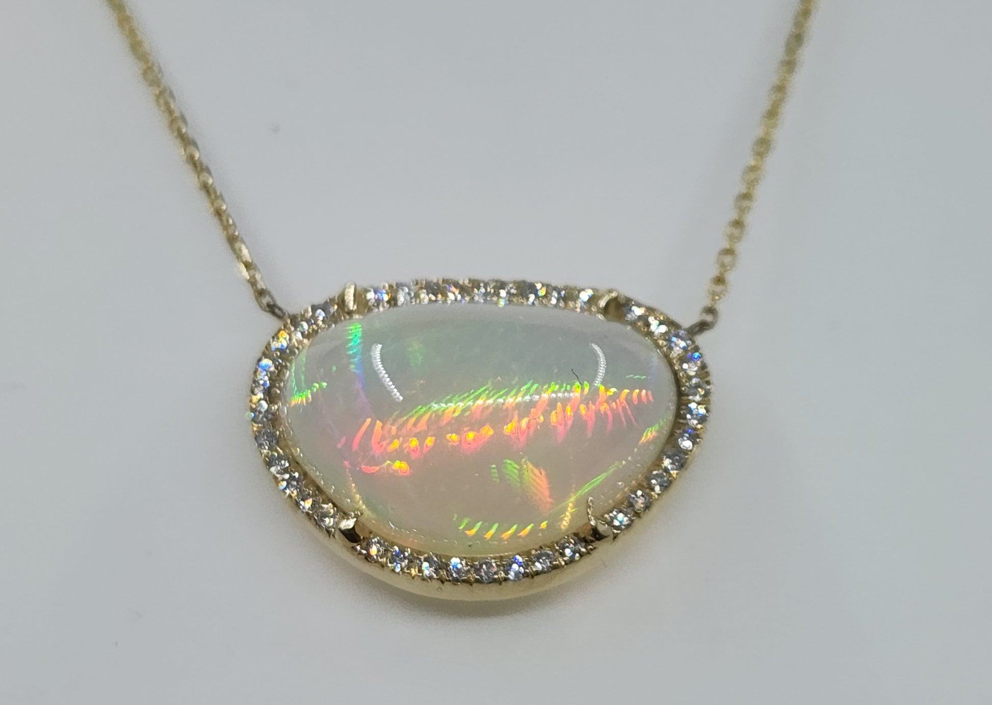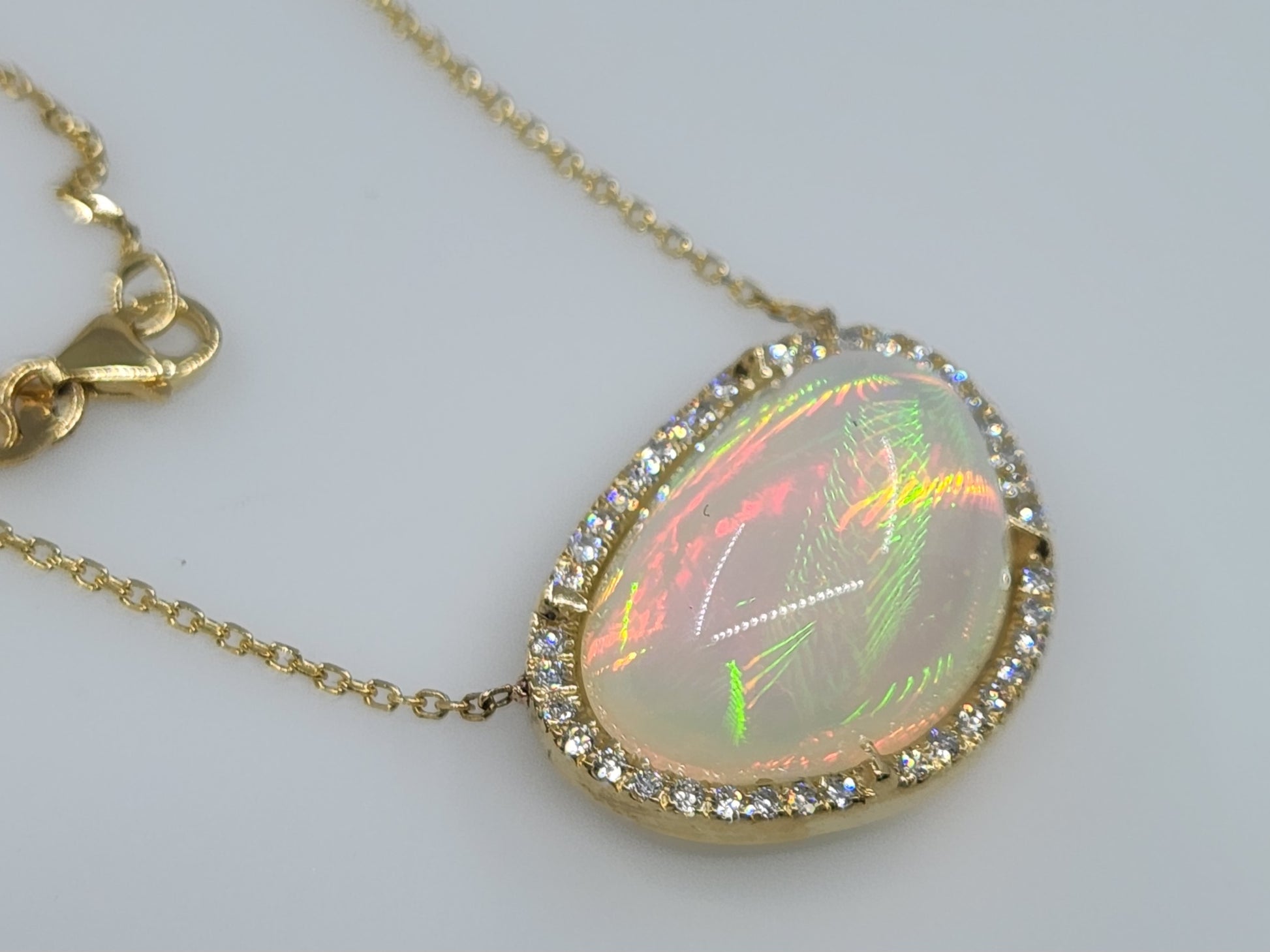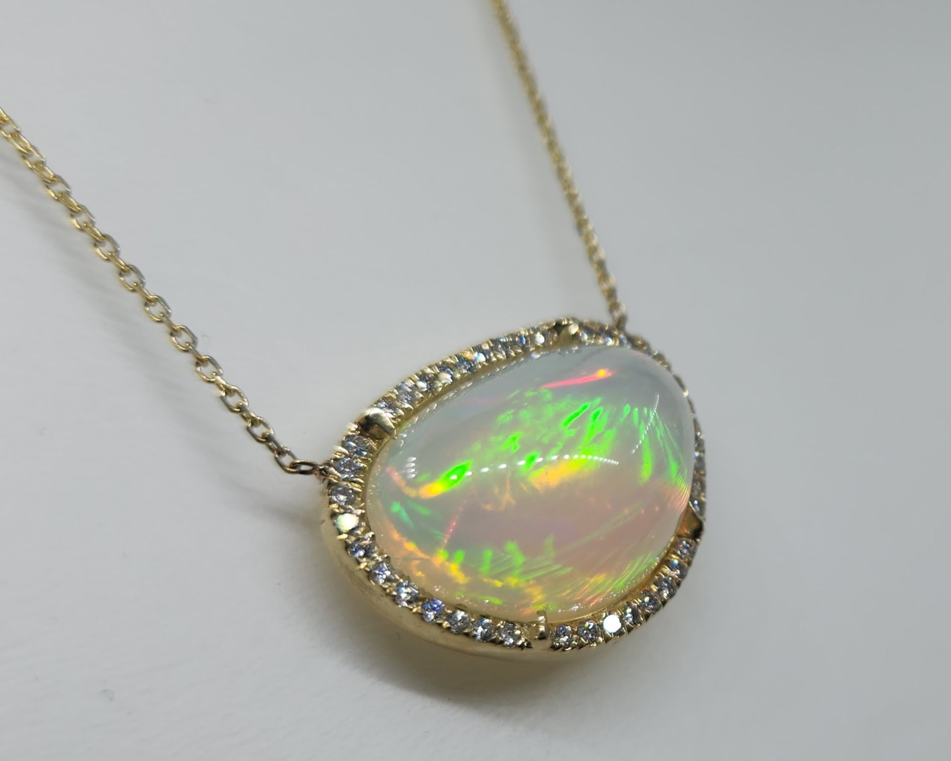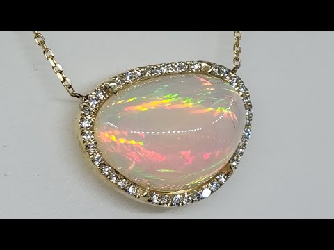 A bright and colorful opal set in 14k yellow gold surrounded by diamonds with a solid 14k gold split chain. The pendant has an open back exposing the opal (see video for a closer look).