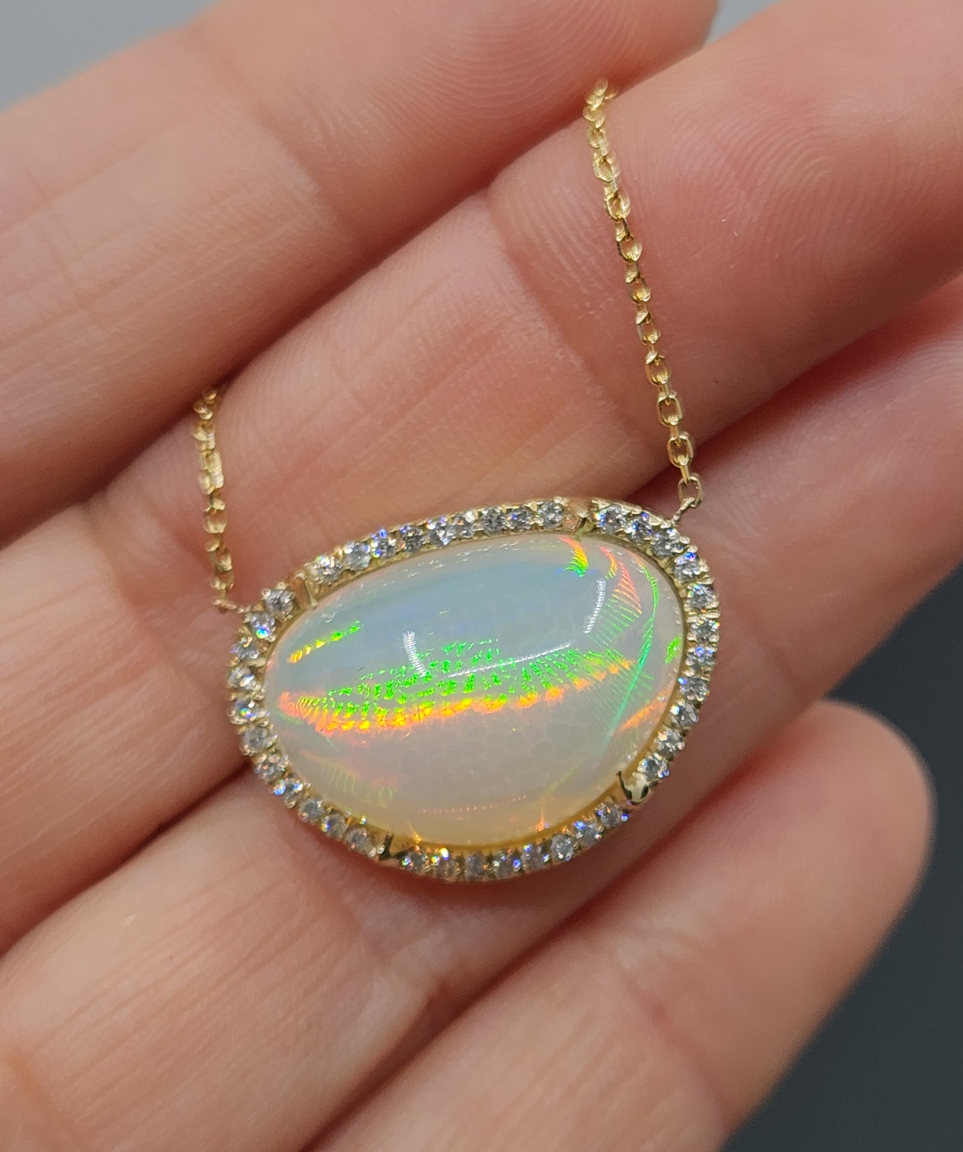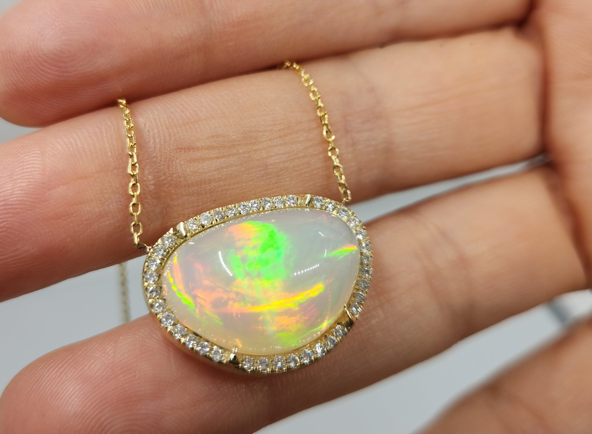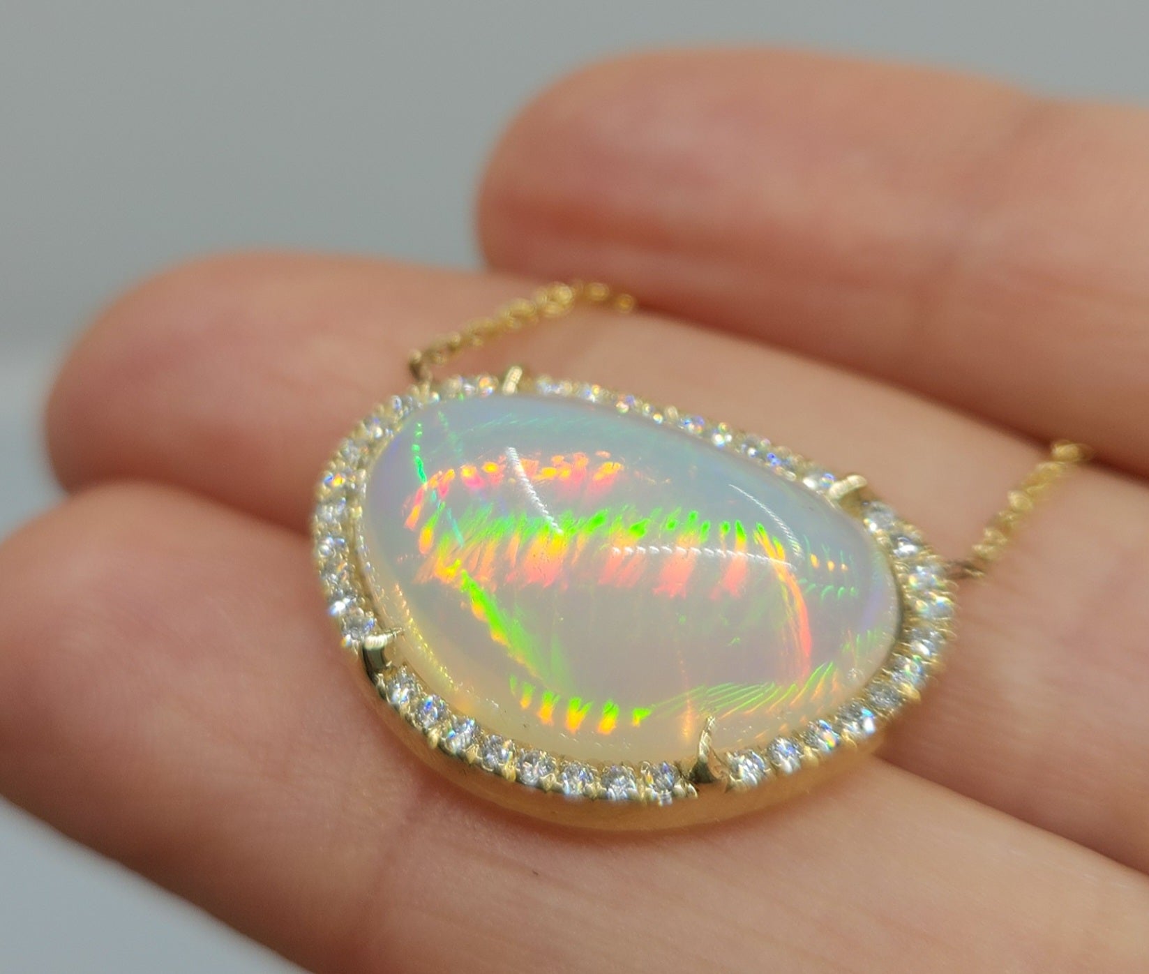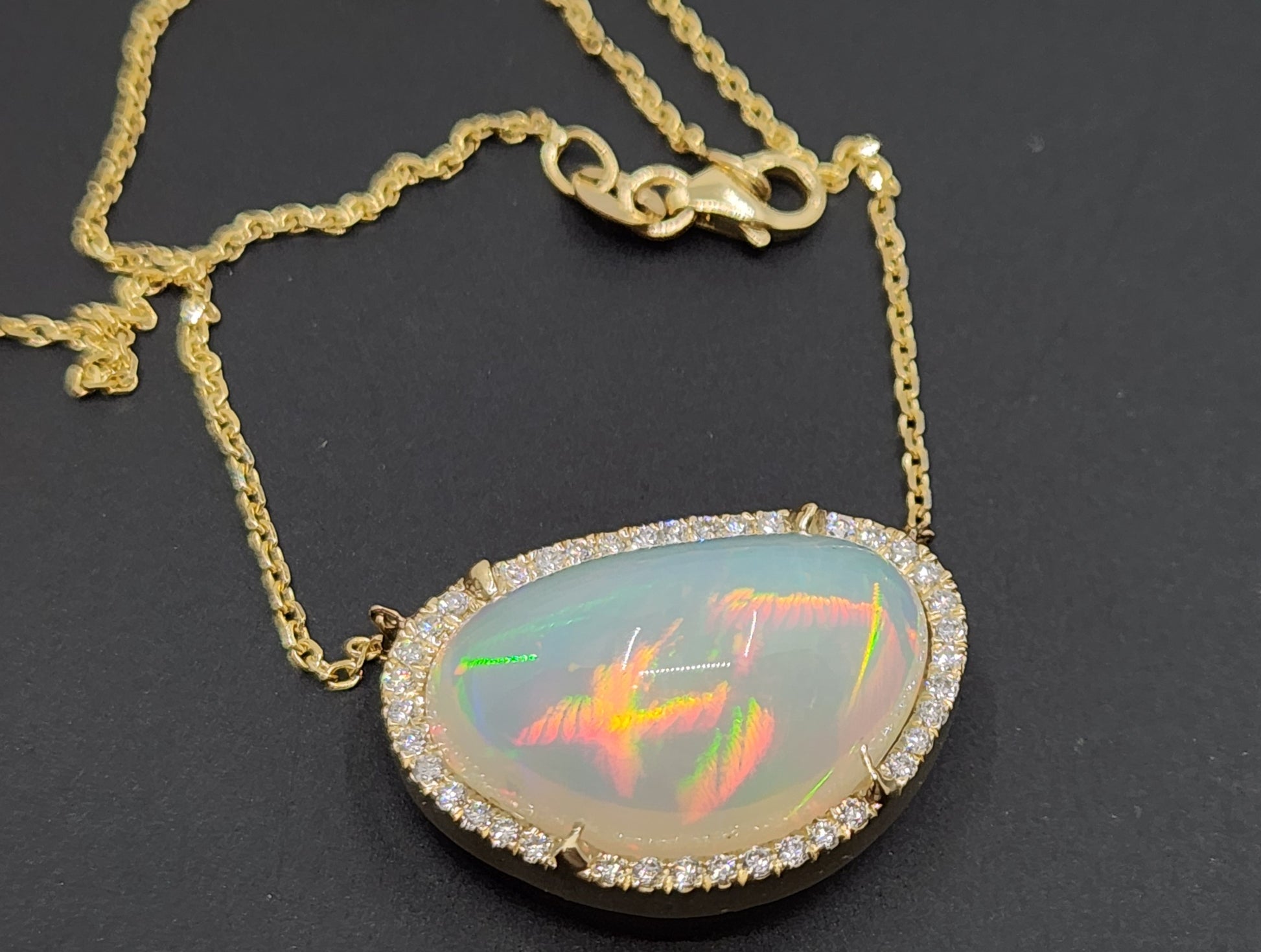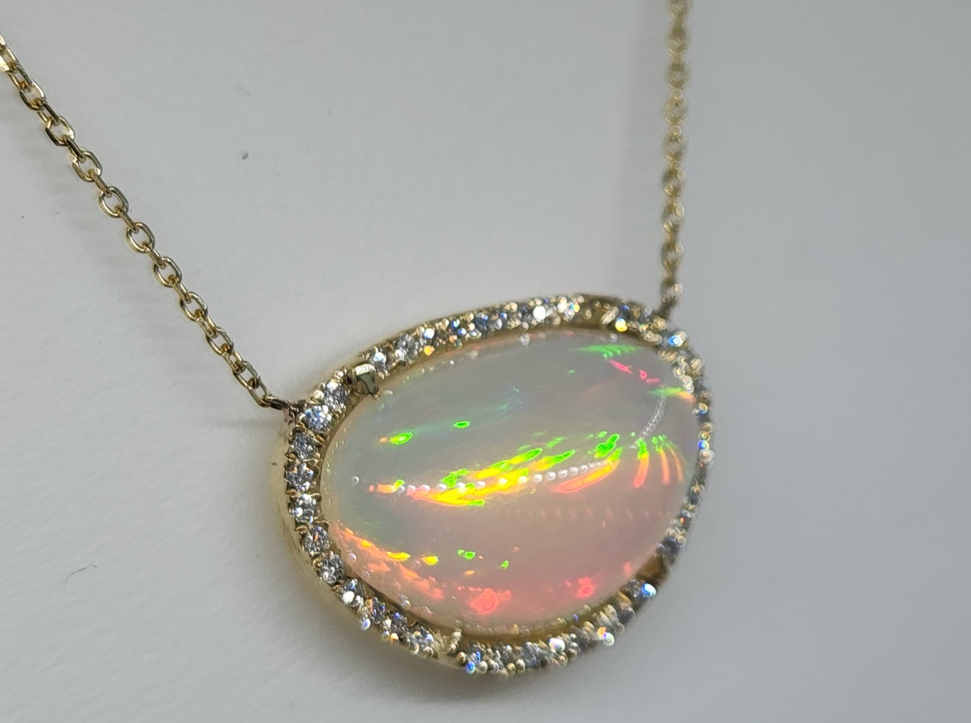 A bright and colorful opal set in 14k yellow gold surrounded by diamonds with a solid 14k gold split chain. The pendant has an open back exposing the opal (see video for a closer look).