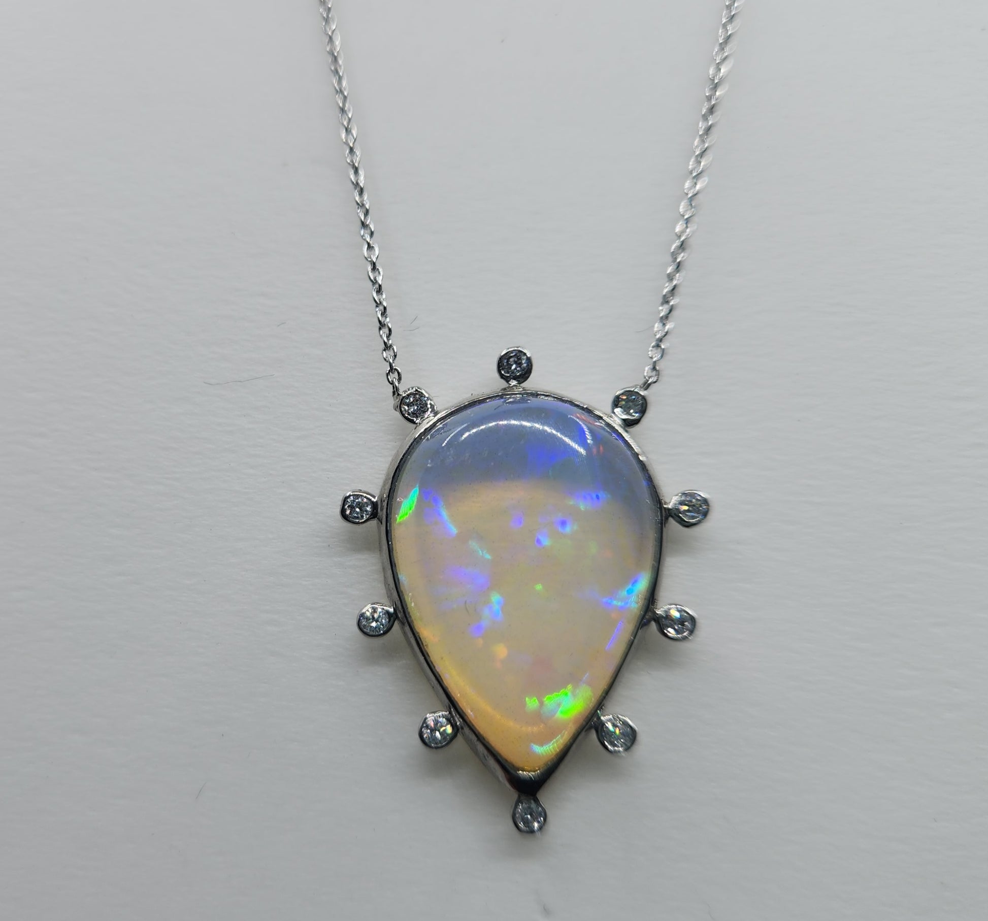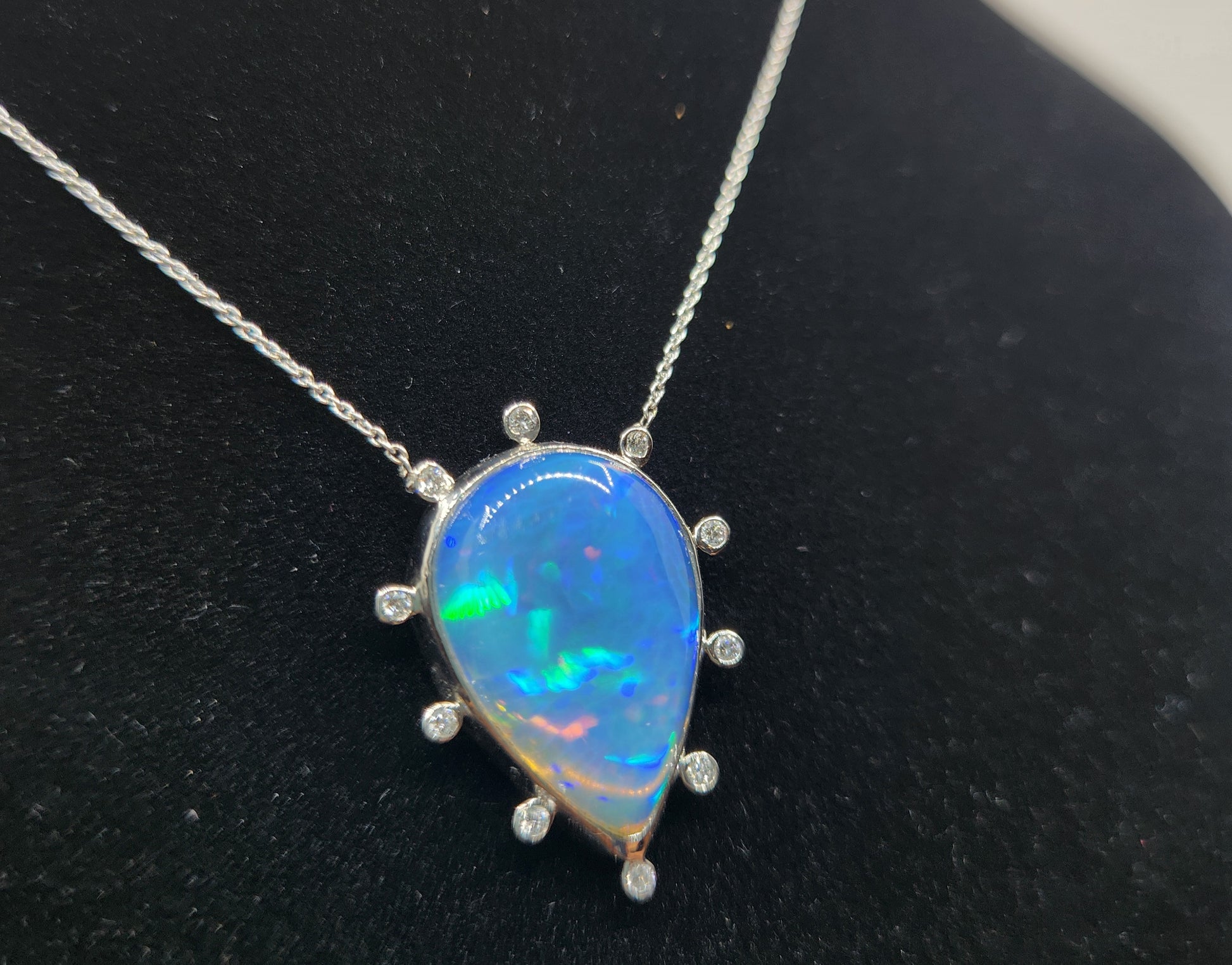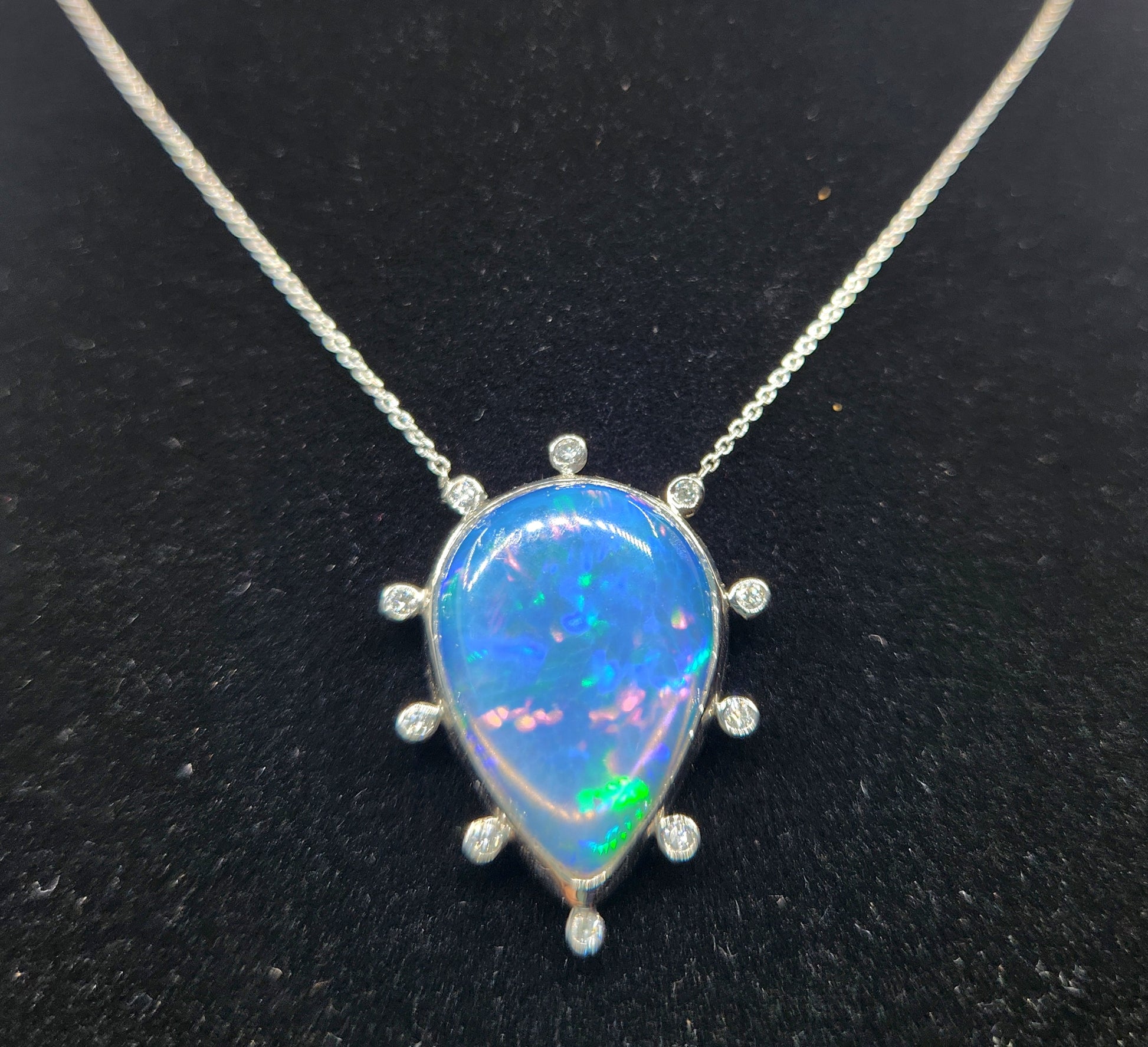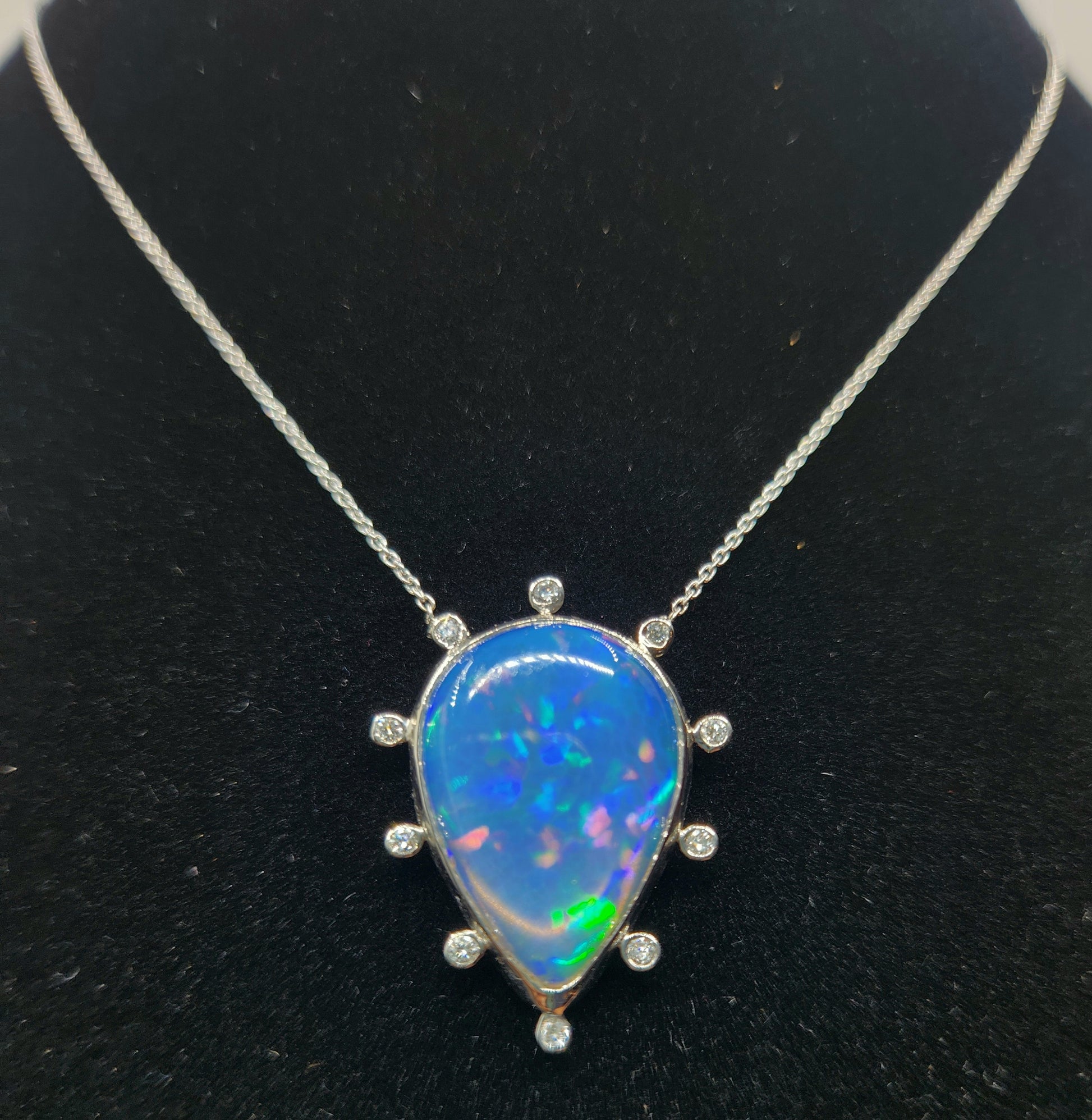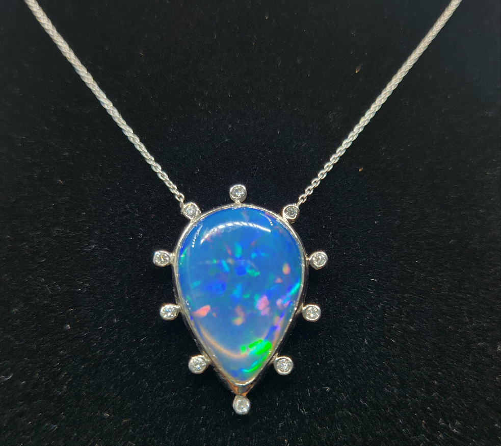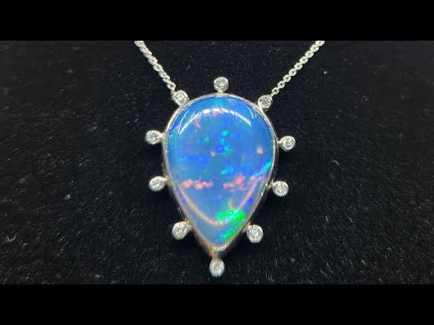 A colorful blue opal, with red, blue and green fire colors, set in platinum with diamond accents, The pendant has 10 white diamond accents surrounding the opal.