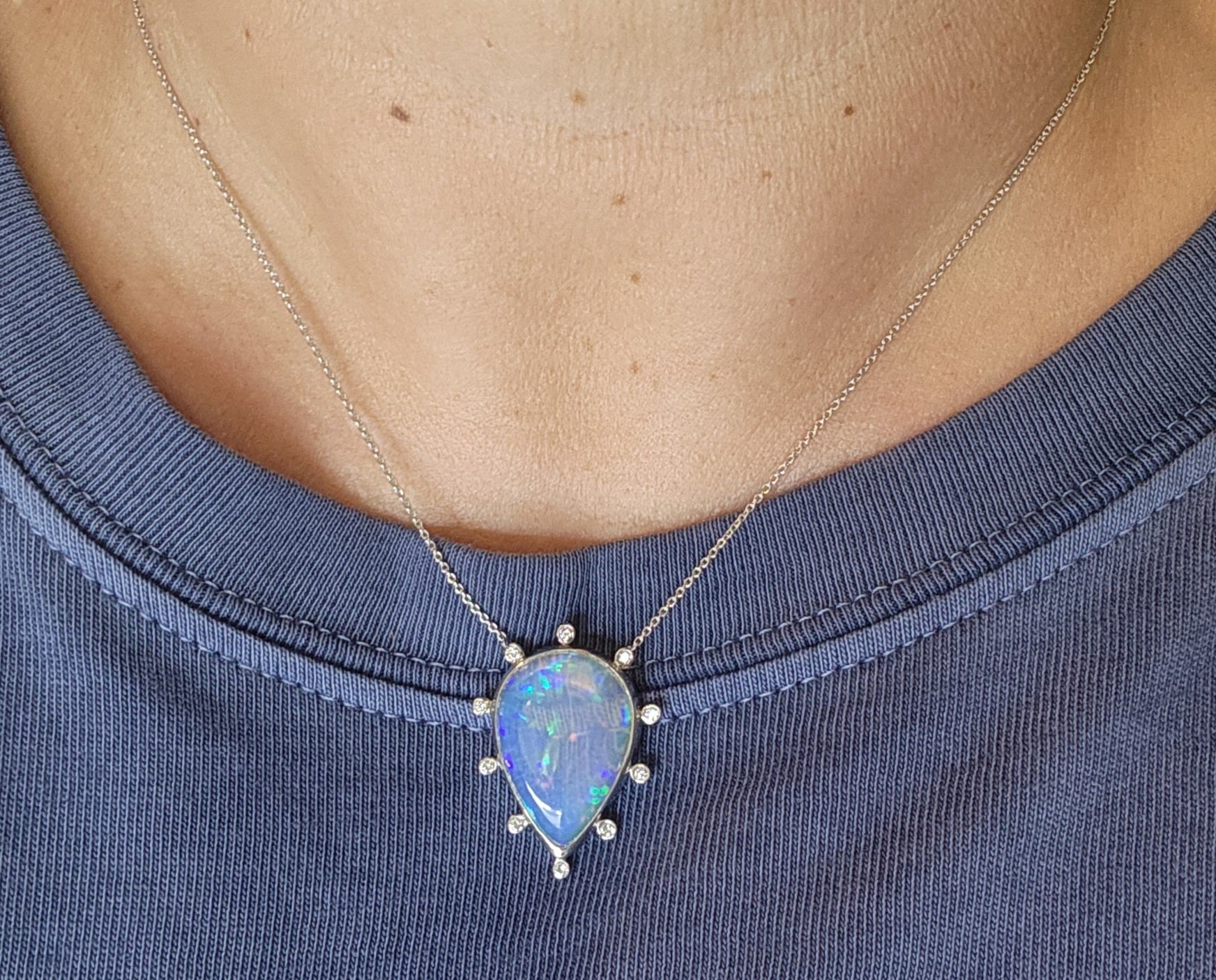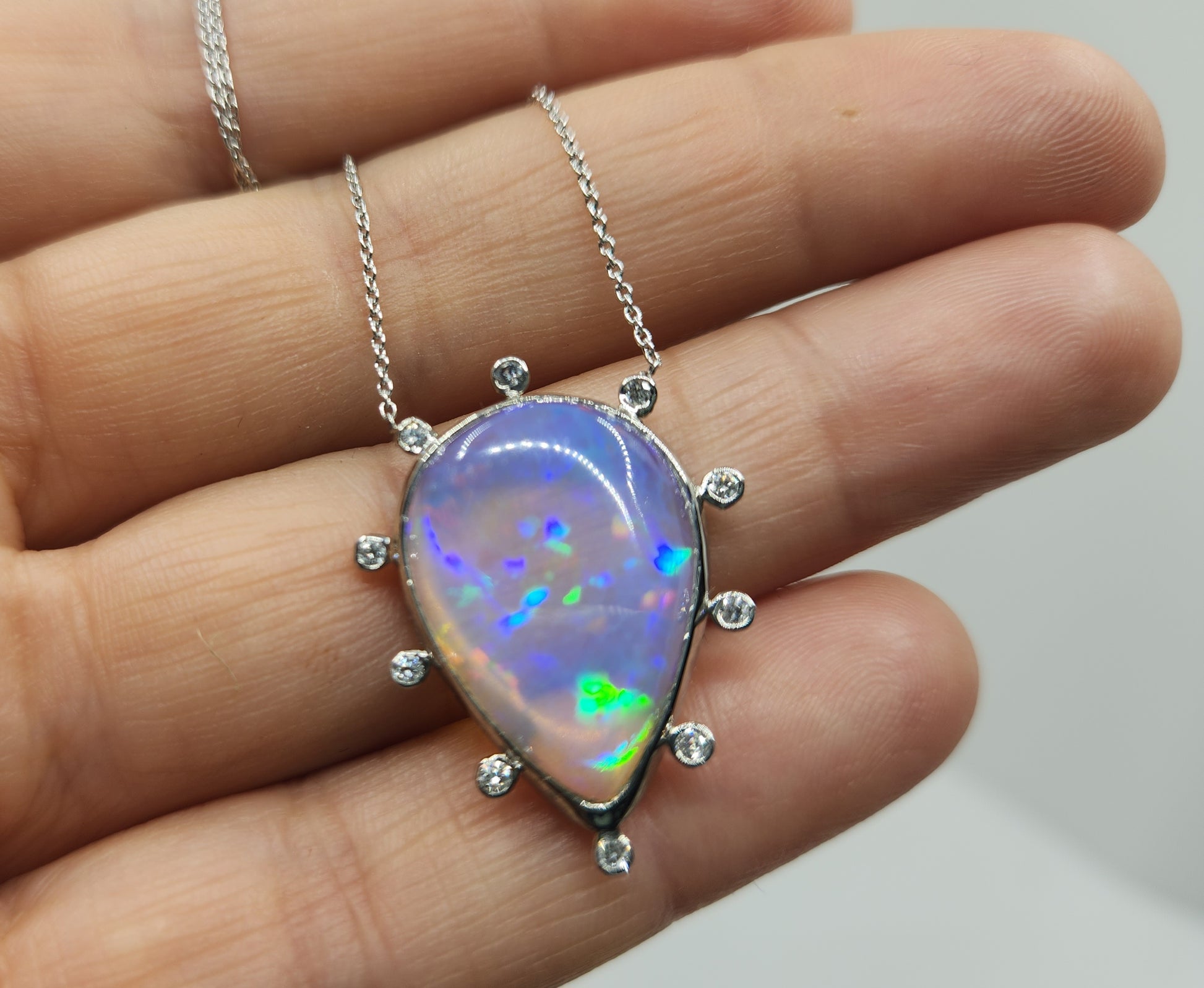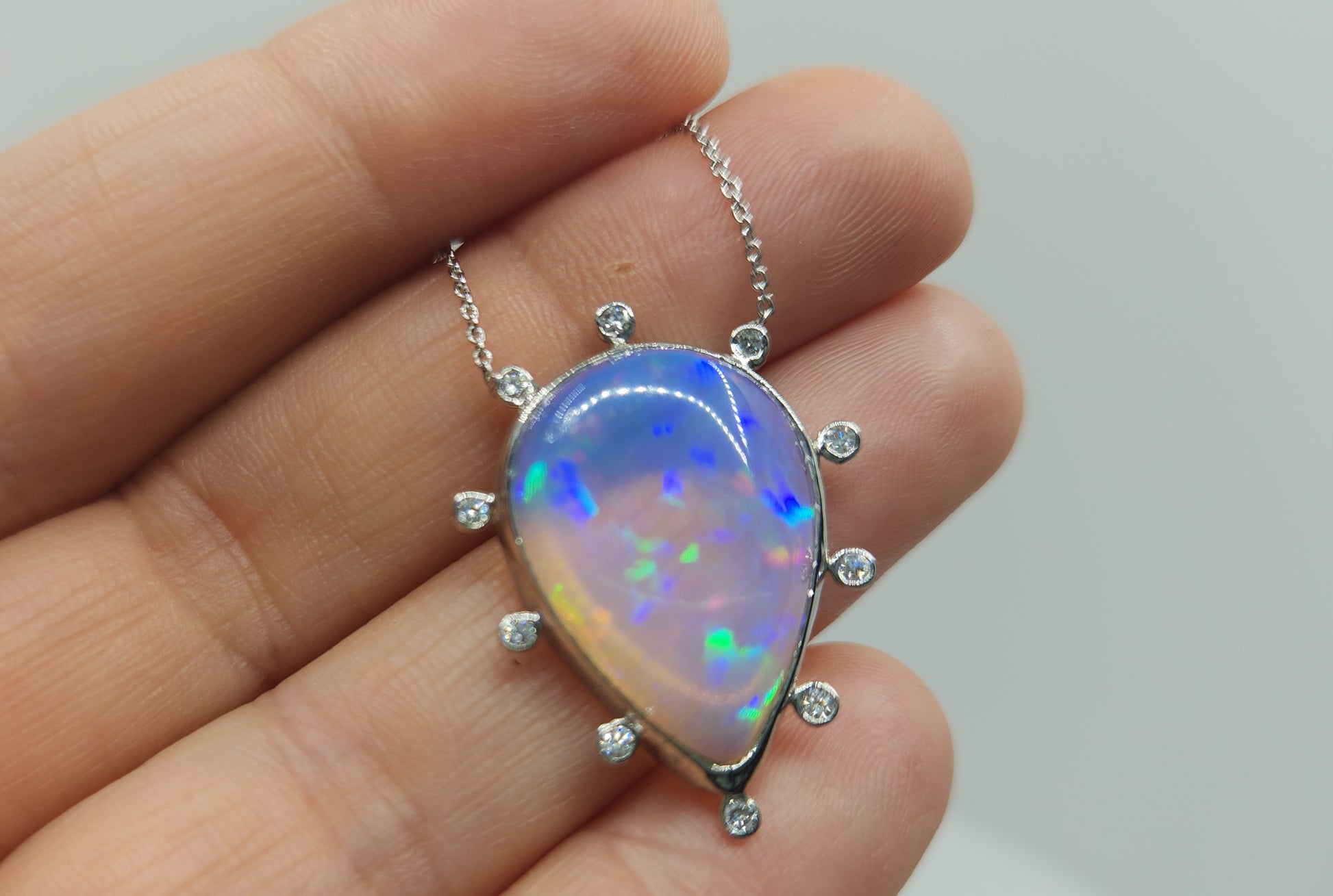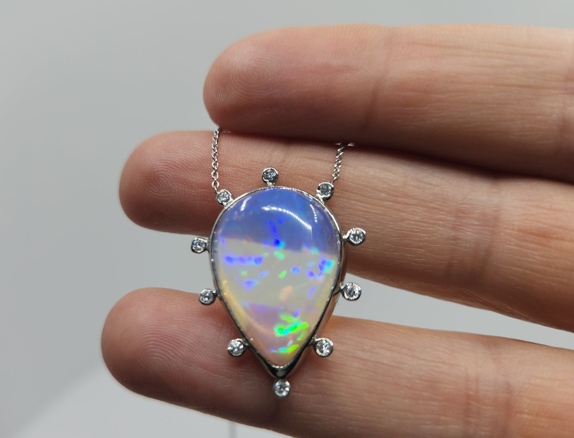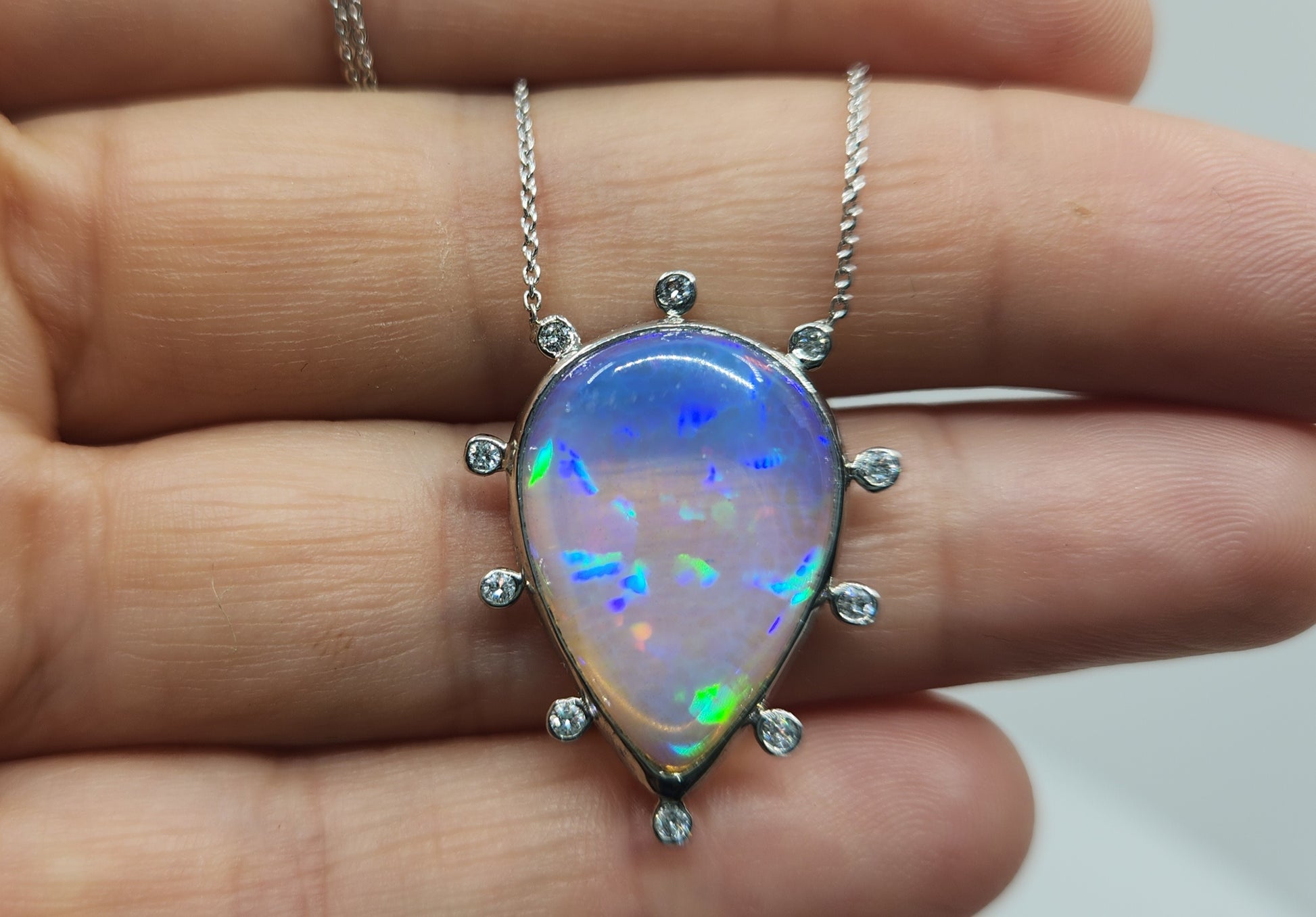 A colorful blue opal, with red, blue and green fire colors, set in platinum with diamond accents, The pendant has 10 white diamond accents surrounding the opal.