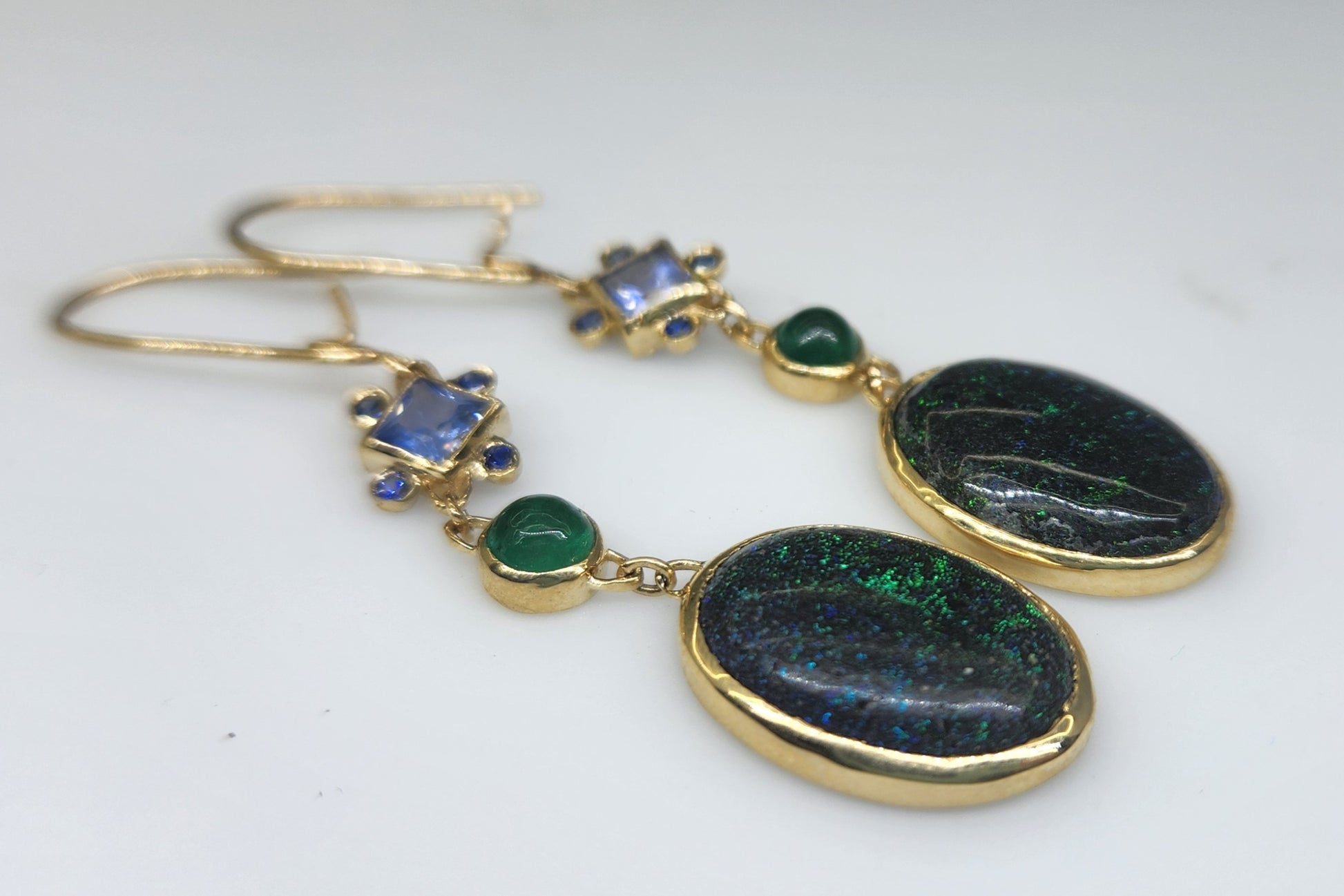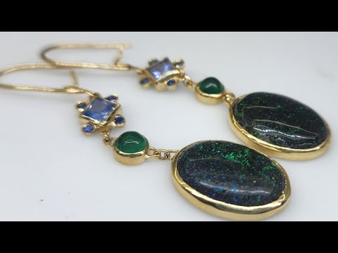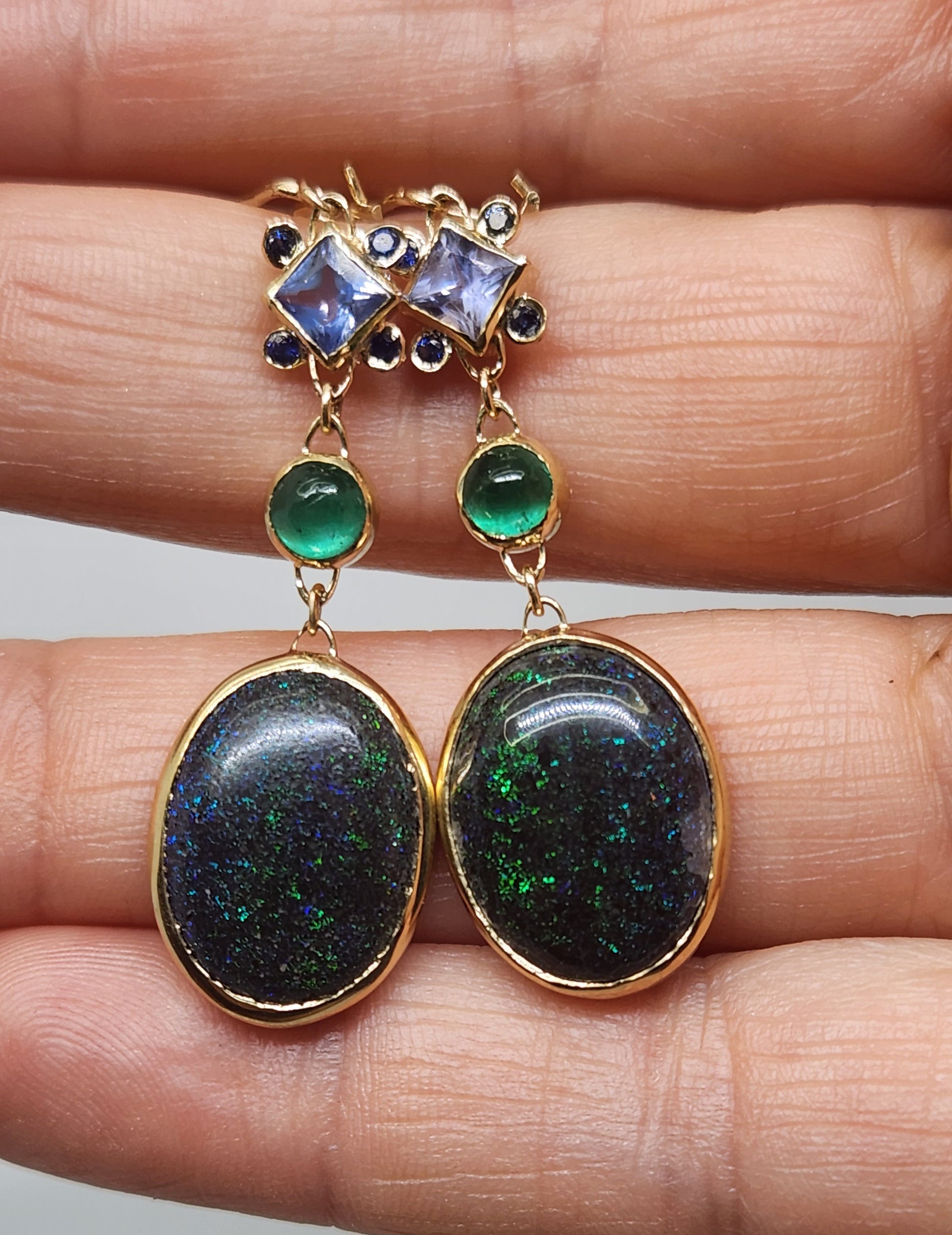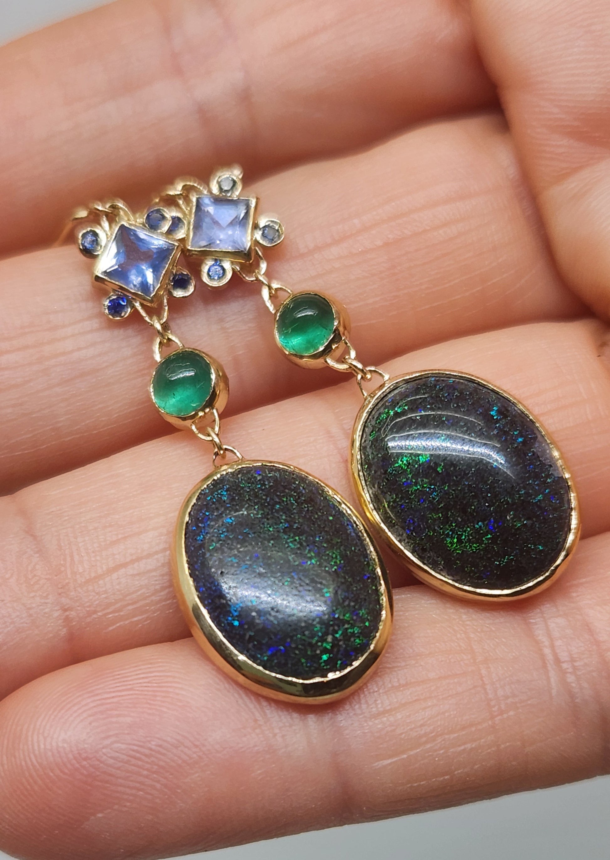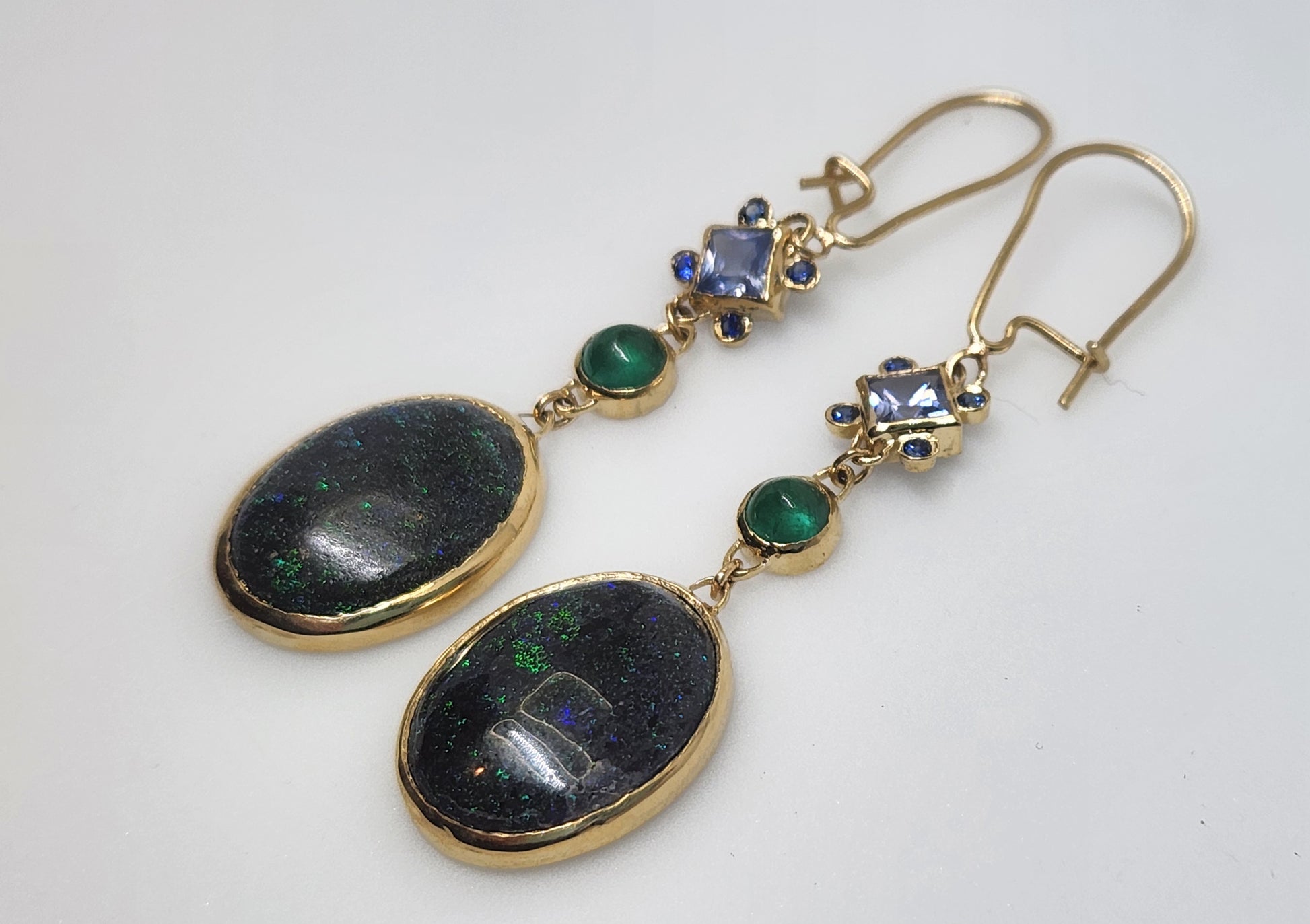 A pair of black Honduran Opals 14k Gold earrings, with emerald, sapphire, and moissanite accents.