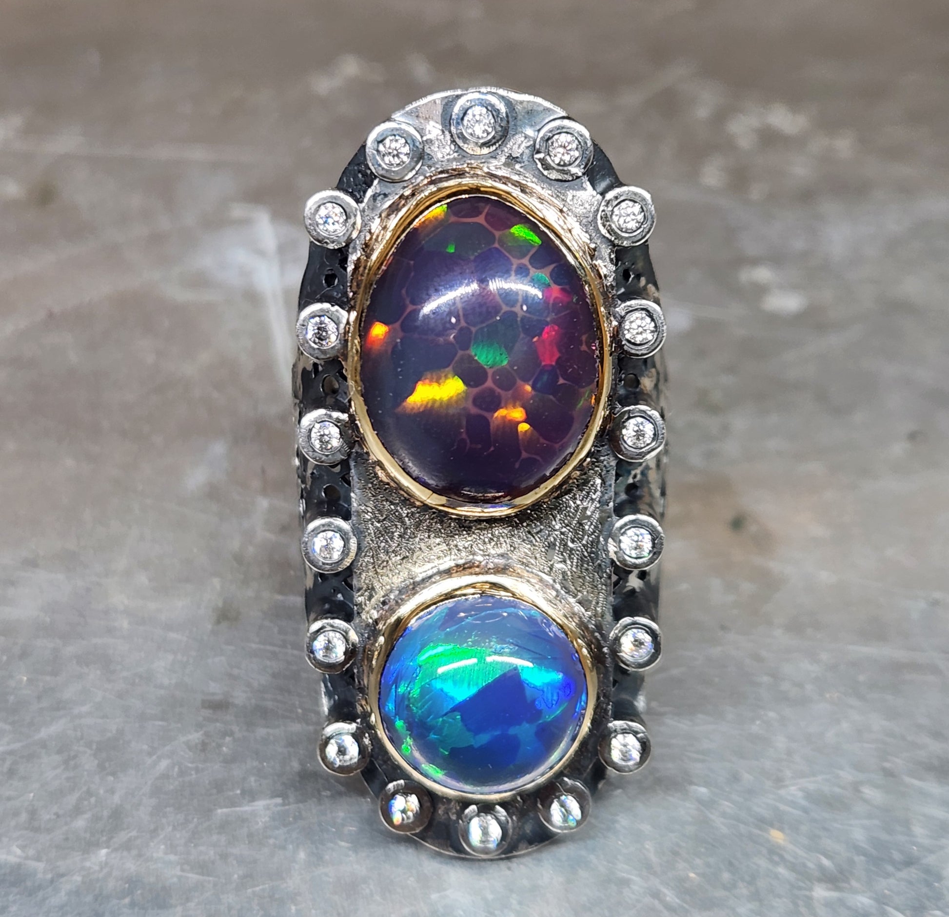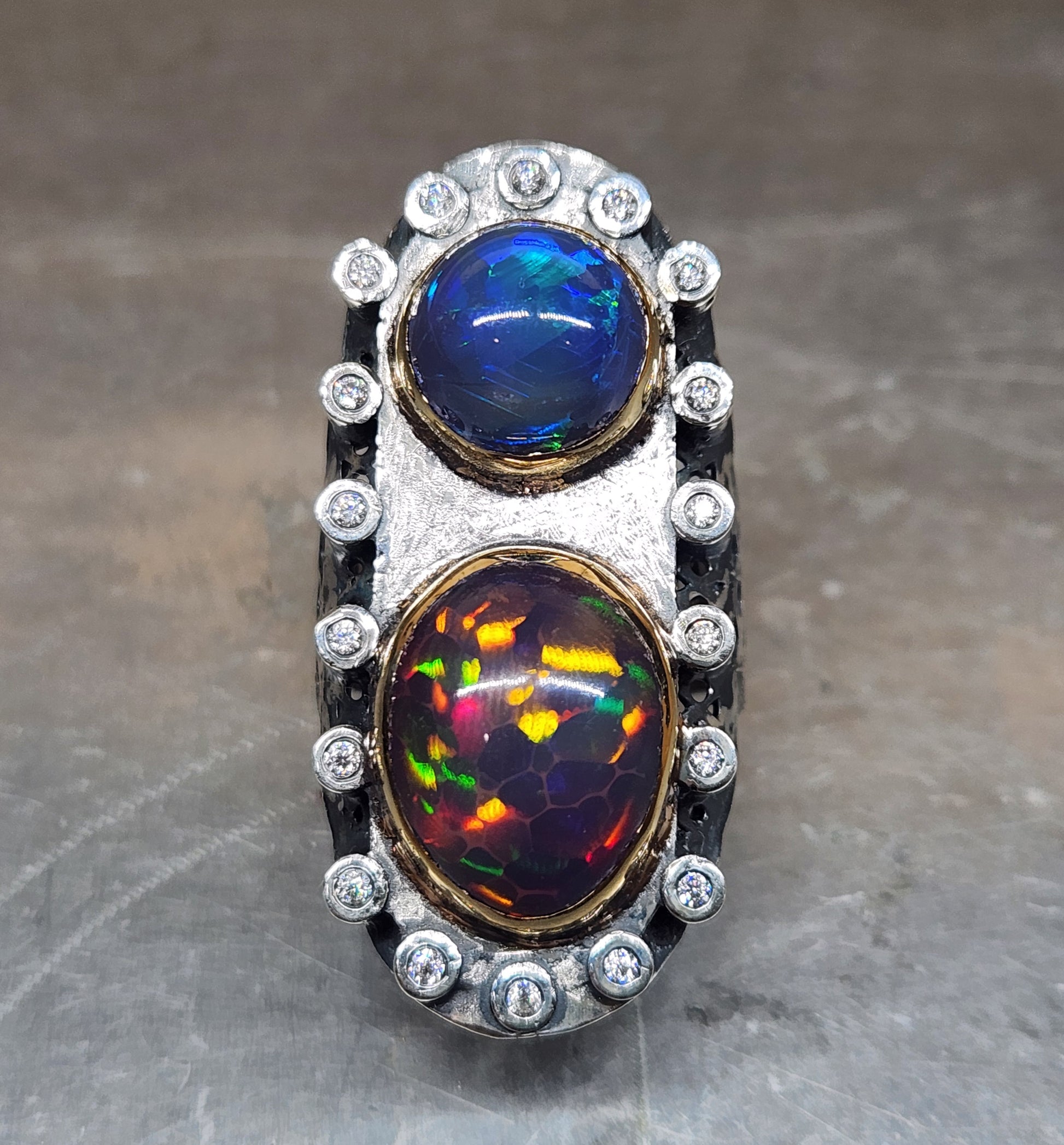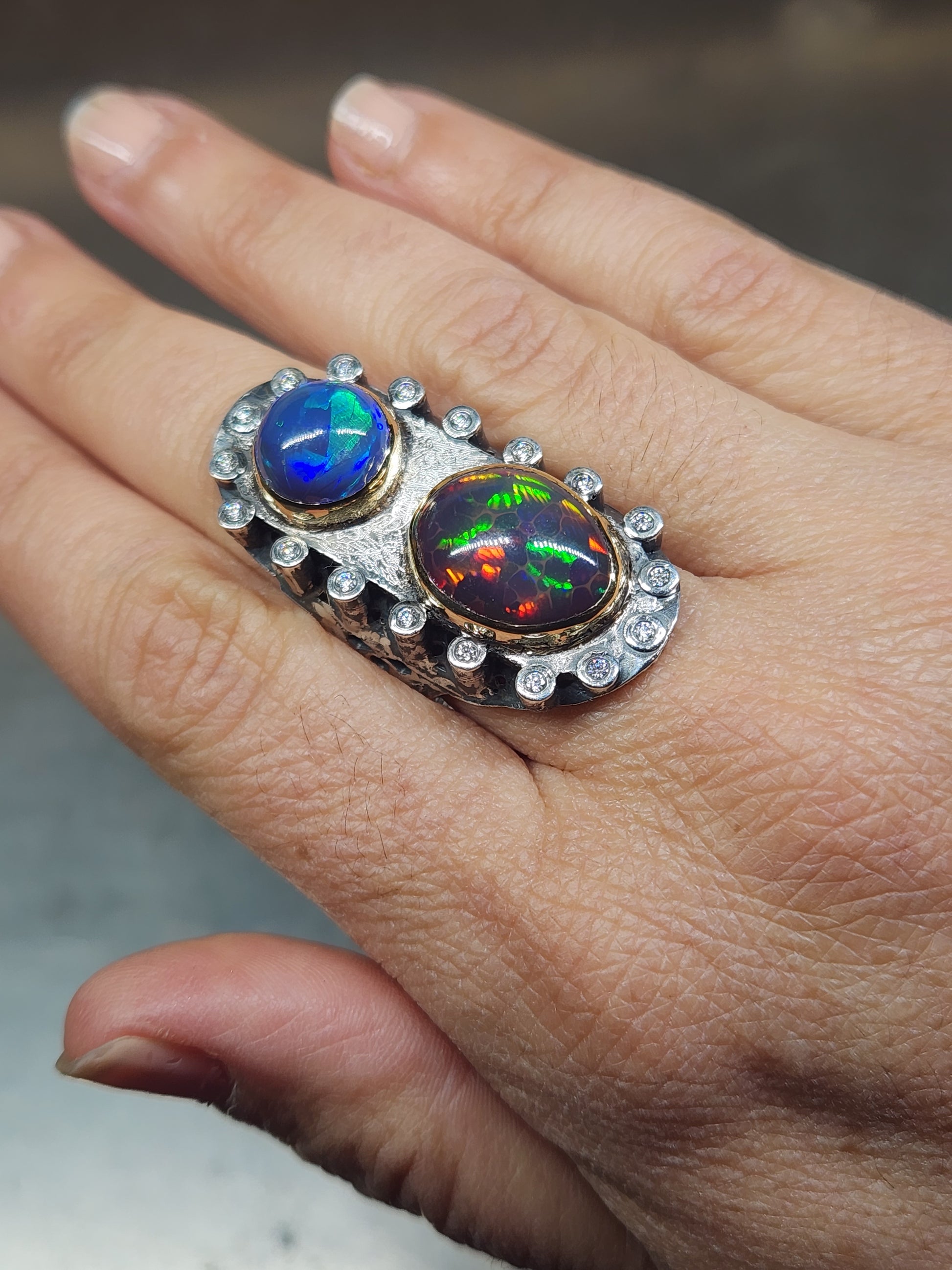 Two bright and colorful Ethiopian opals , set in a Sterling Silver ring with 14k gold bezels. The opals are surrounded by ruby accent stones.