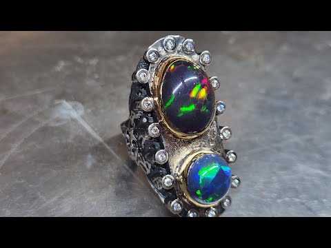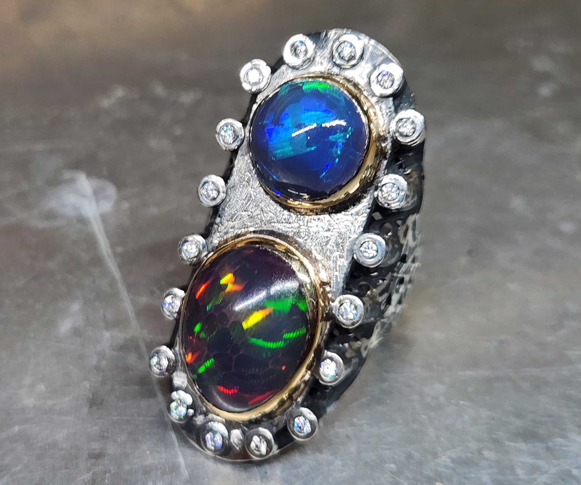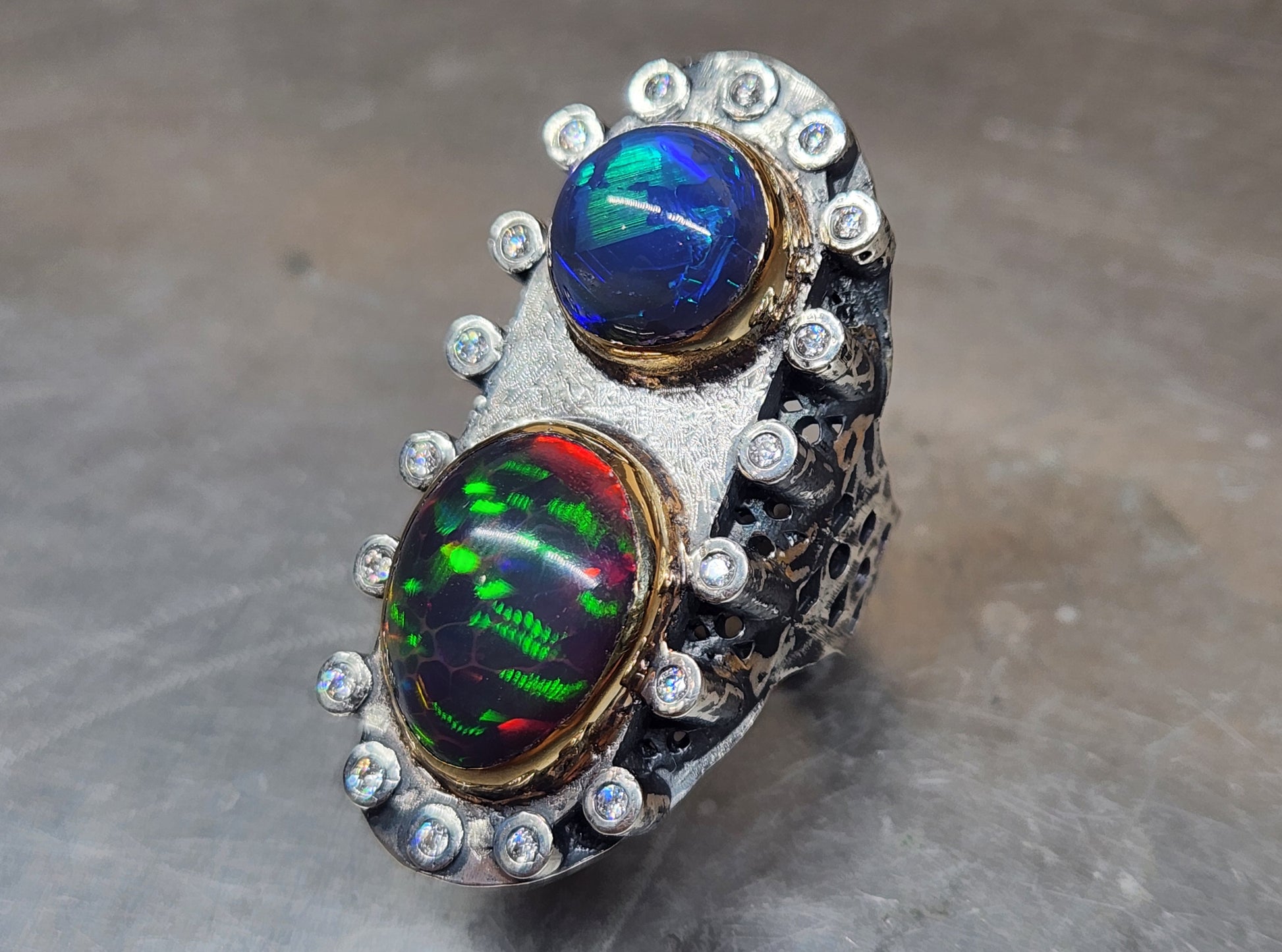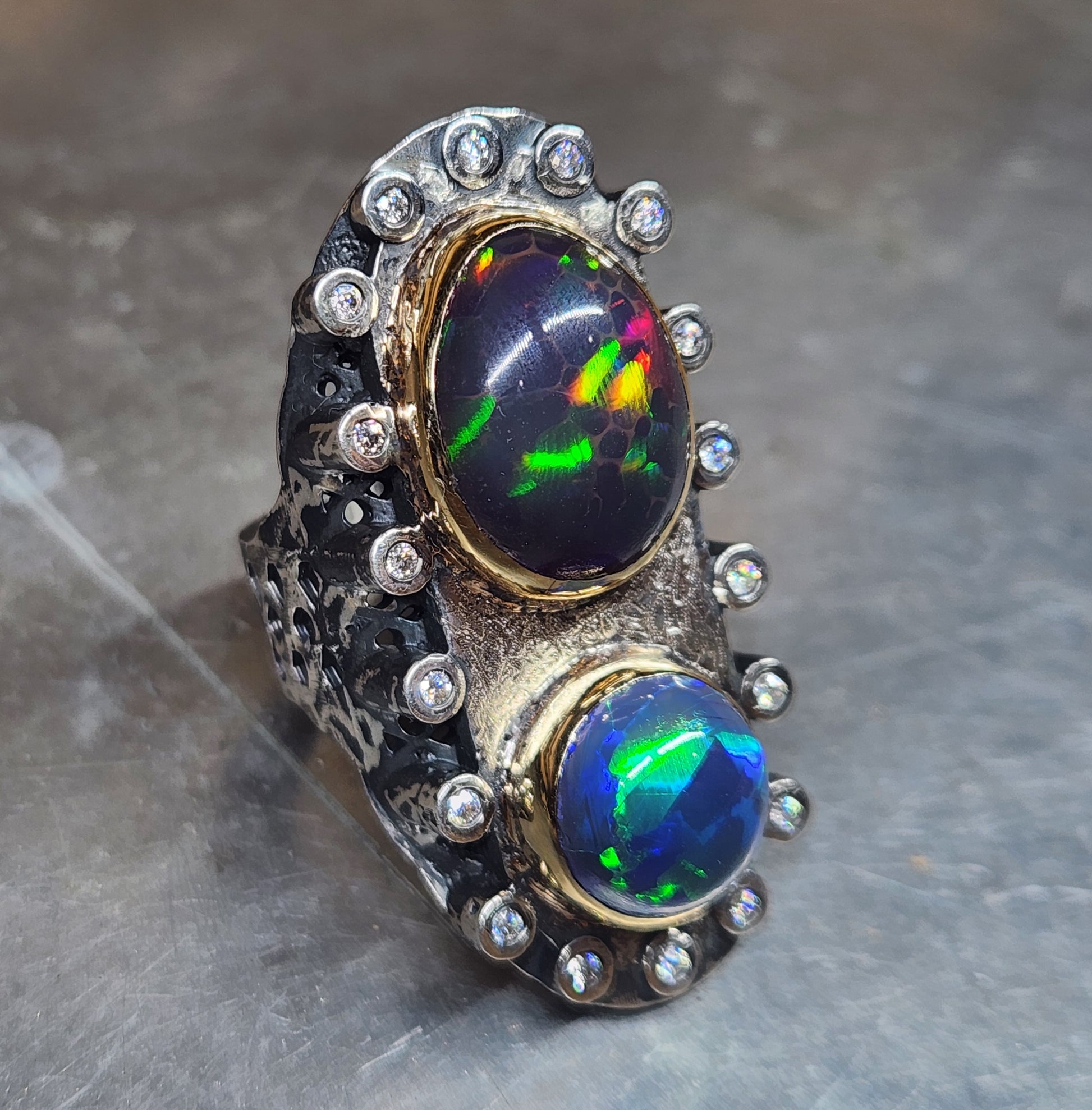 Two bright and colorful Ethiopian opals , set in a Sterling Silver ring with 14k gold bezels. The opals are surrounded by ruby accent stones.