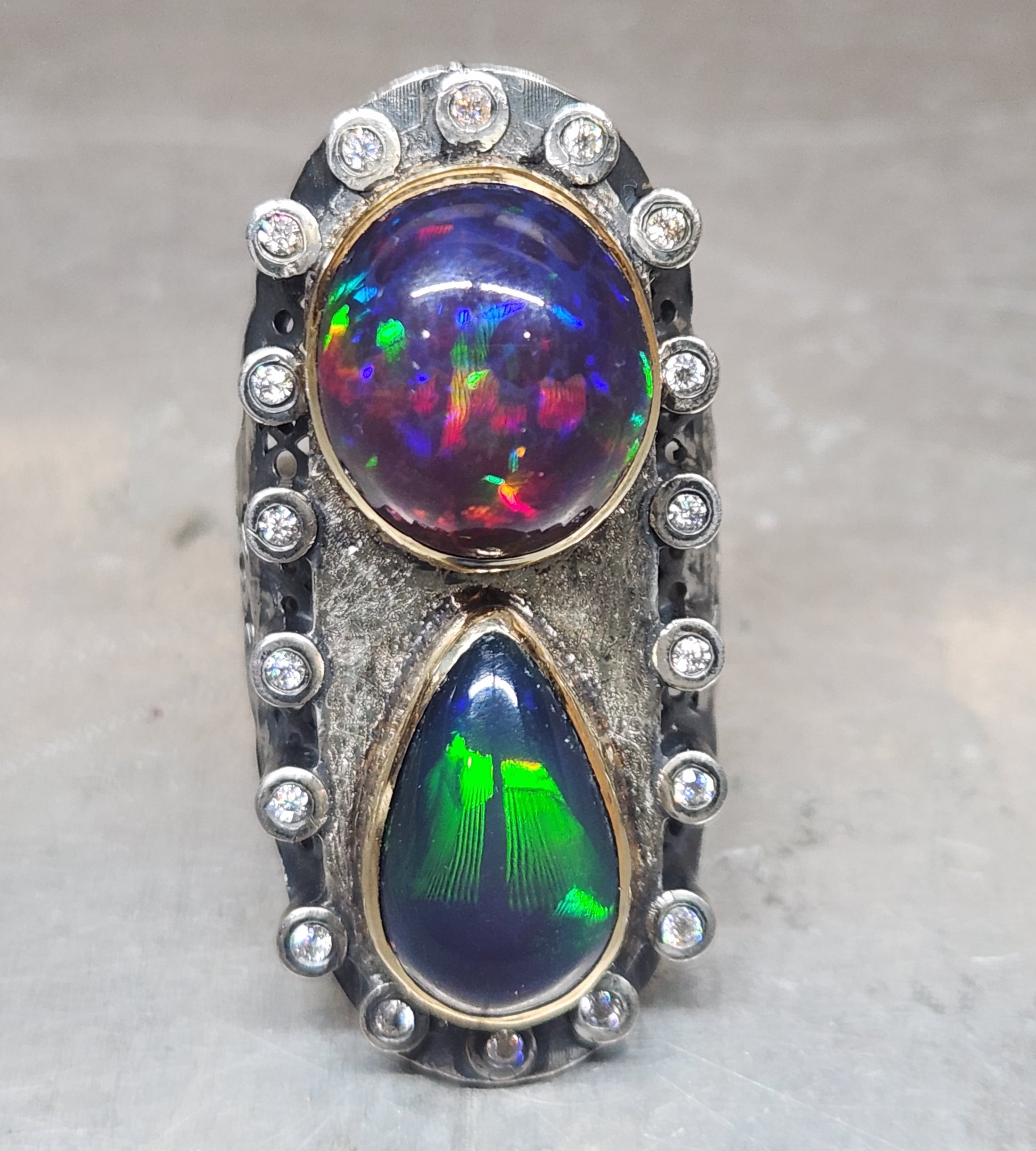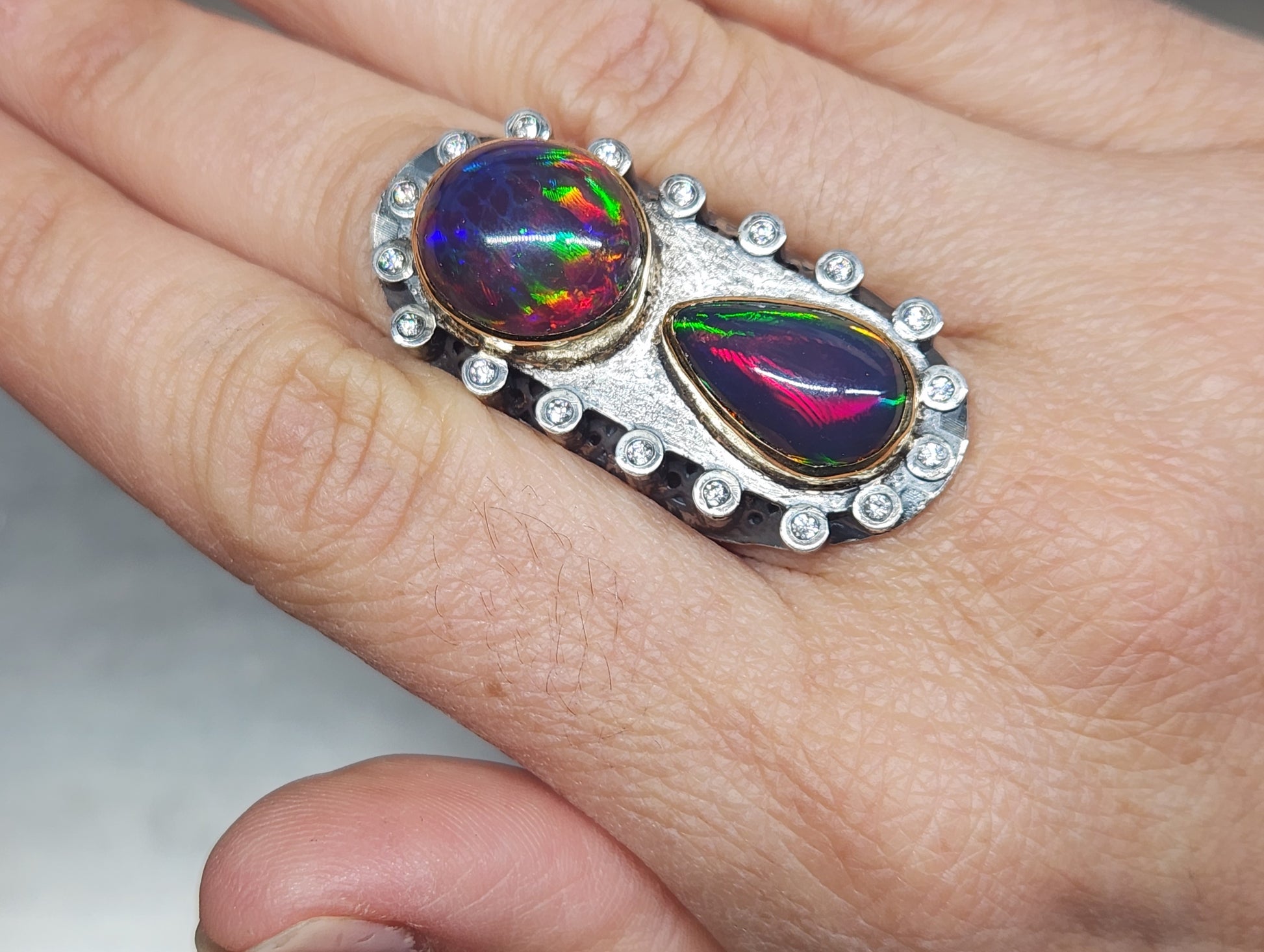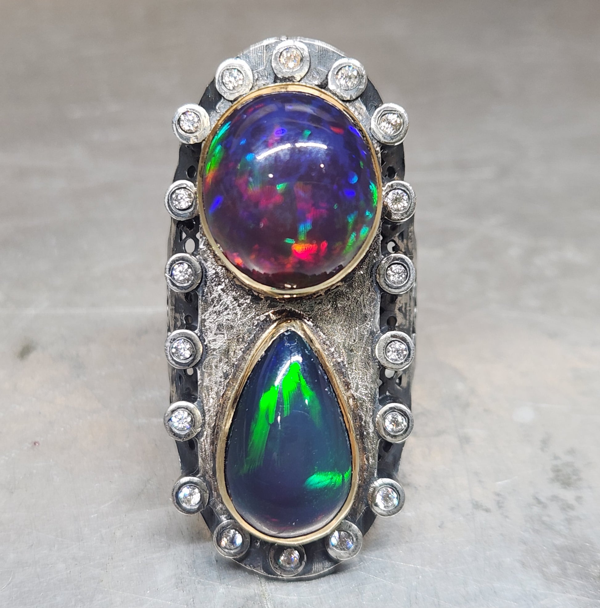 Two bright and colorful Ethiopian opals , set in a Sterling Silver ring with 14k gold bezels. The opals are surrounded by moissanite accent stones.