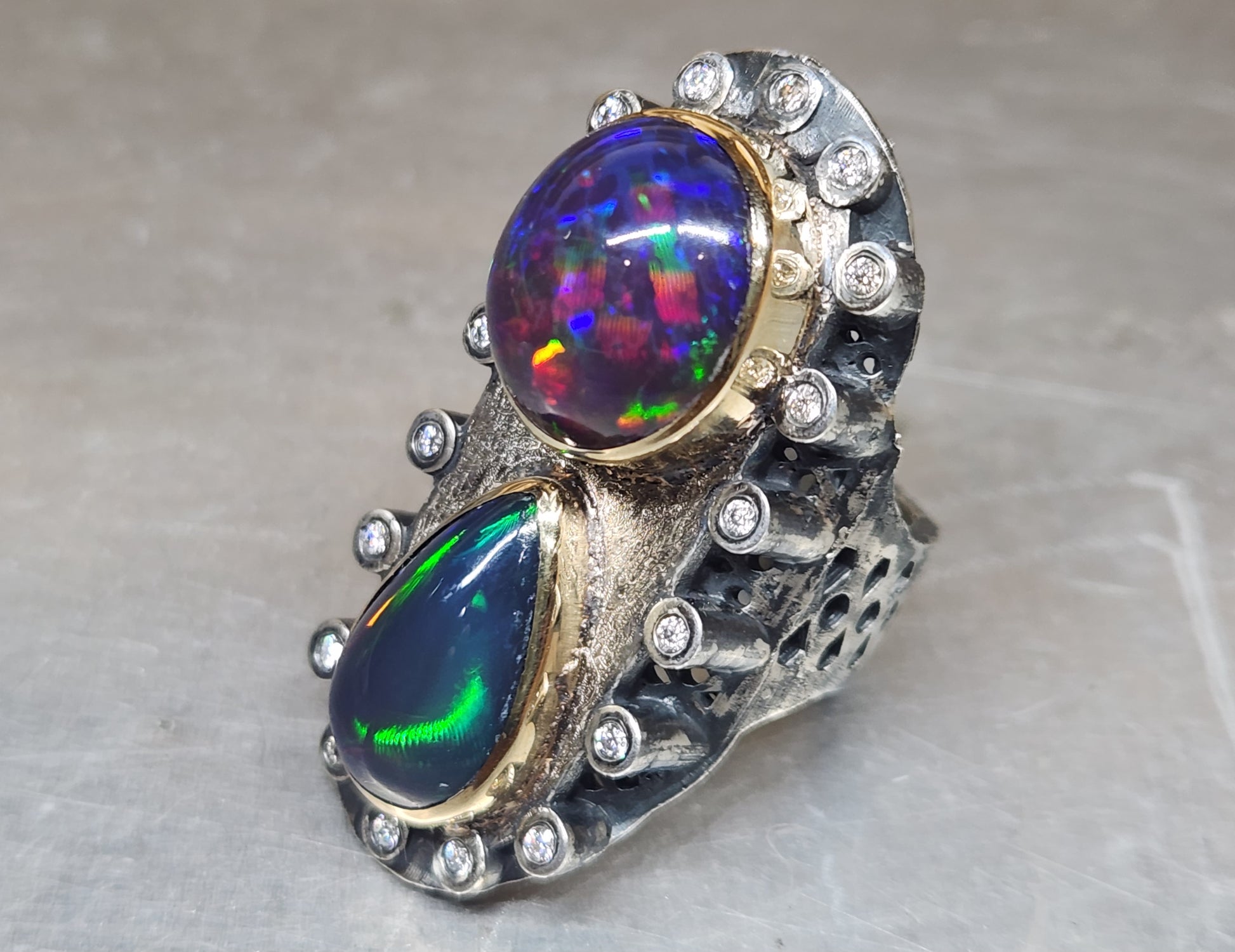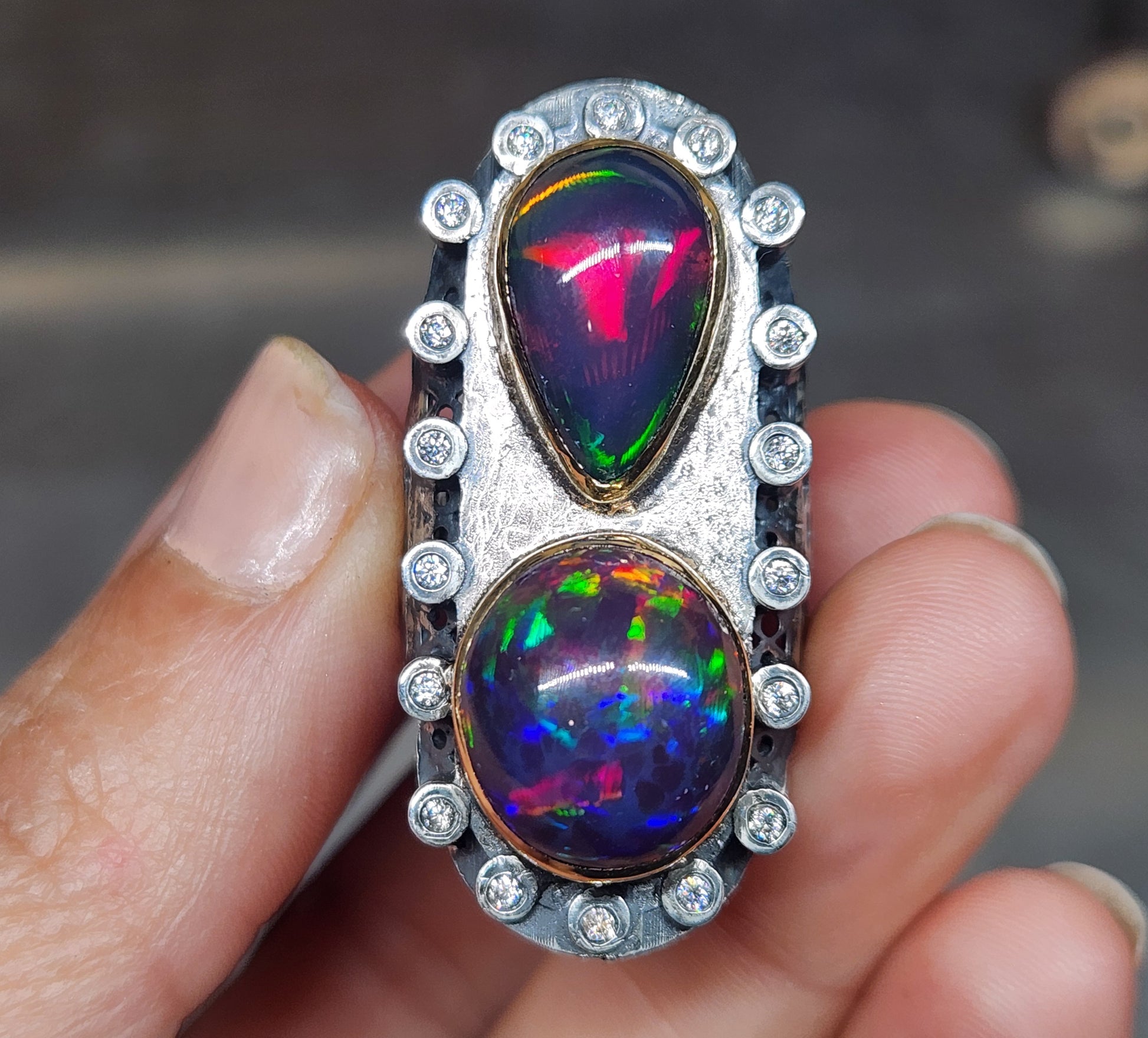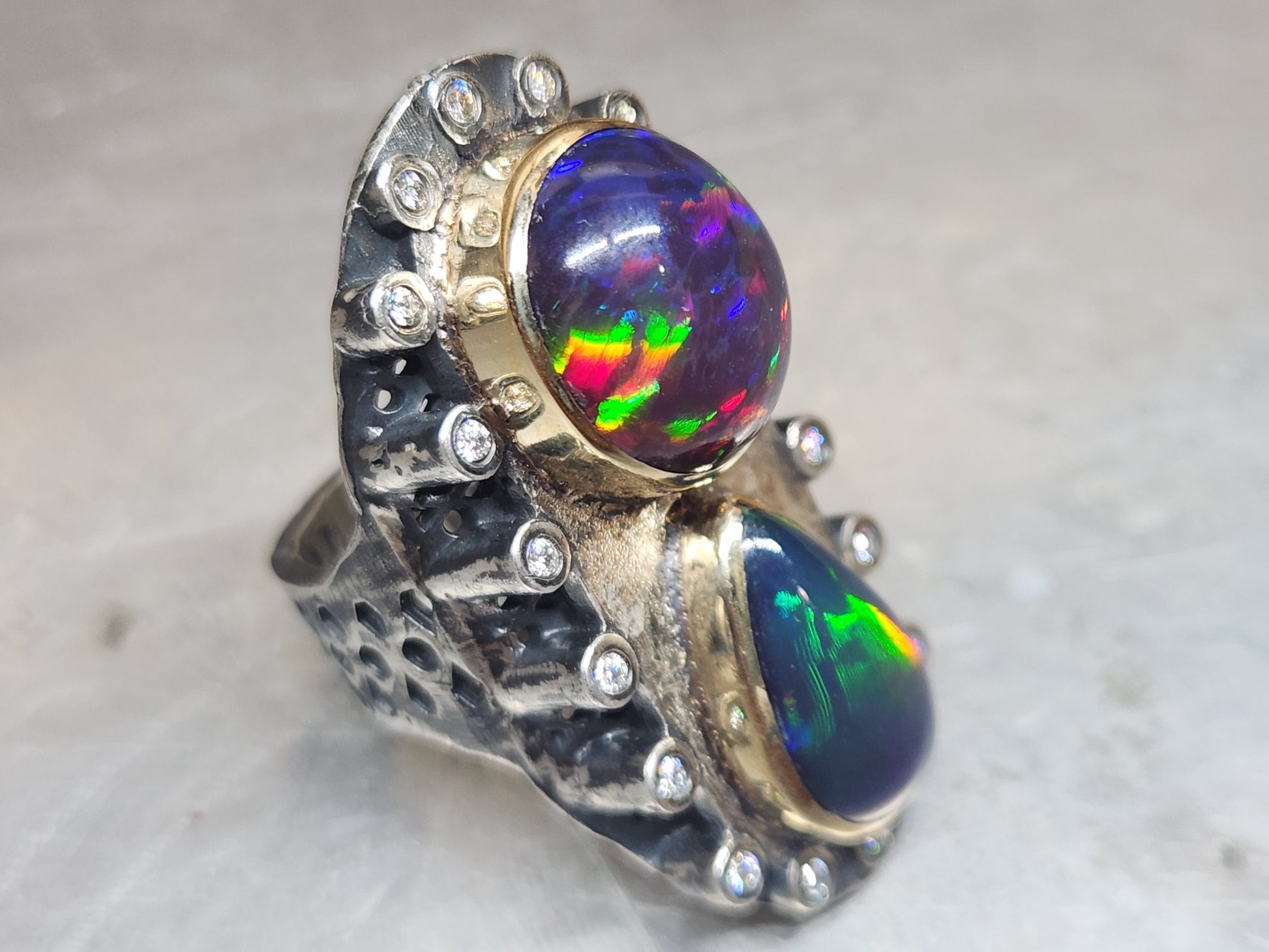 Two bright and colorful Ethiopian opals , set in a Sterling Silver ring with 14k gold bezels. The opals are surrounded by moissanite accent stones.