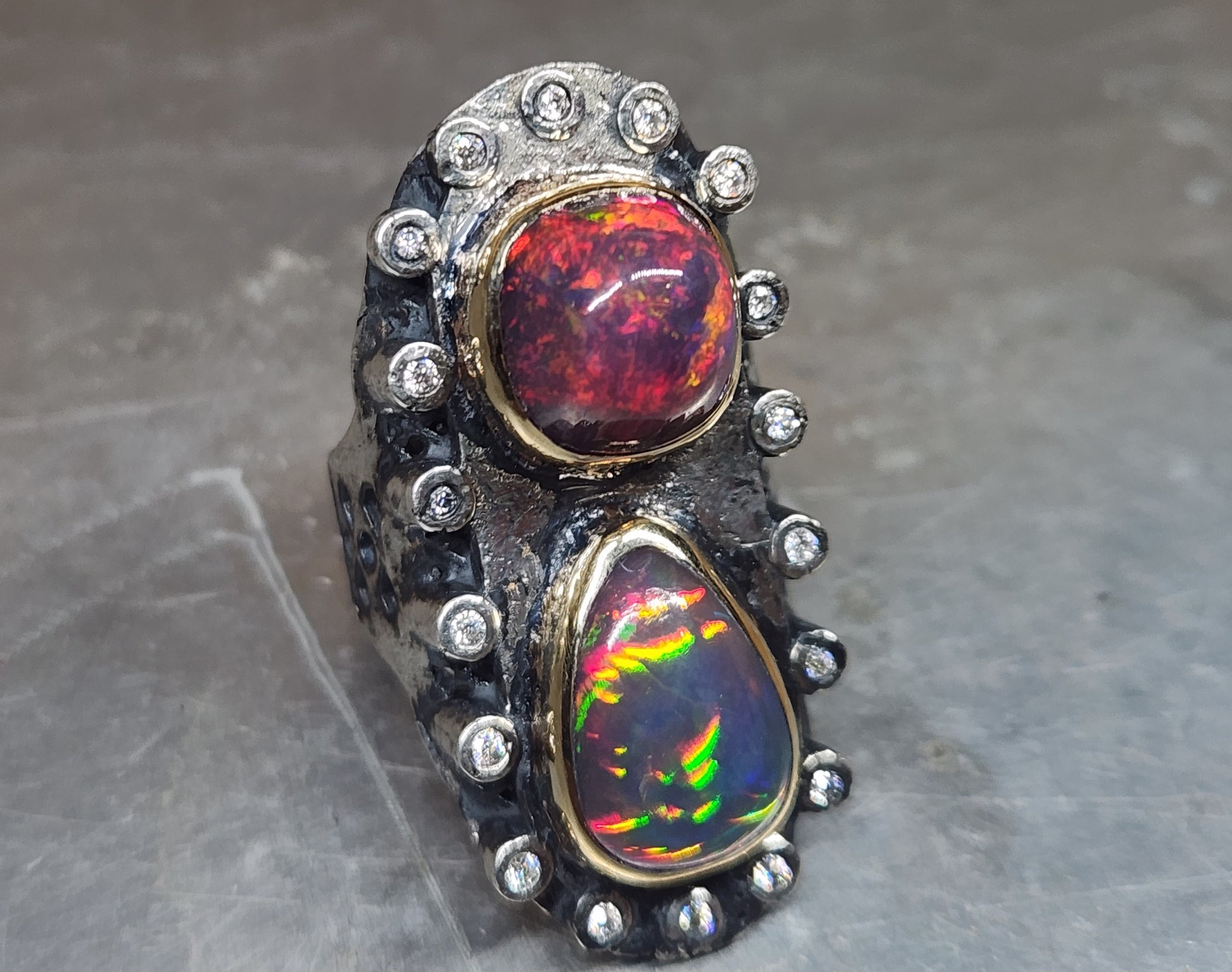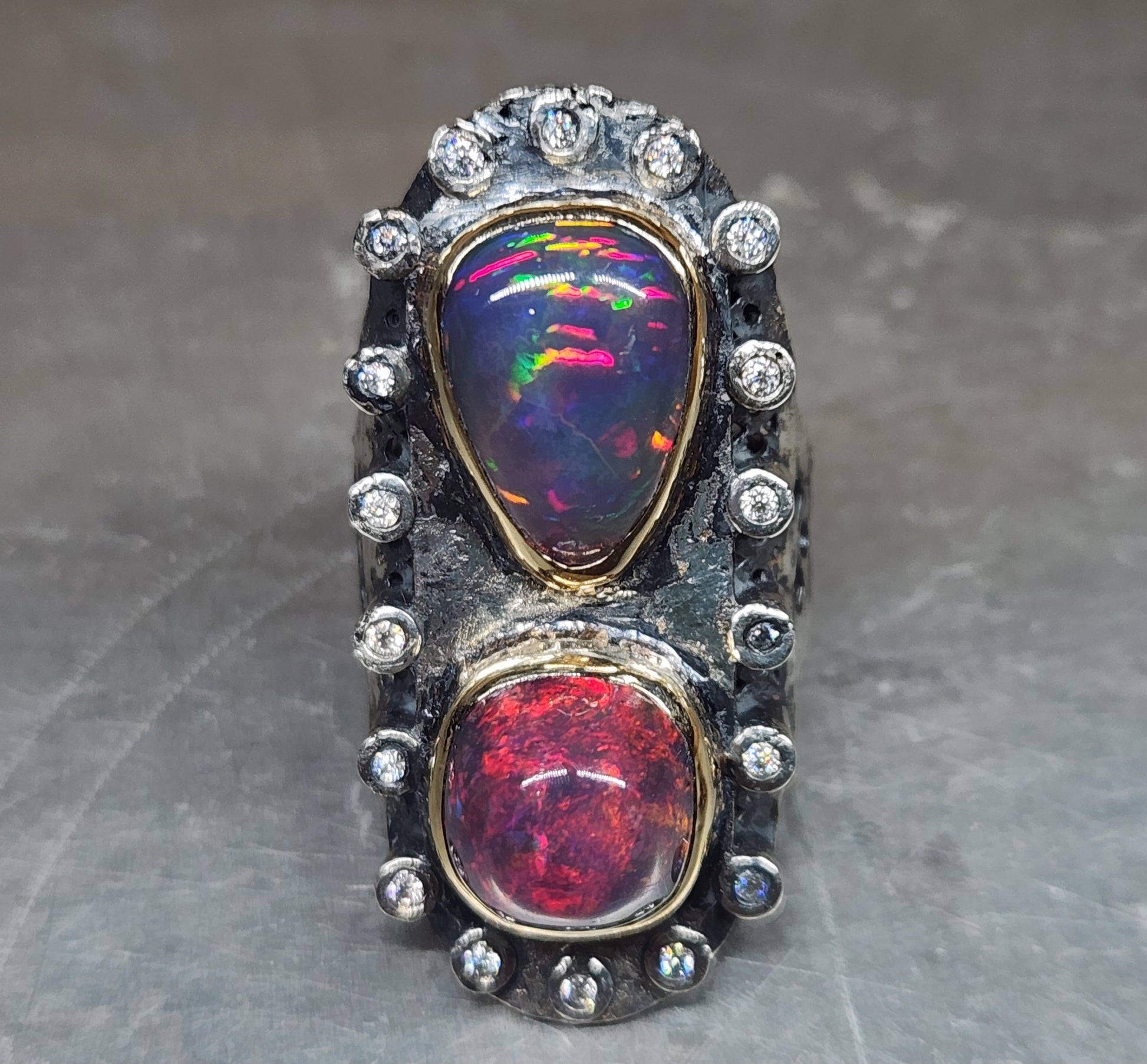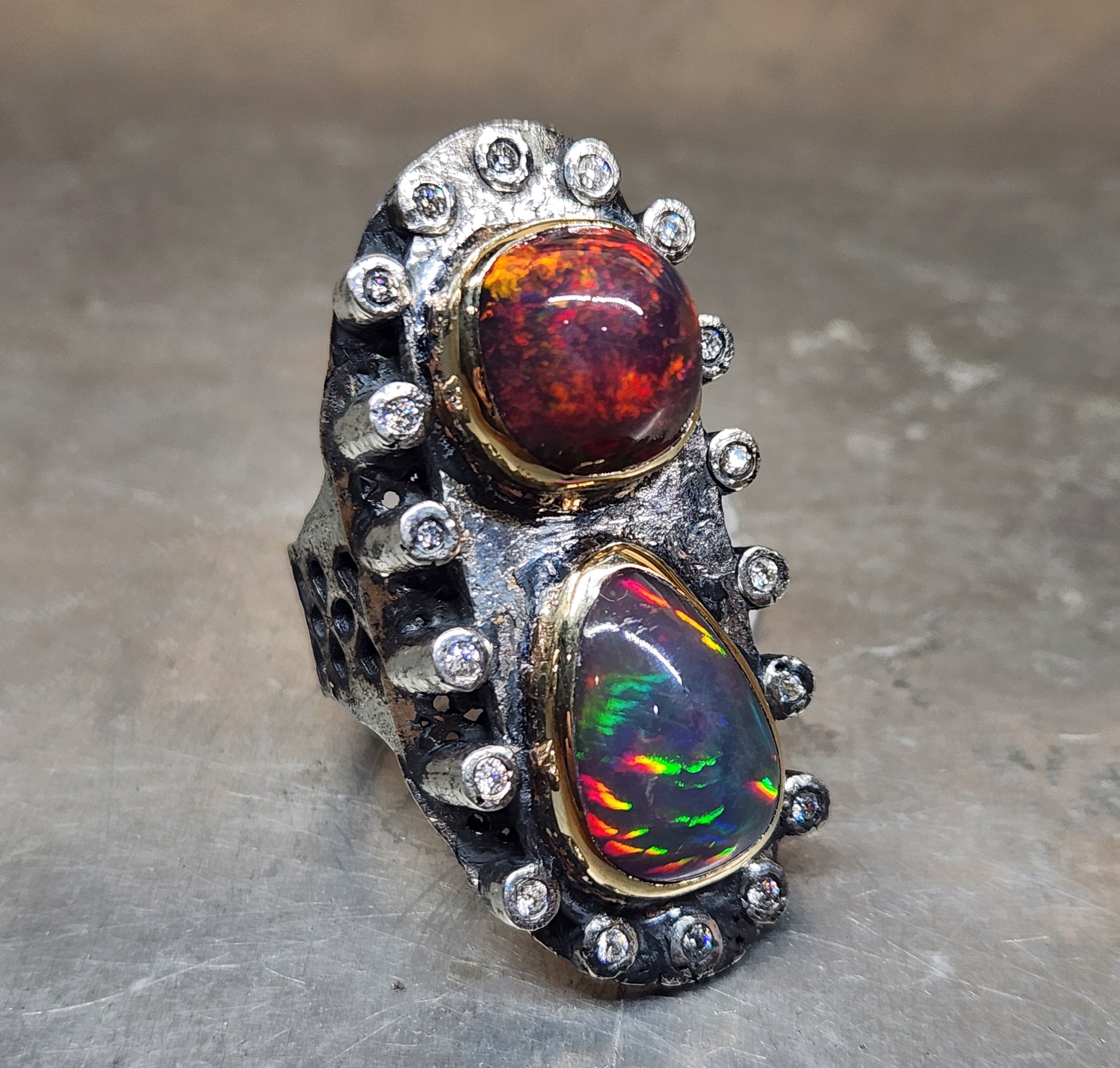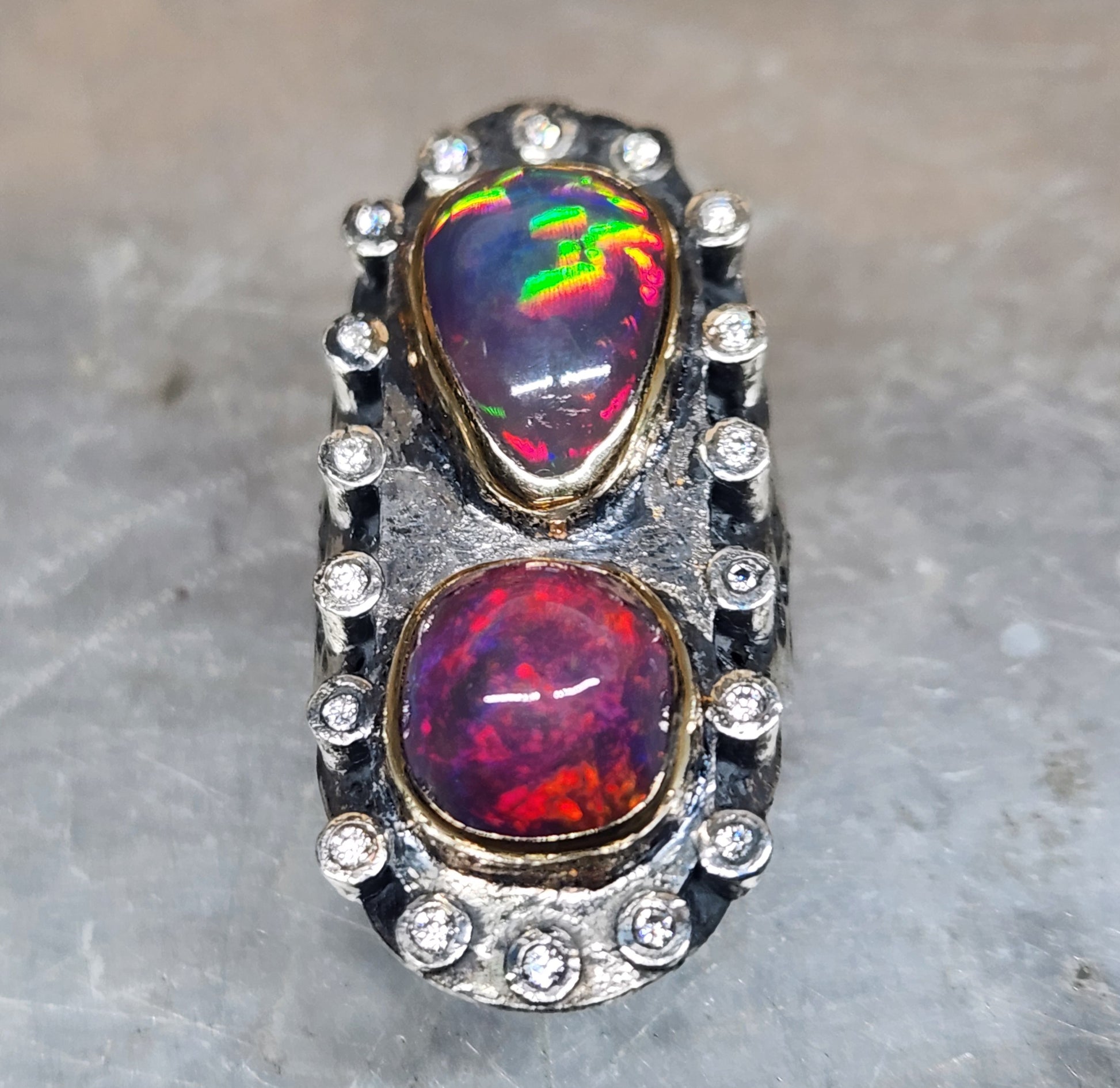 Two bright and colorful Ethiopian opals , set in a Sterling Silver ring with 14k gold bezels. The opals are surrounded by moissanite accent stones.