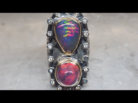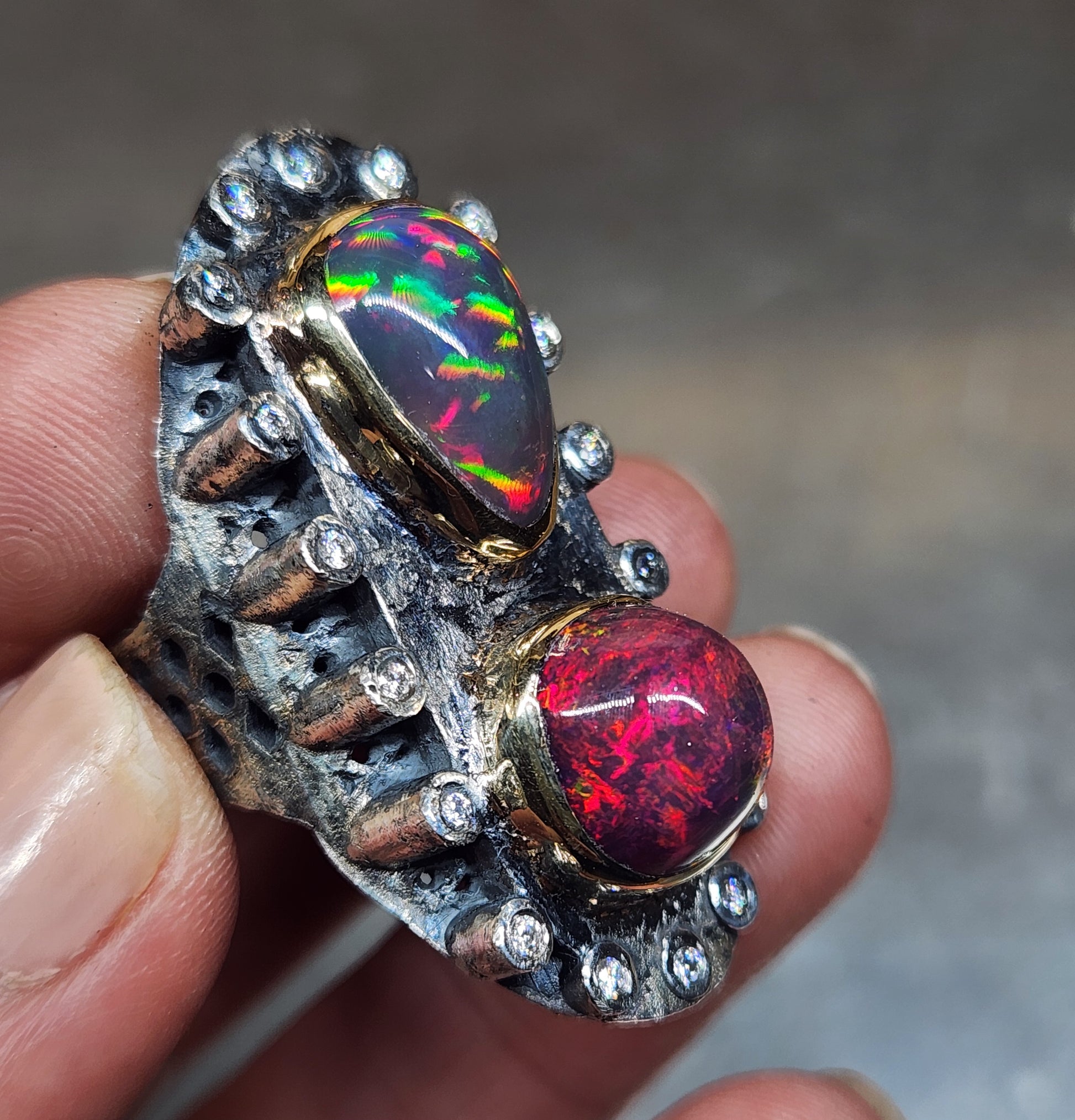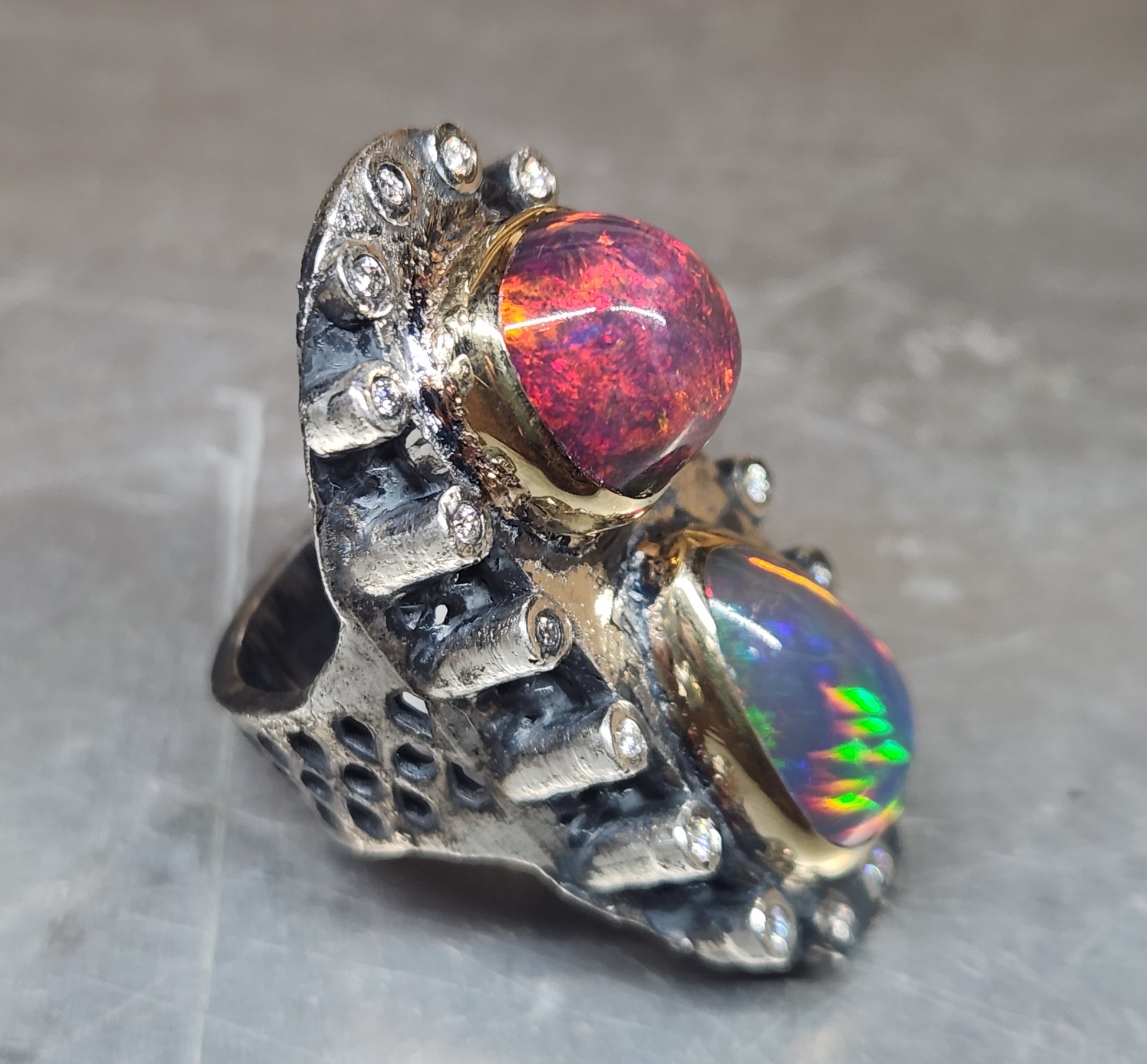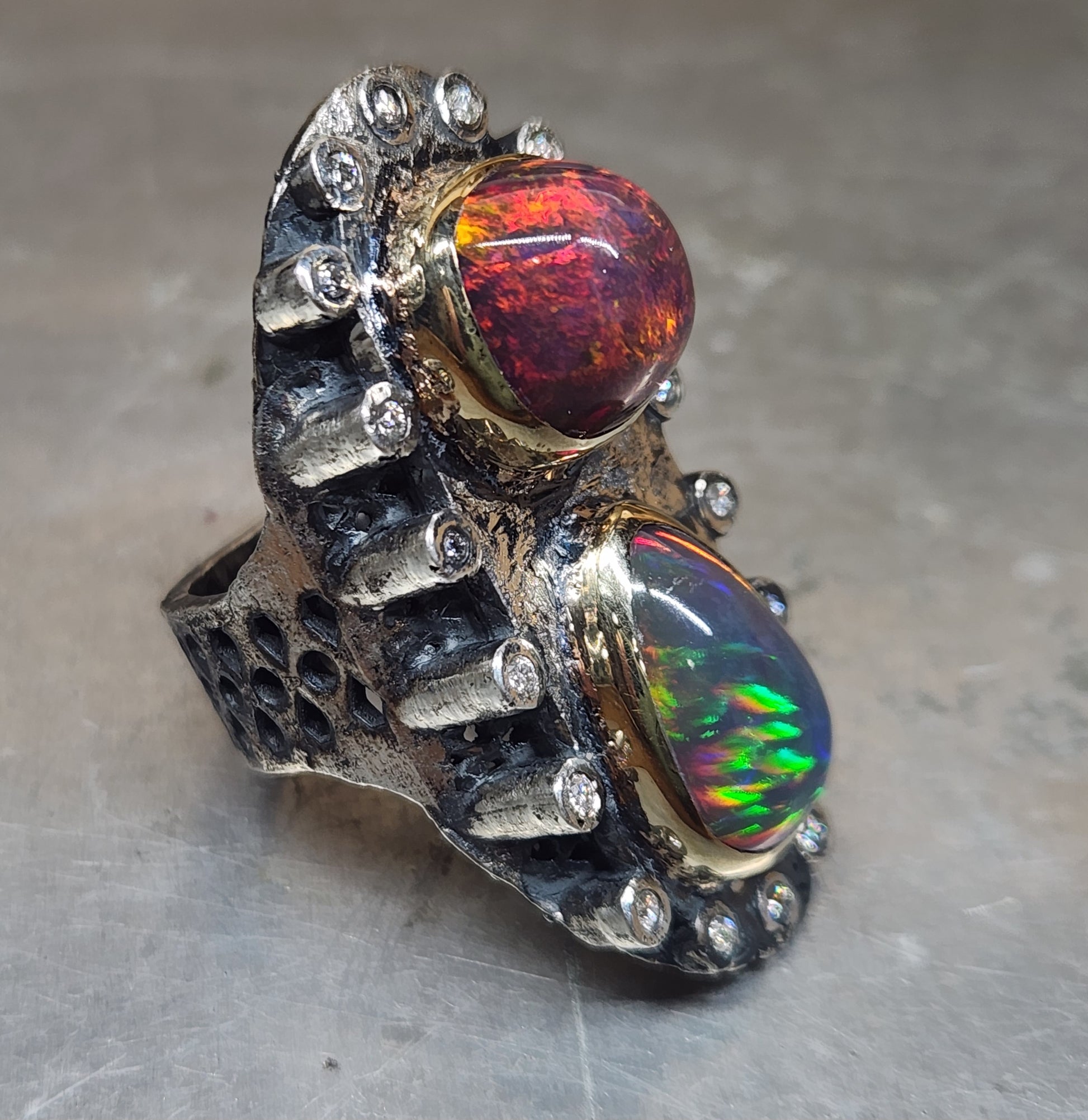 Two bright and colorful Ethiopian opals , set in a Sterling Silver ring with 14k gold bezels. The opals are surrounded by moissanite accent stones.