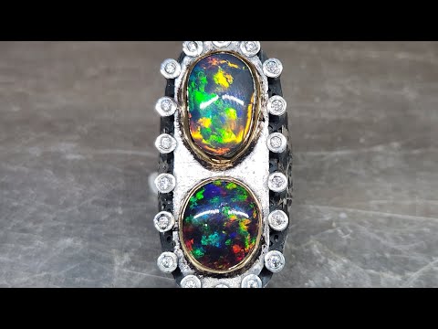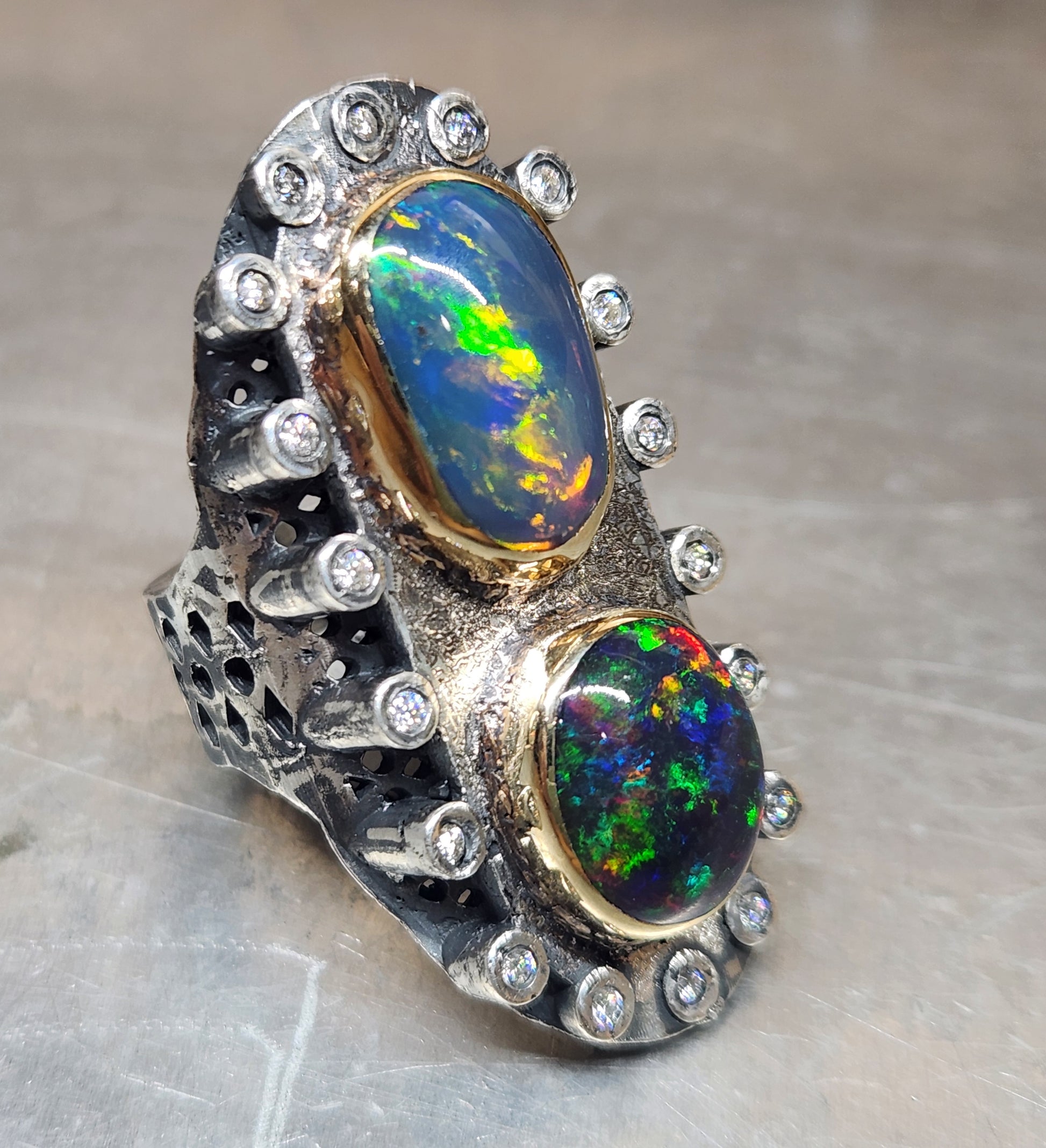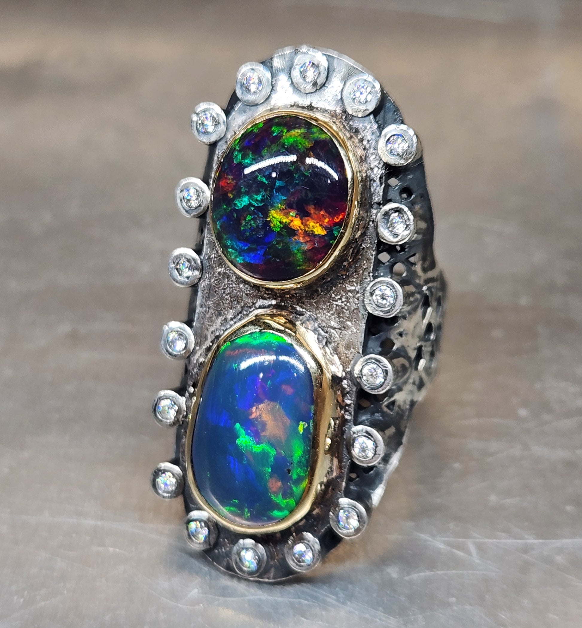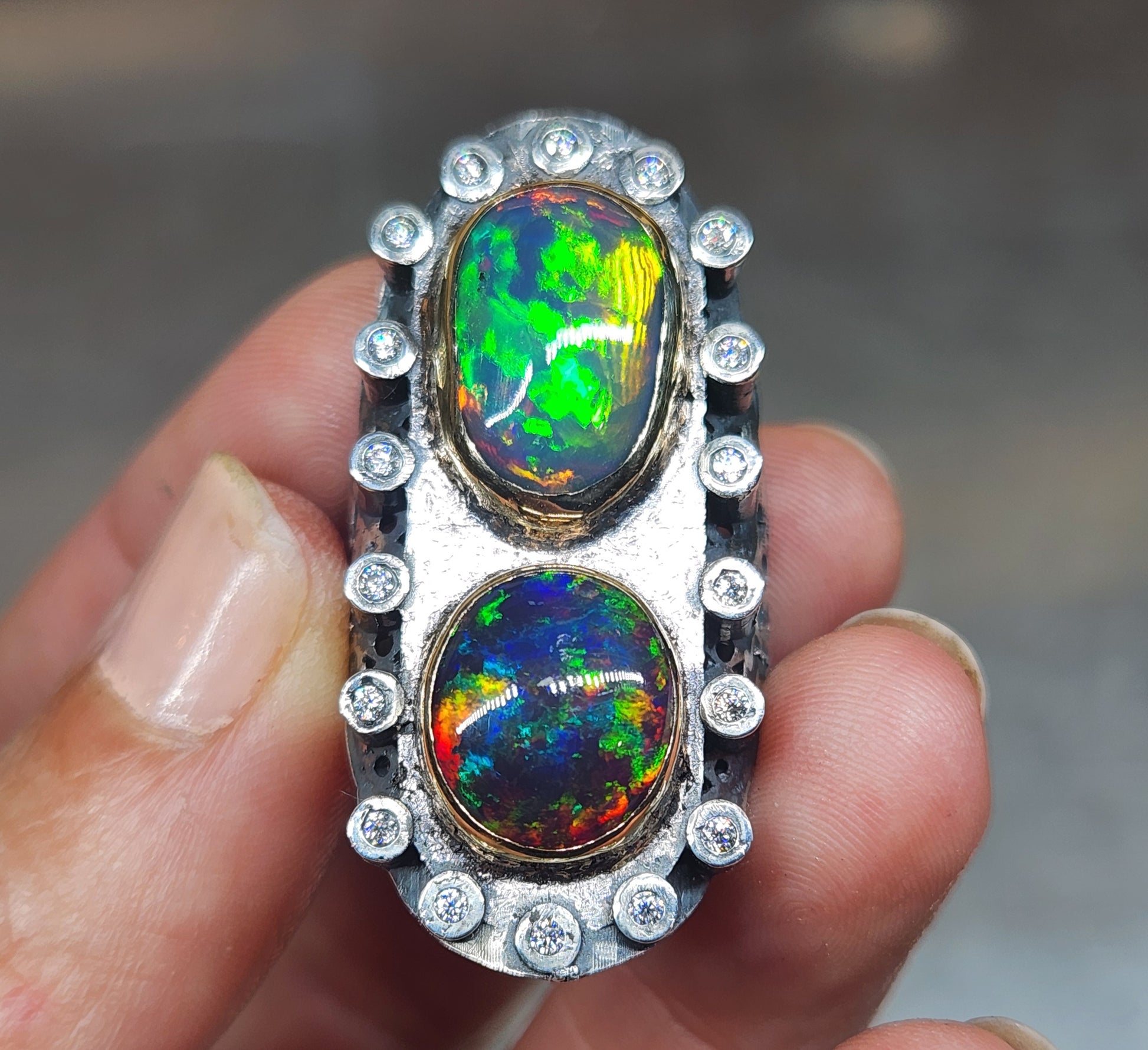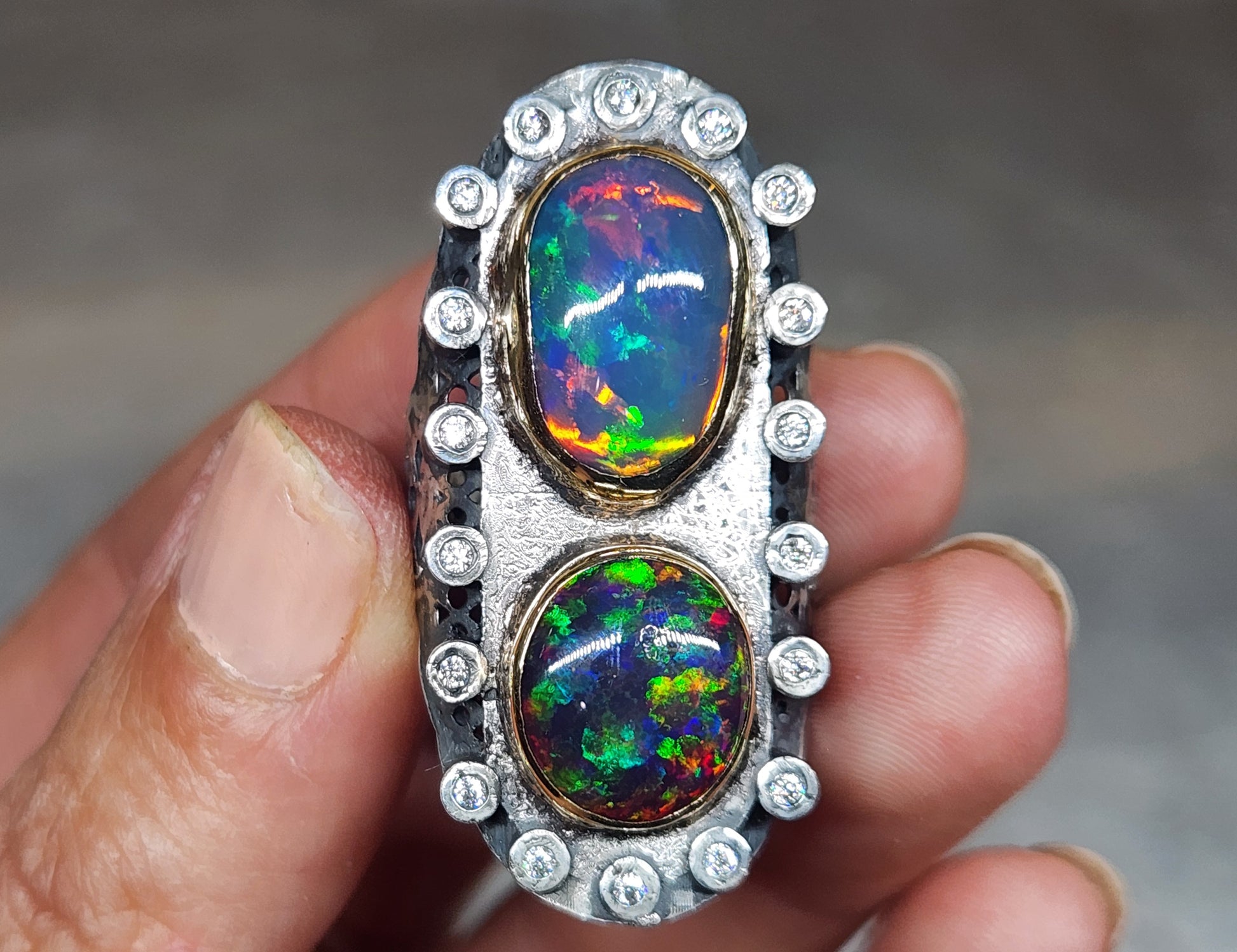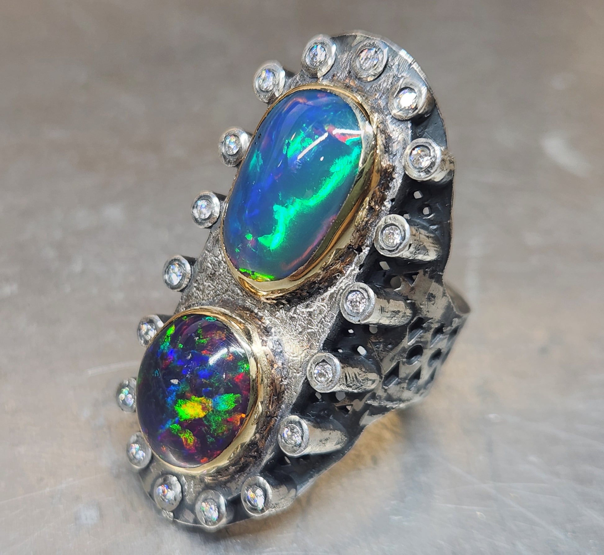 Two bright and colorful Ethiopian opals , set in a Sterling Silver ring with 14k gold bezels. The opals are surrounded by moissanite accent stones.