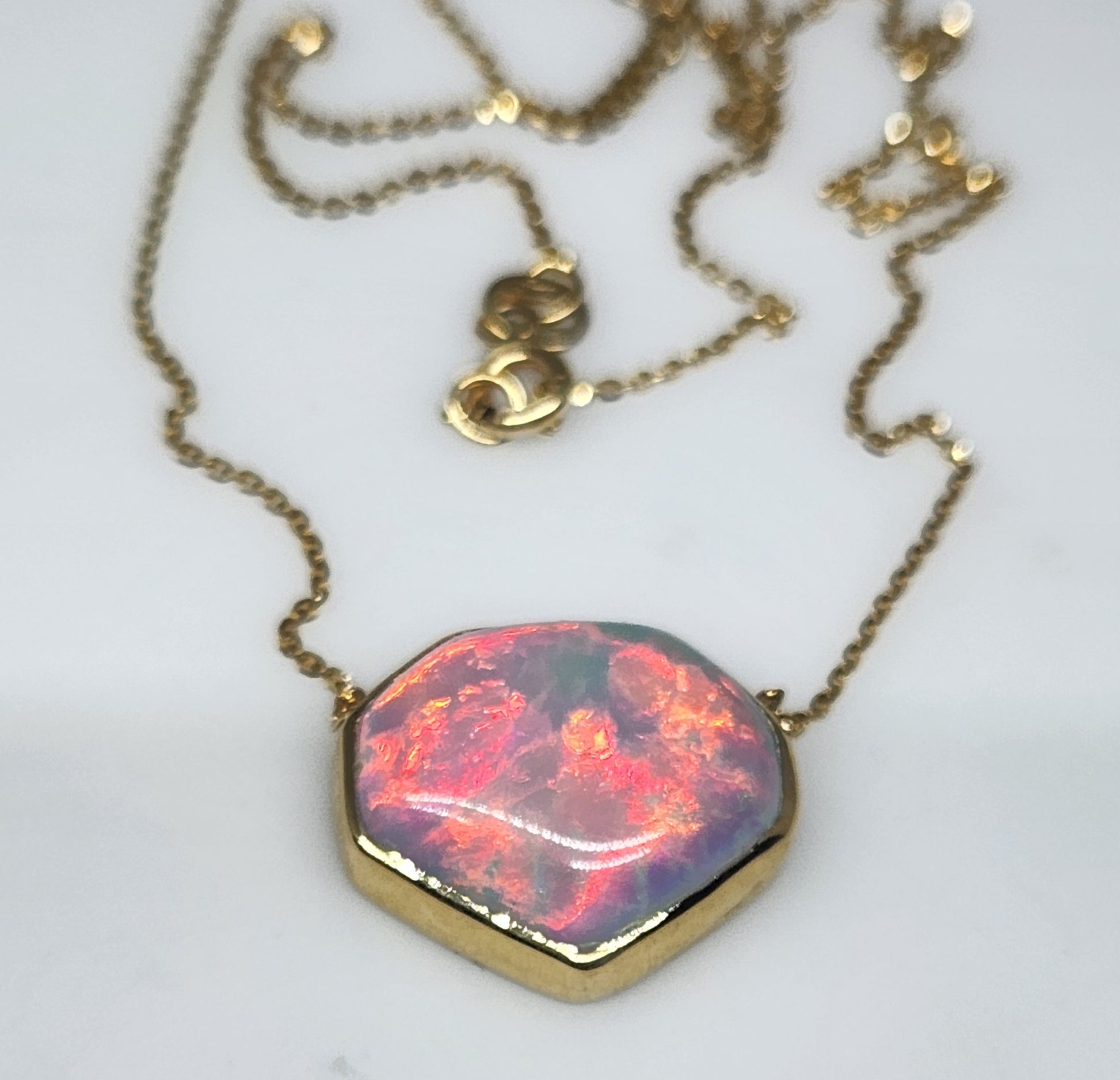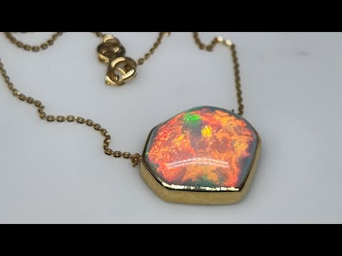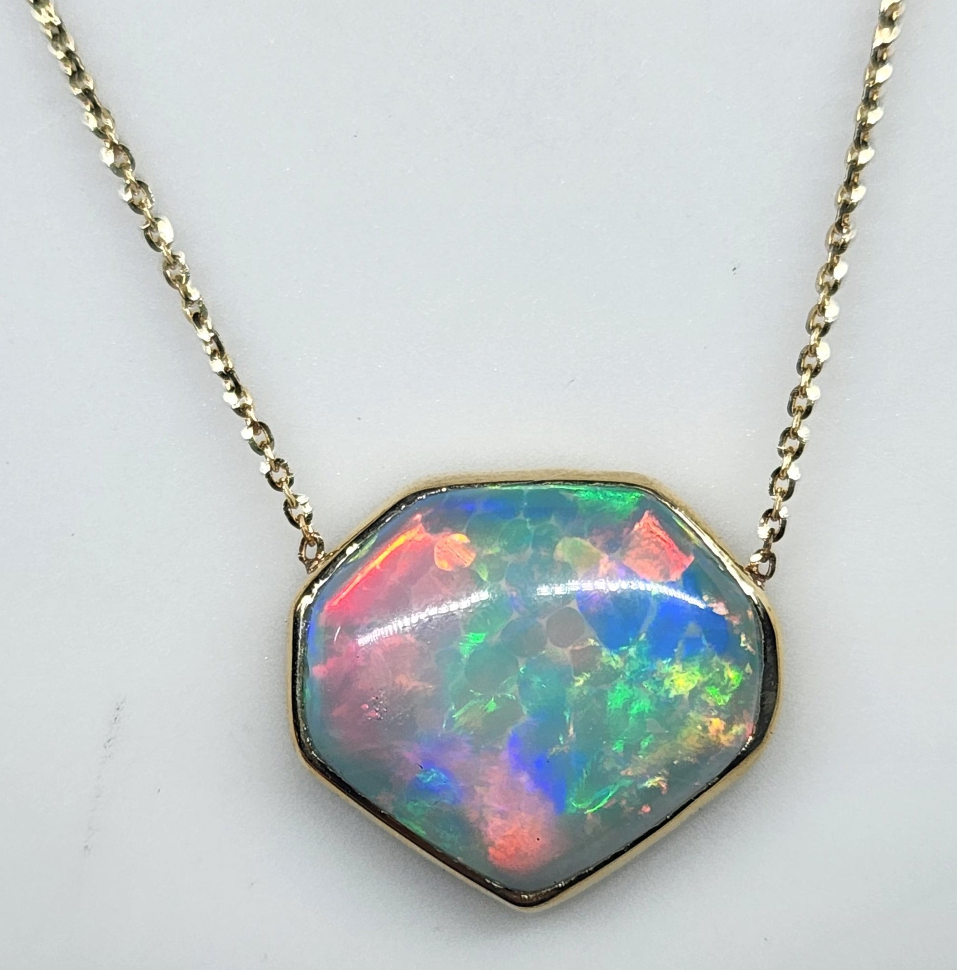 A colorful natural cabochon opal with bright blue, green and bold red fire, set in 14k yellow gold with a split chain.