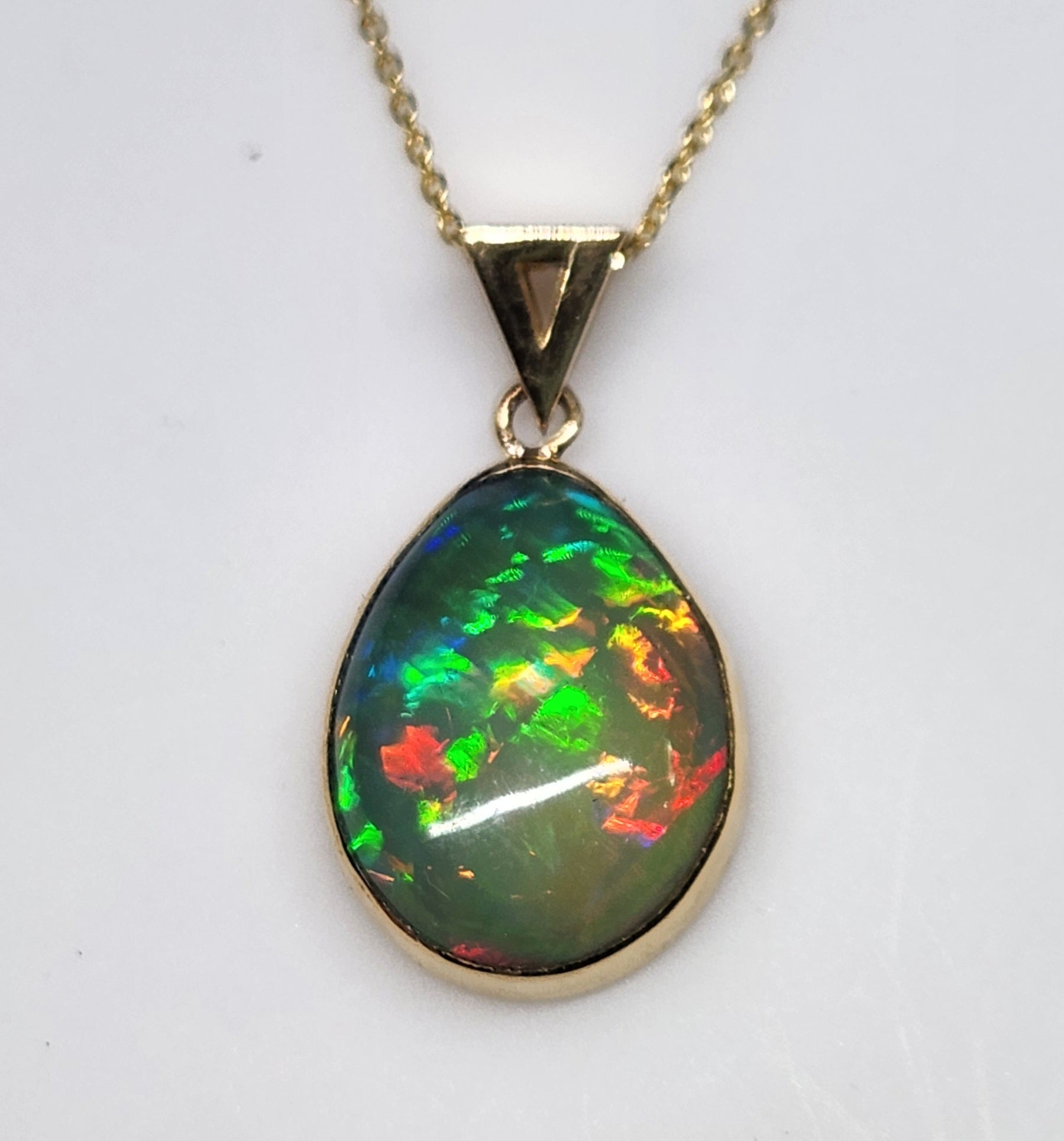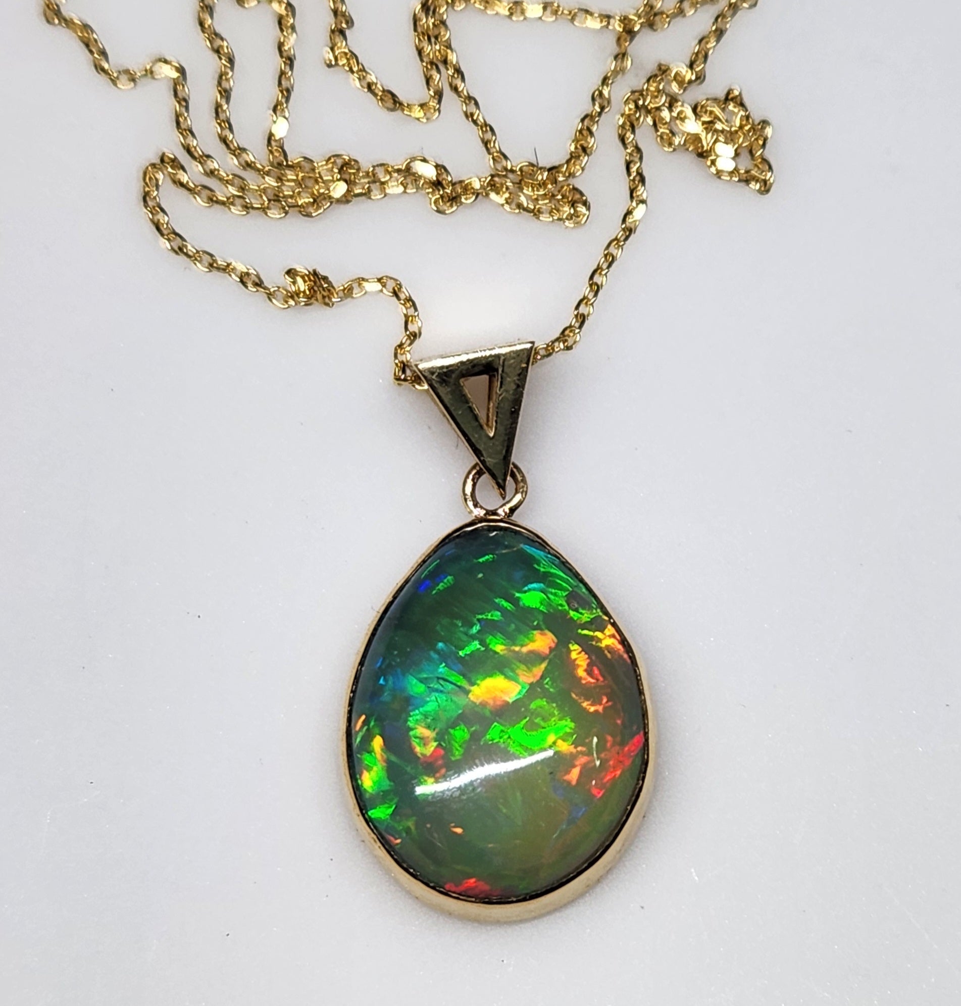 A bright colorful opal with green and red fire, set in 14k yellow gold with a 14k gold chain. The opal is a natural opal made into a doublet (solid gem with backing)