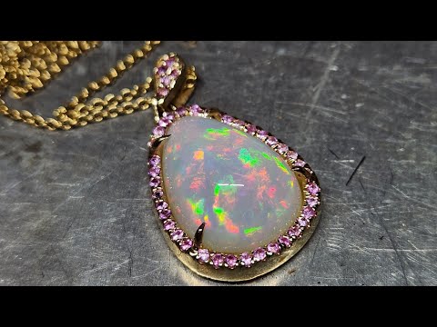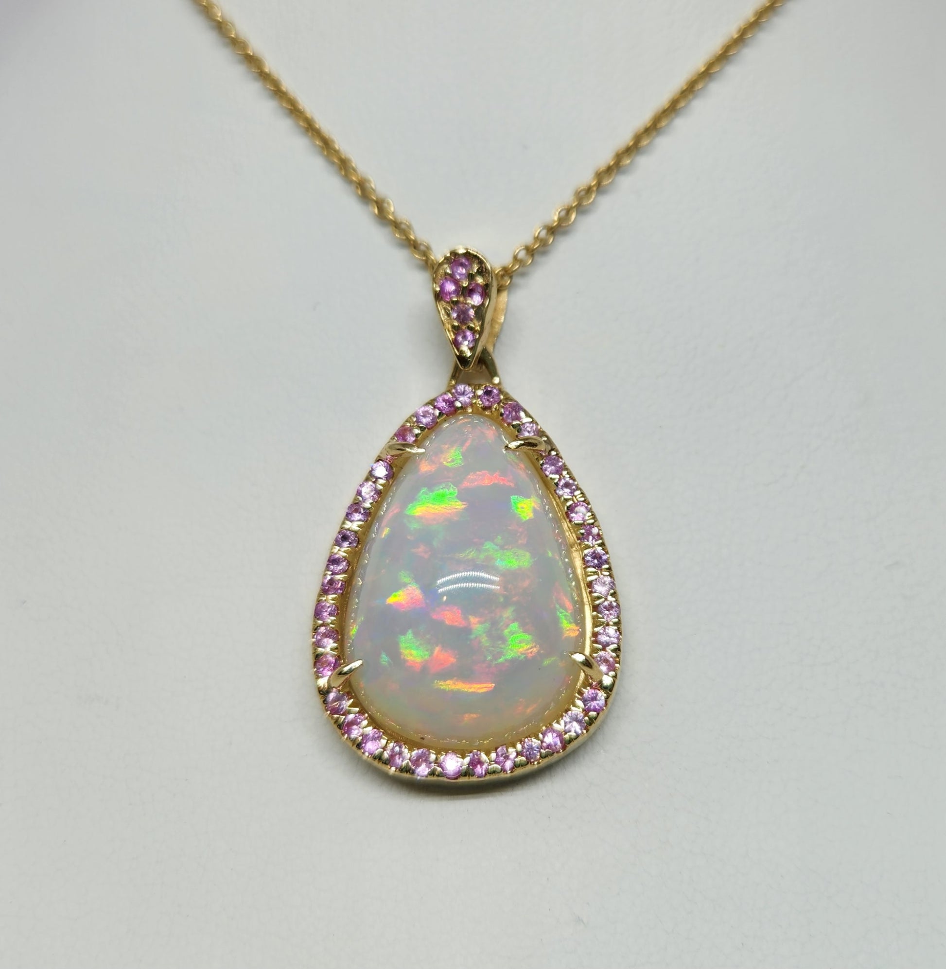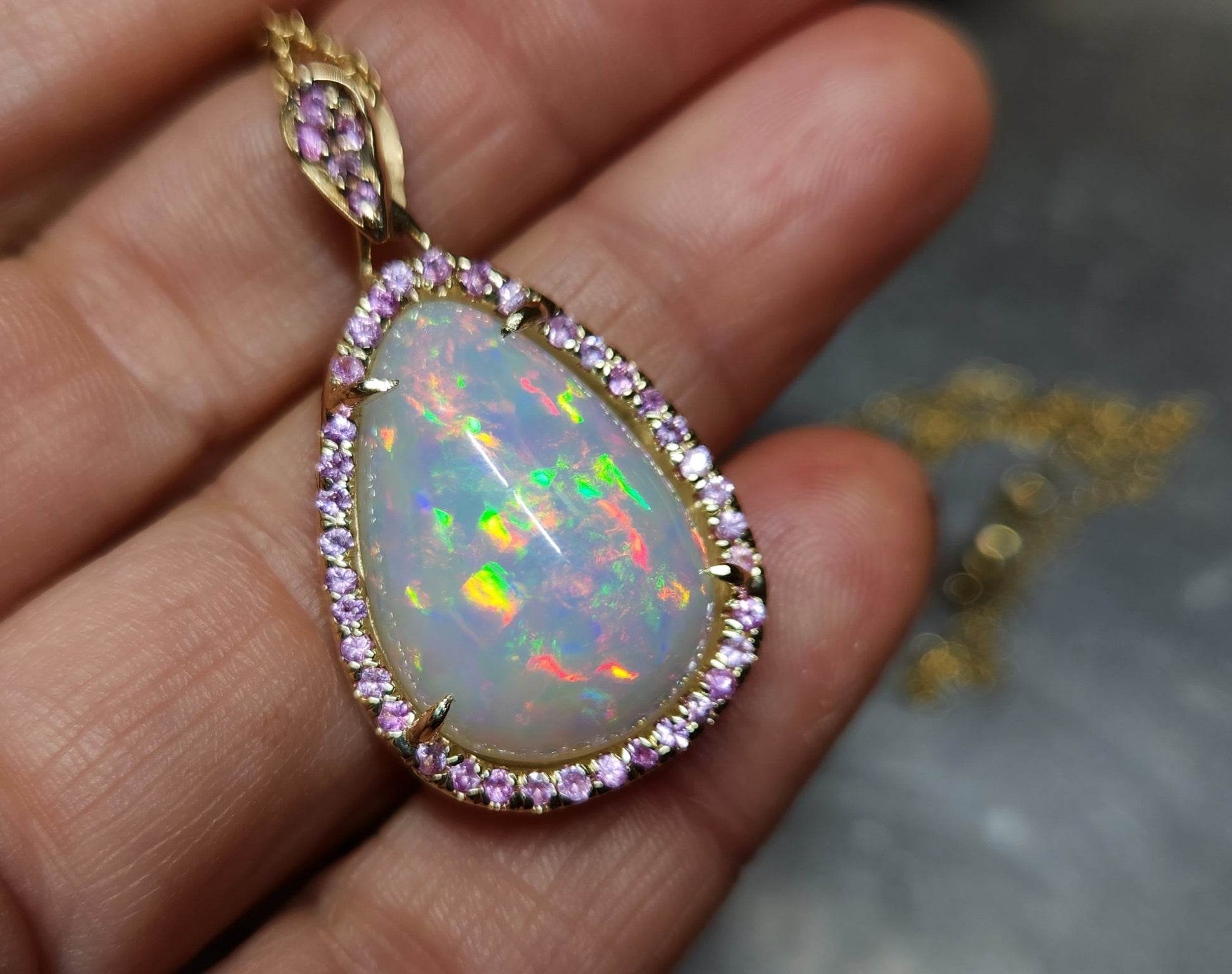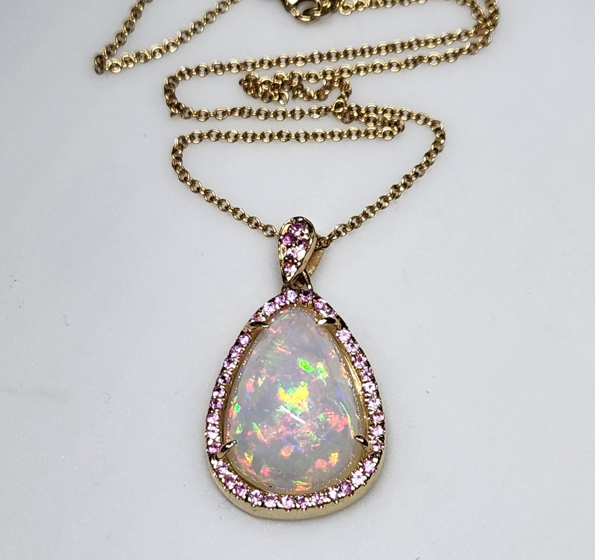 A large, bright and colorful opal with green, red, and yellow fire colors set in 14k yellow gold surrounded by pink sapphires, with a solid 14k gold chain.