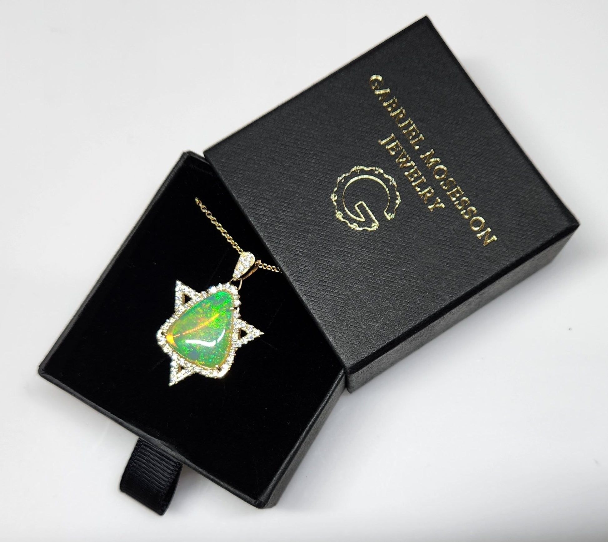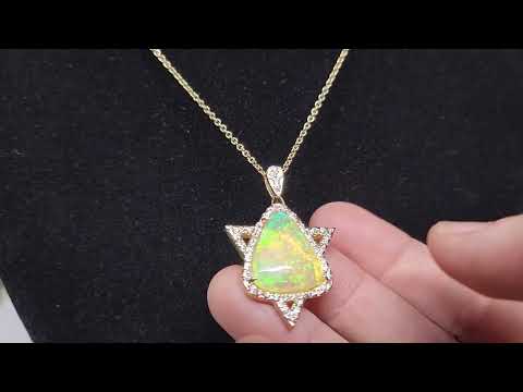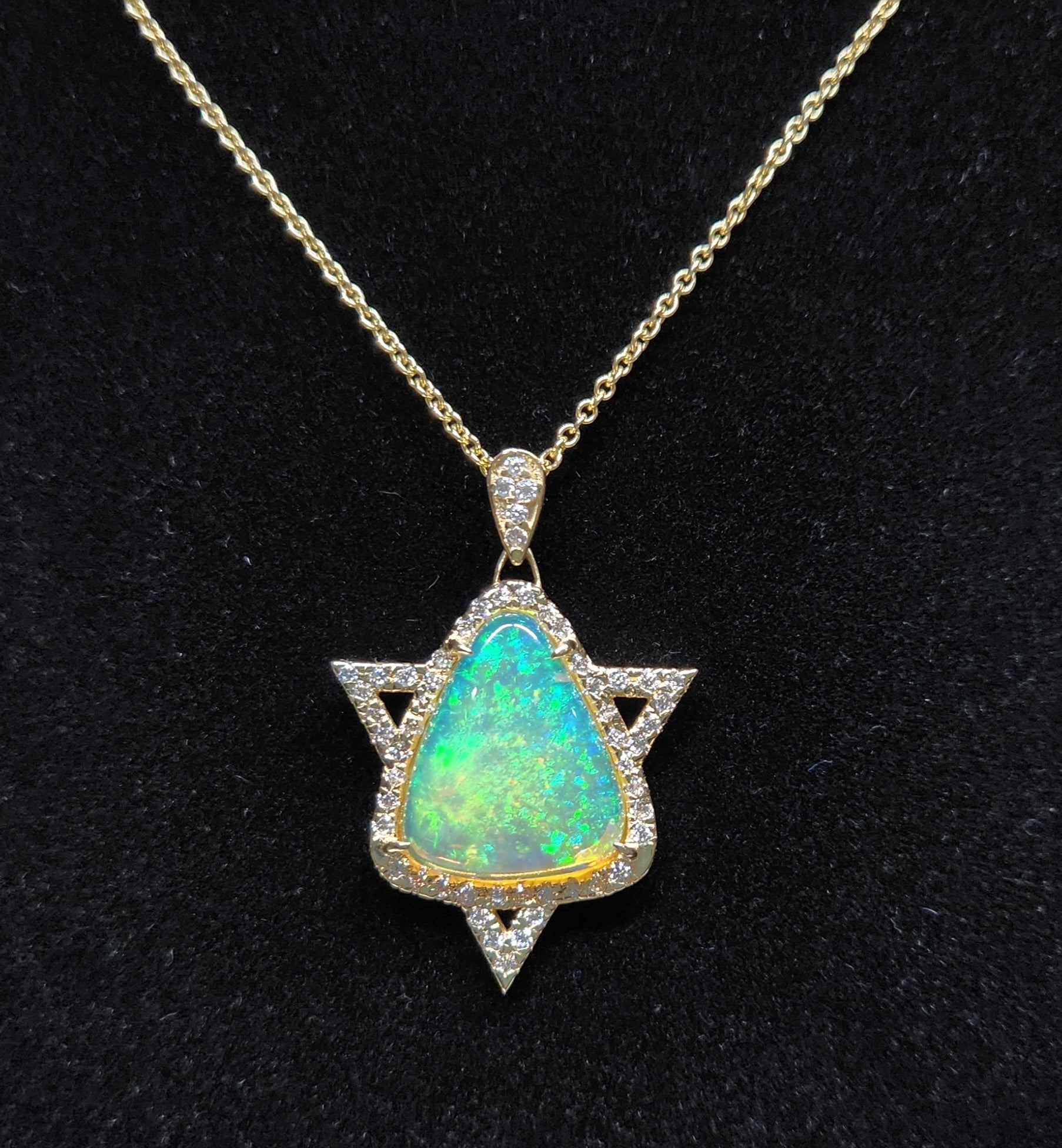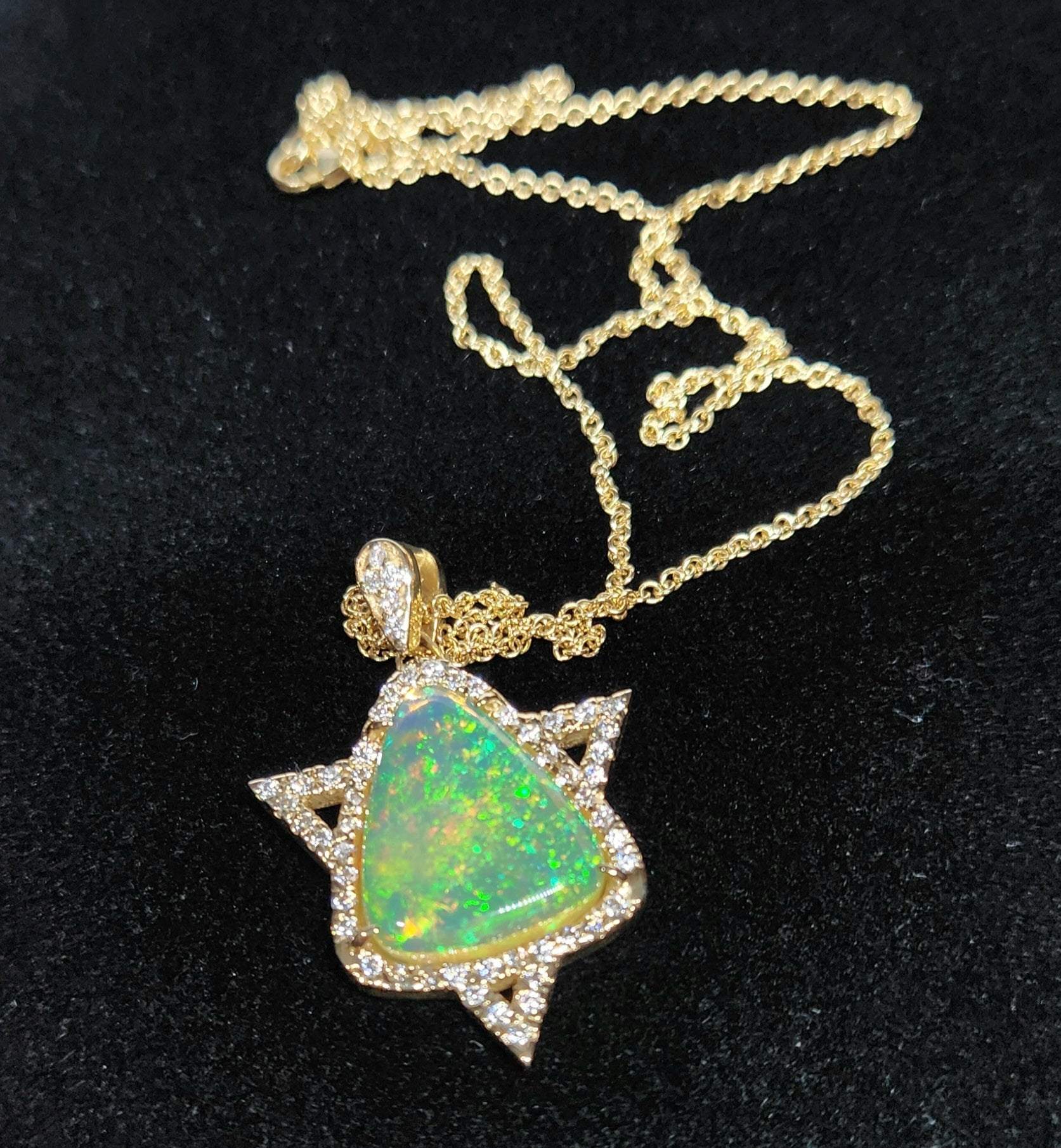A bright and colorful natural opal set in a 14k yellow gold Star of David Pendant. The opal is surrounded by sparking moissanite accents.