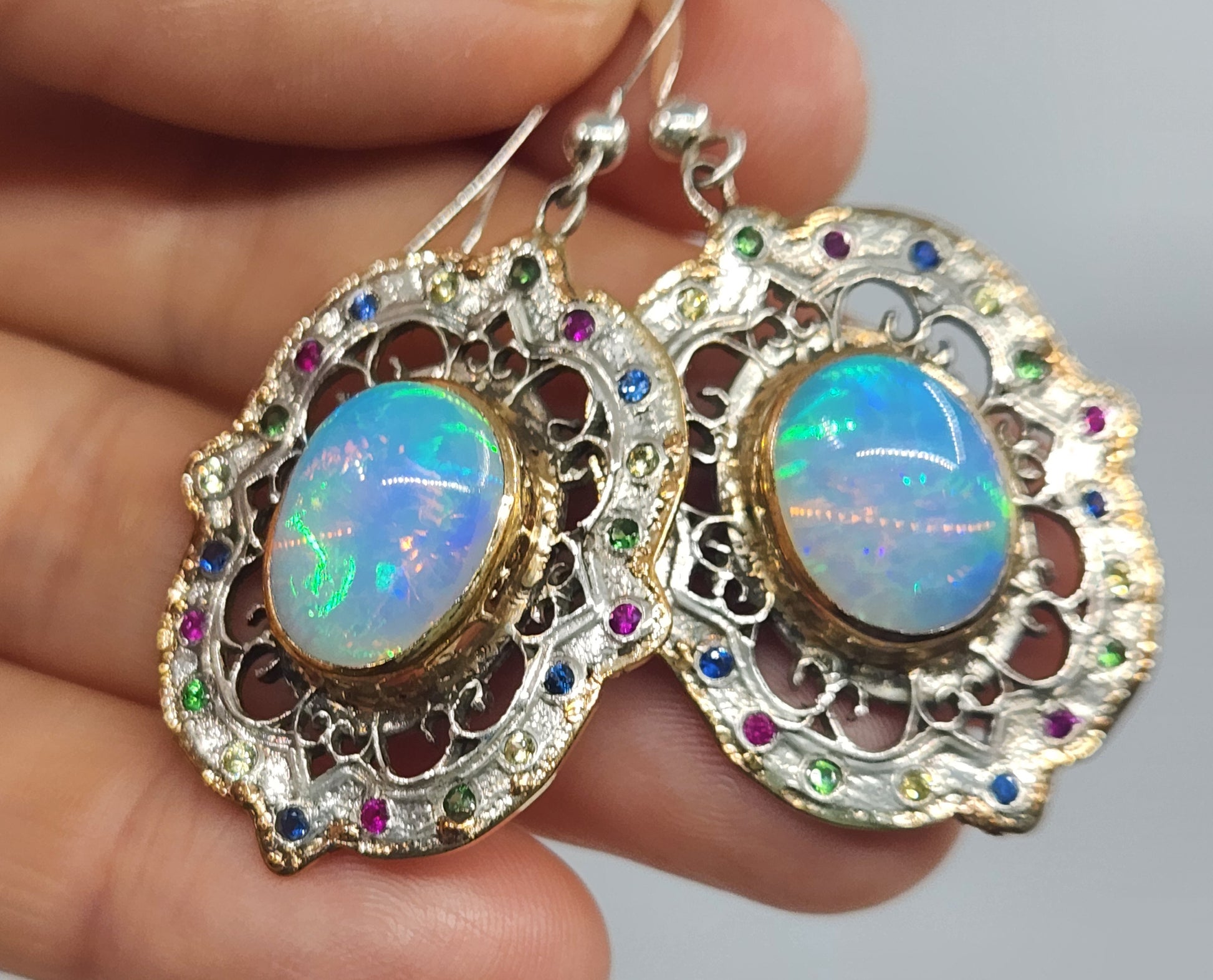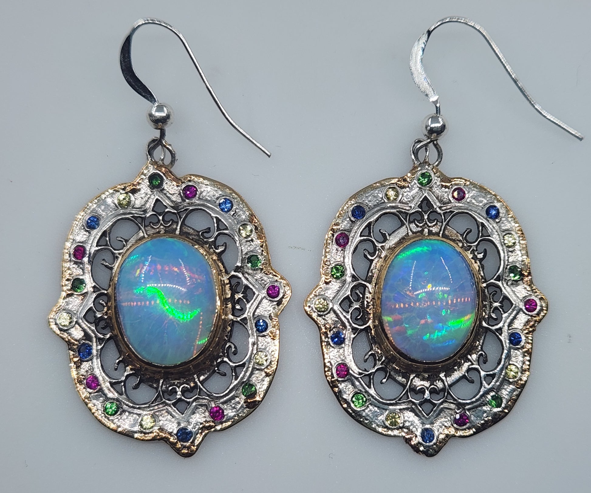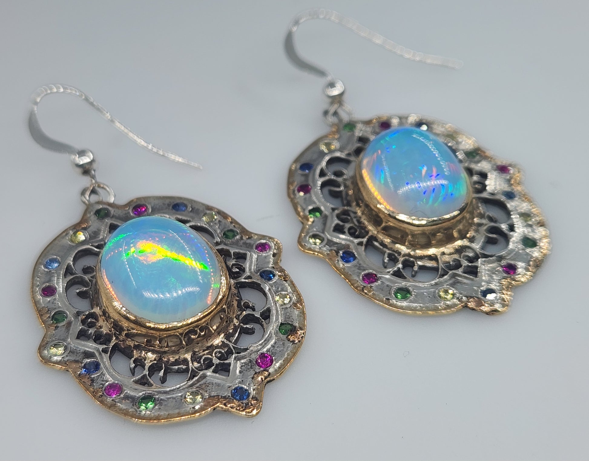 A pair of colorful natural opal cabochons, set in sterling silver and gold fill accent earrings, with color gemstone accent stones.