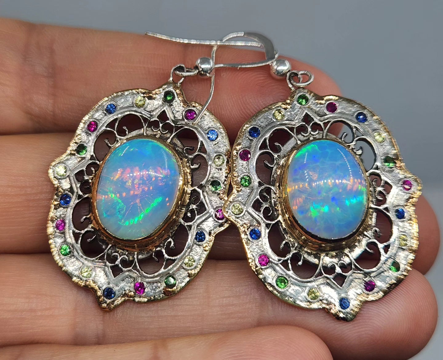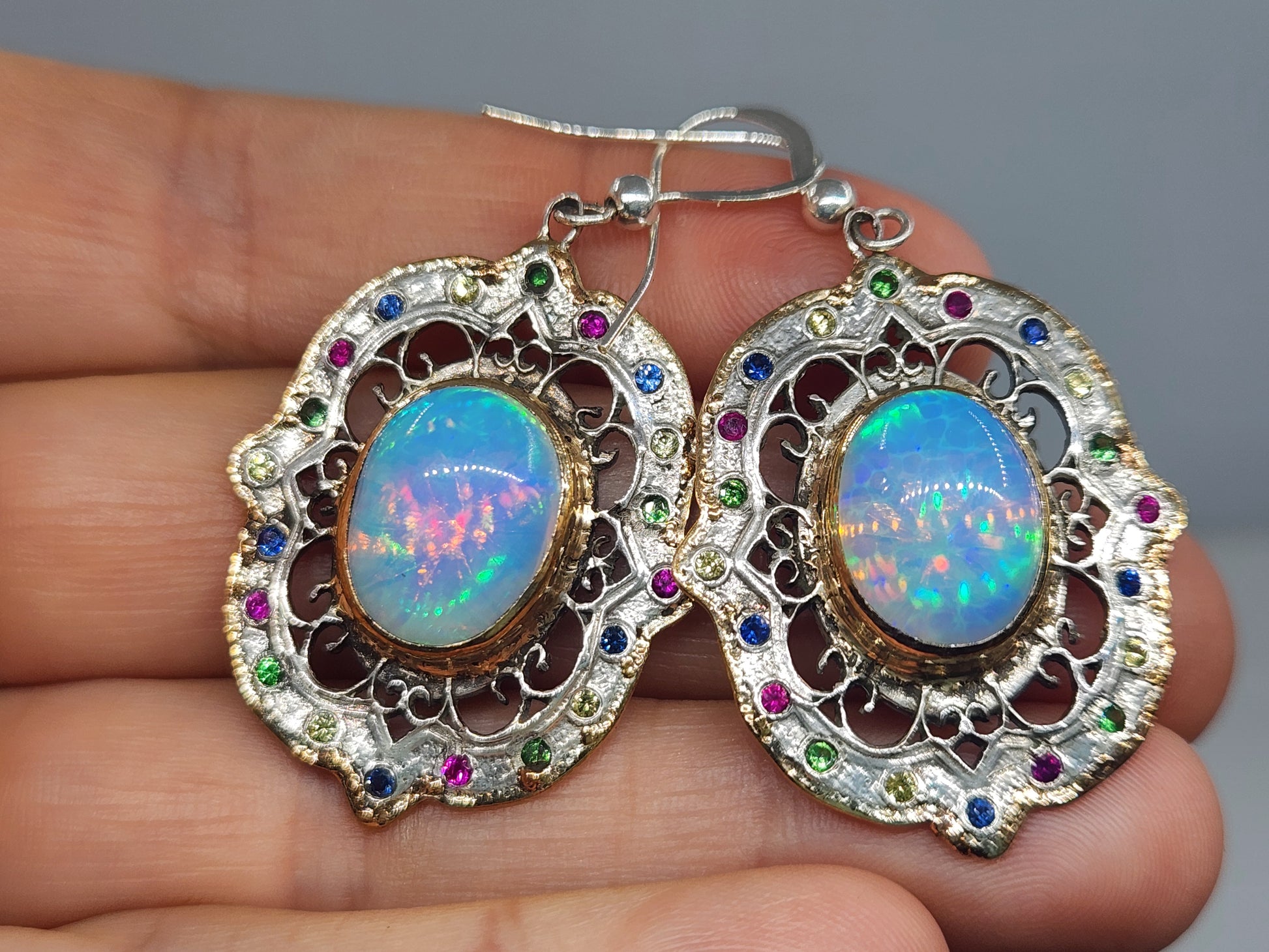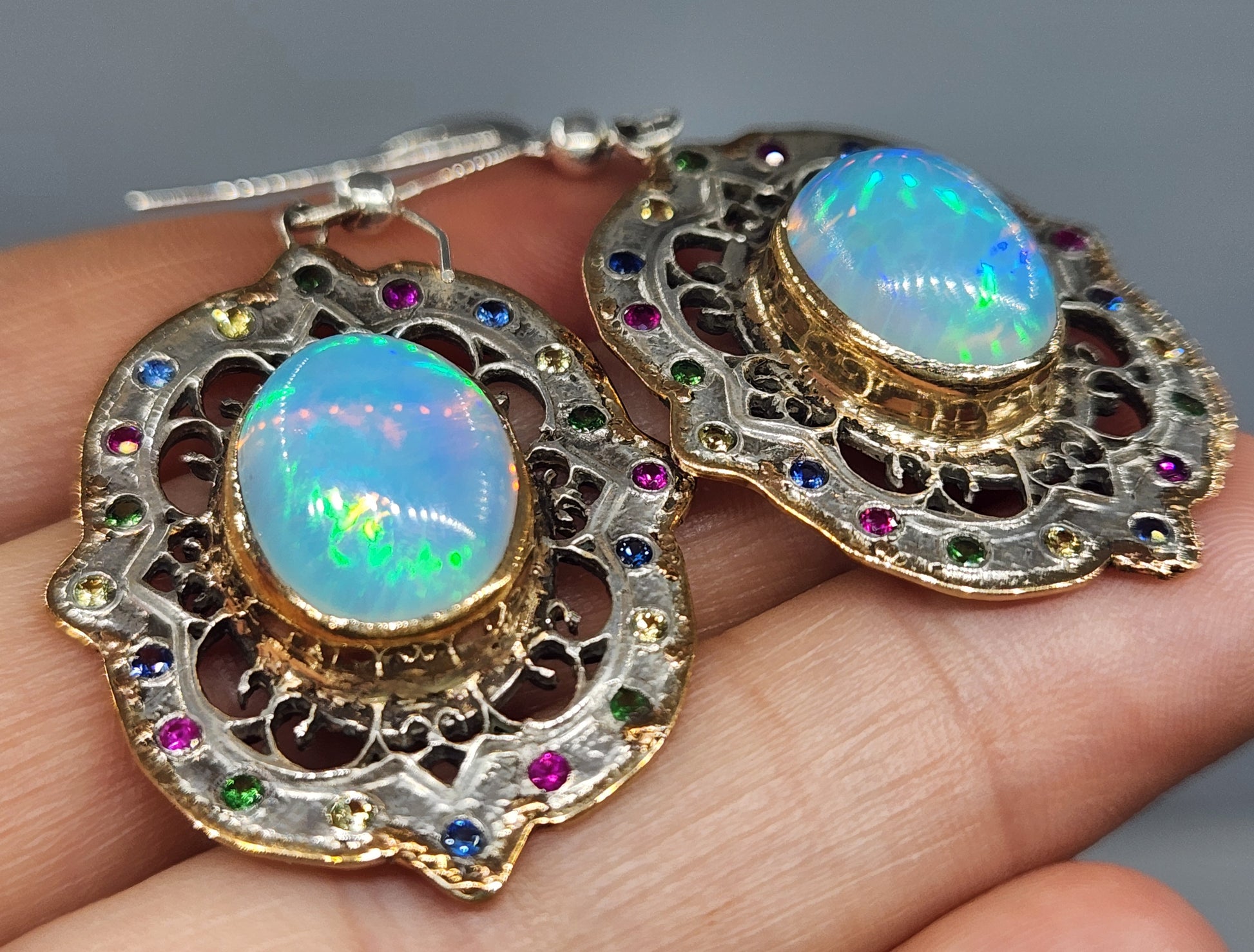 A pair of colorful natural opal cabochons, set in sterling silver and gold fill accent earrings, with color gemstone accent stones.
