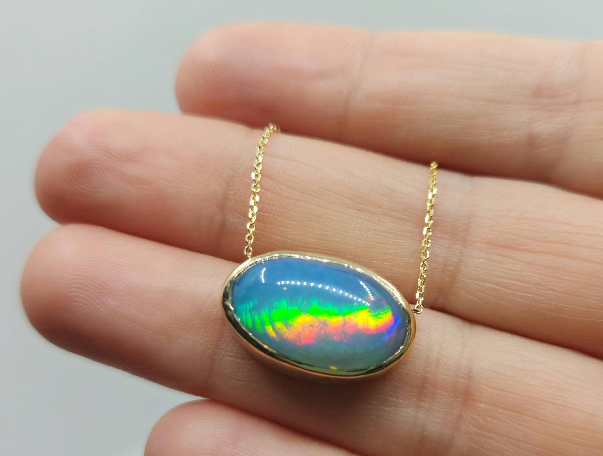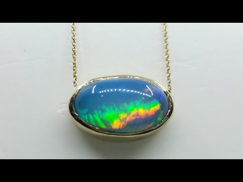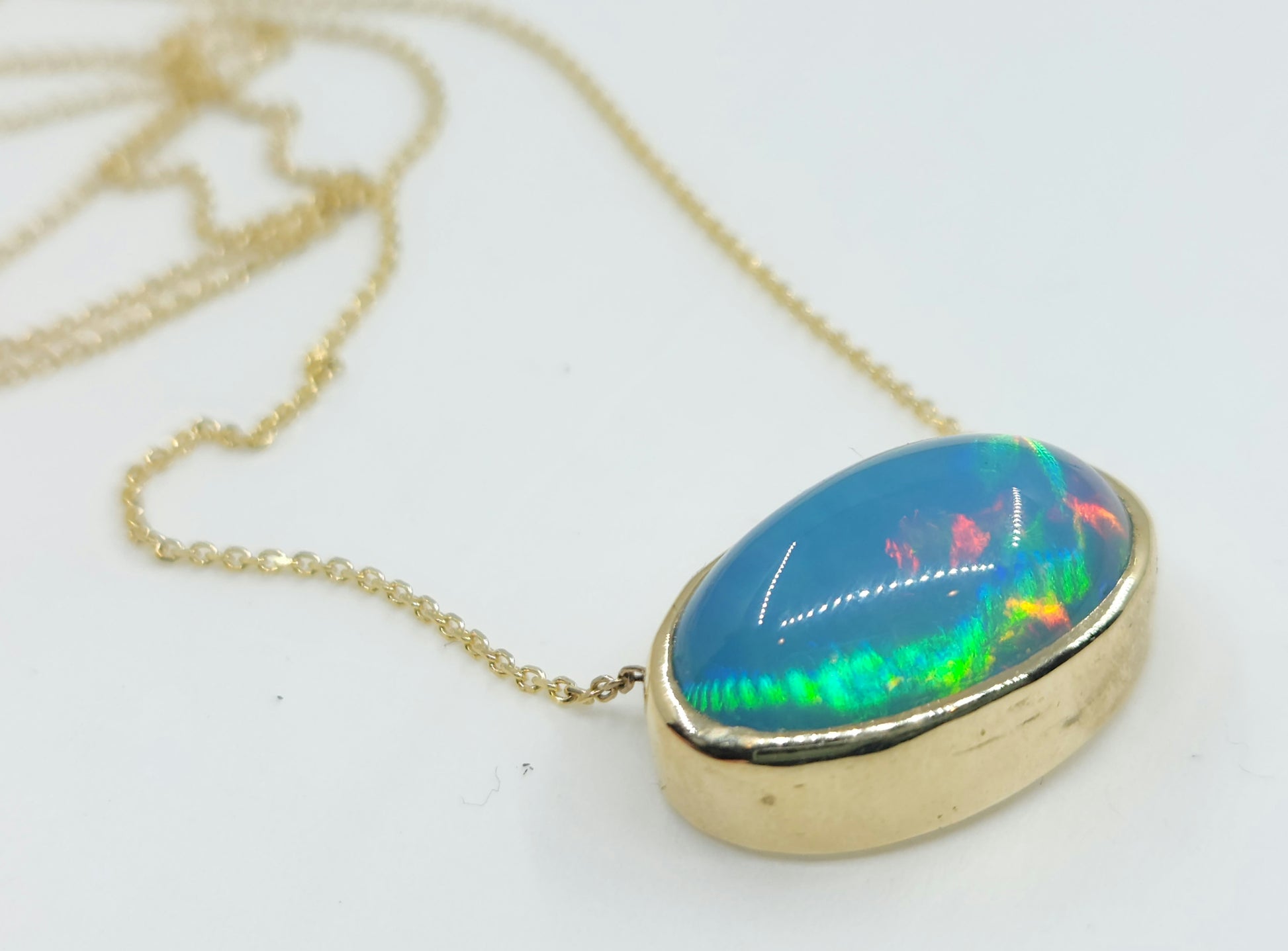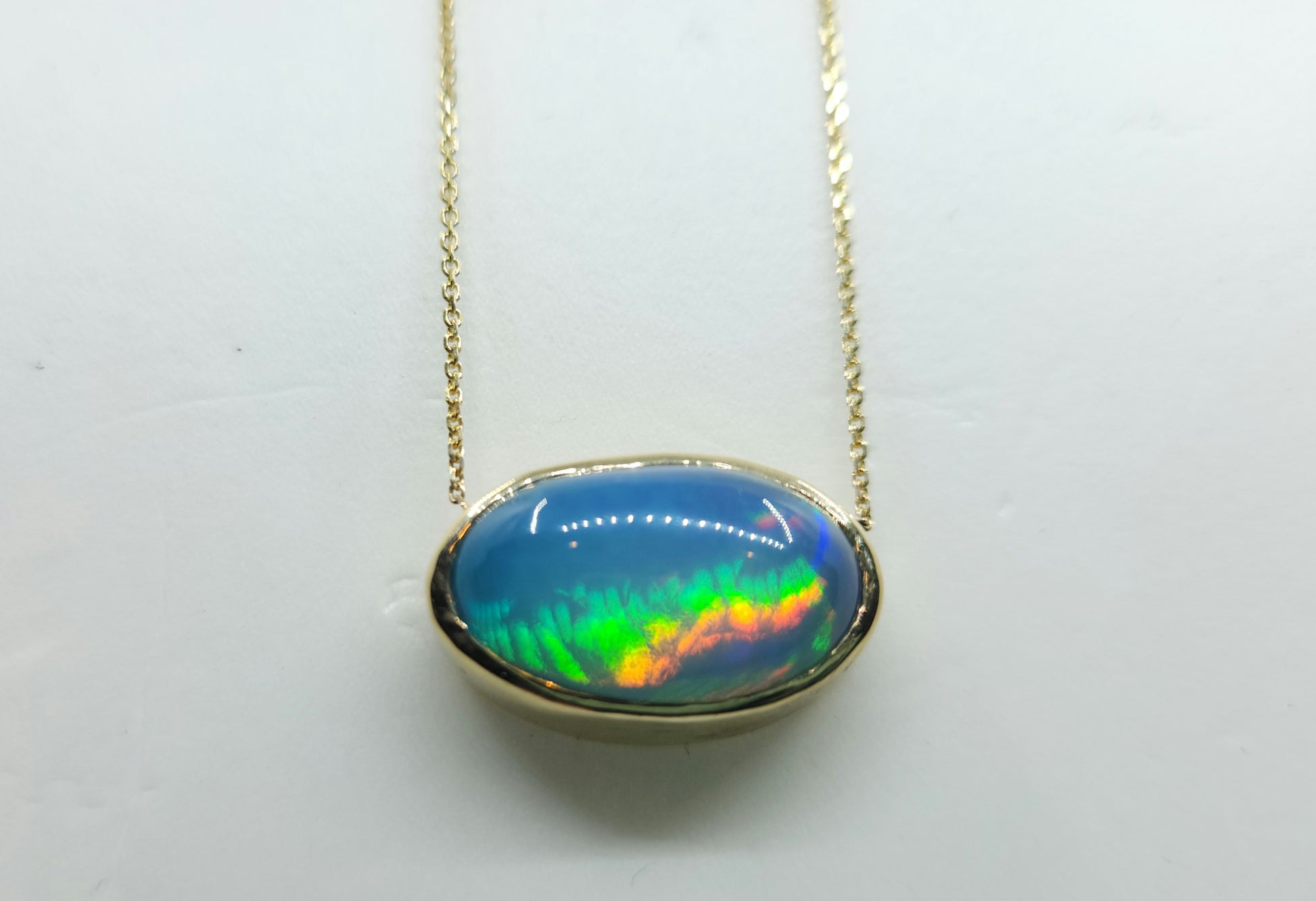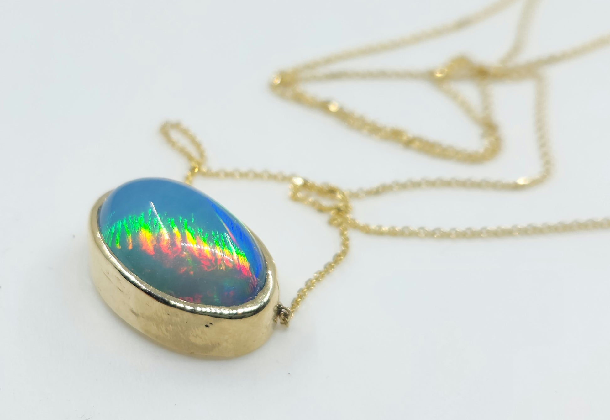 A colorful opal doublet with red, blue and green fire colors, set in 14k gold, on a split chain.