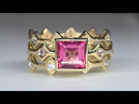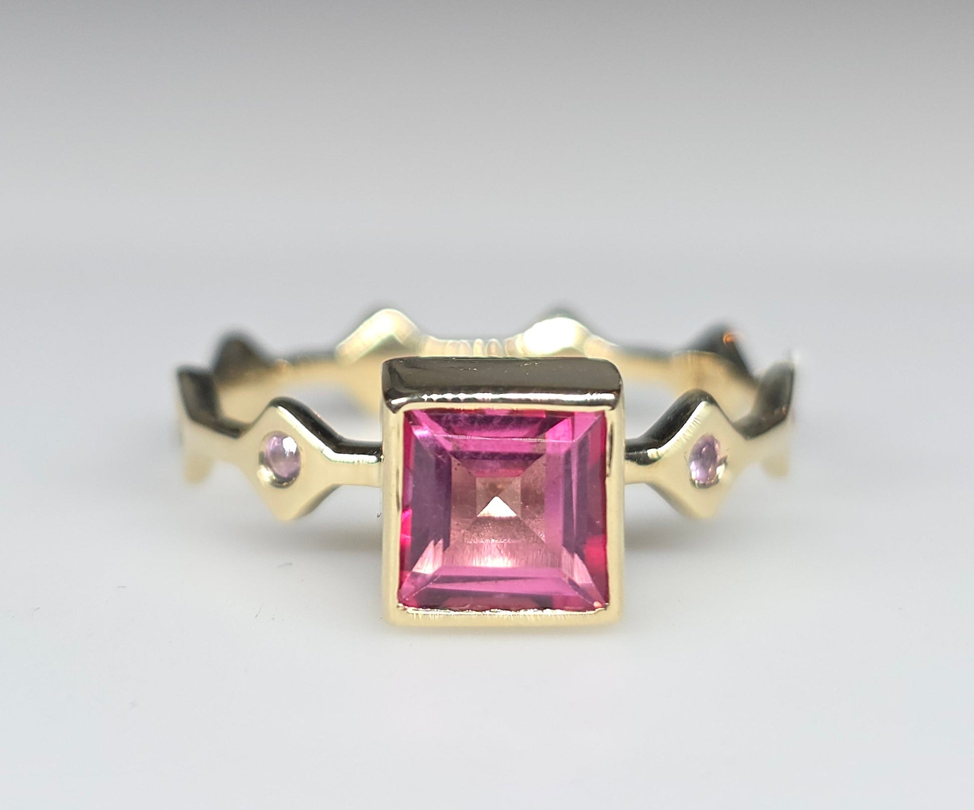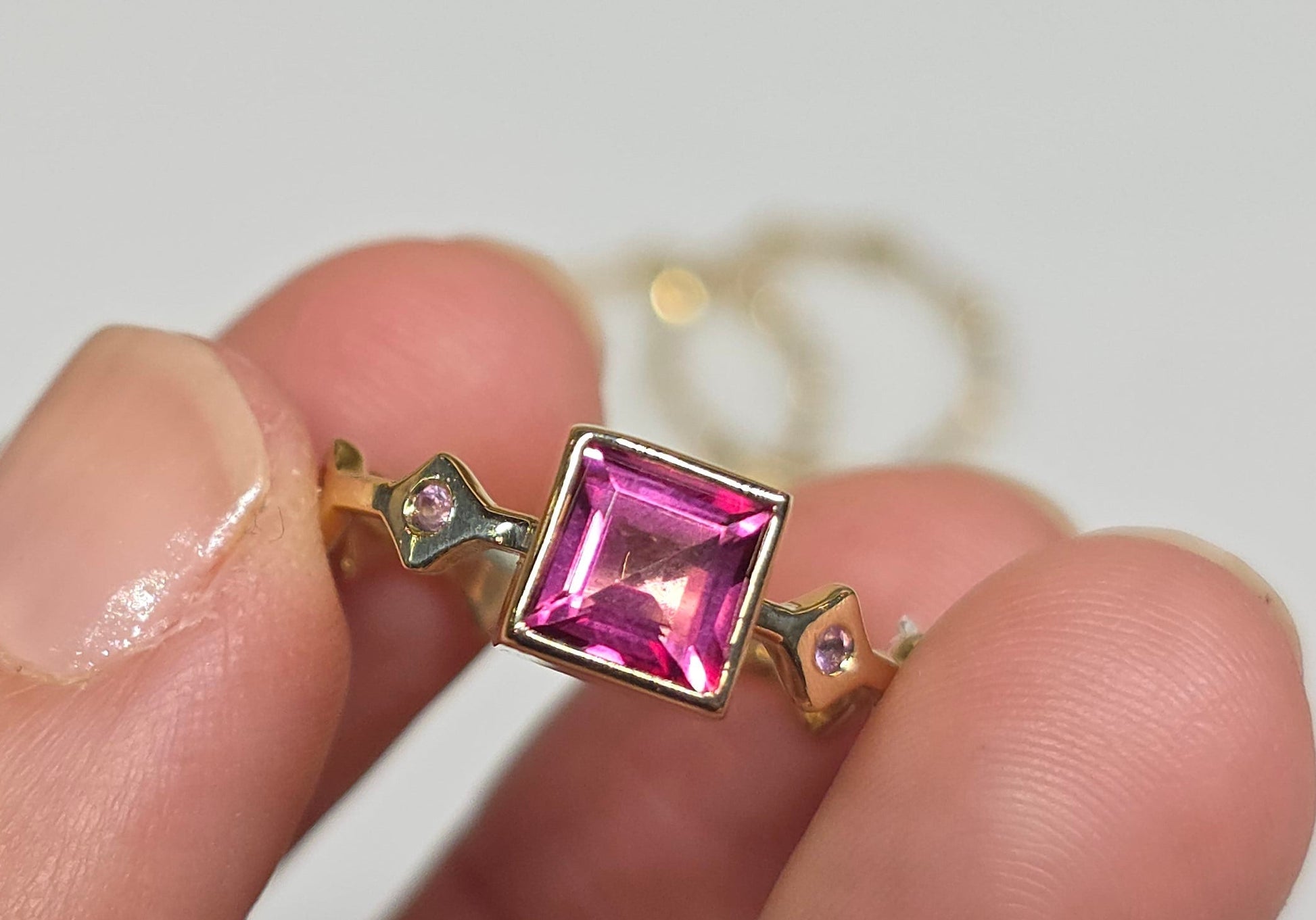 A bright pink topaz set in a 14k solid gold band, with moissanite accent stones. Two solid gold stacking bands are available to add to this single ring (see available options)