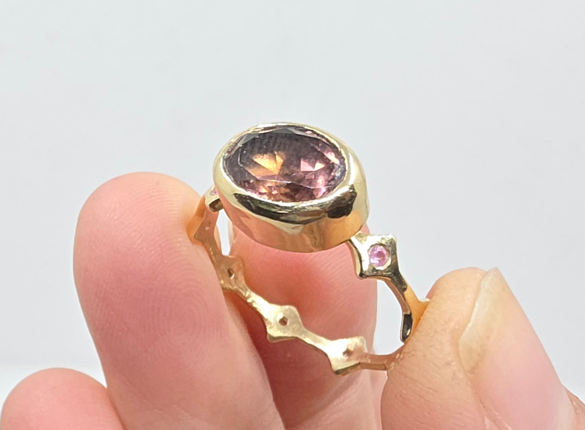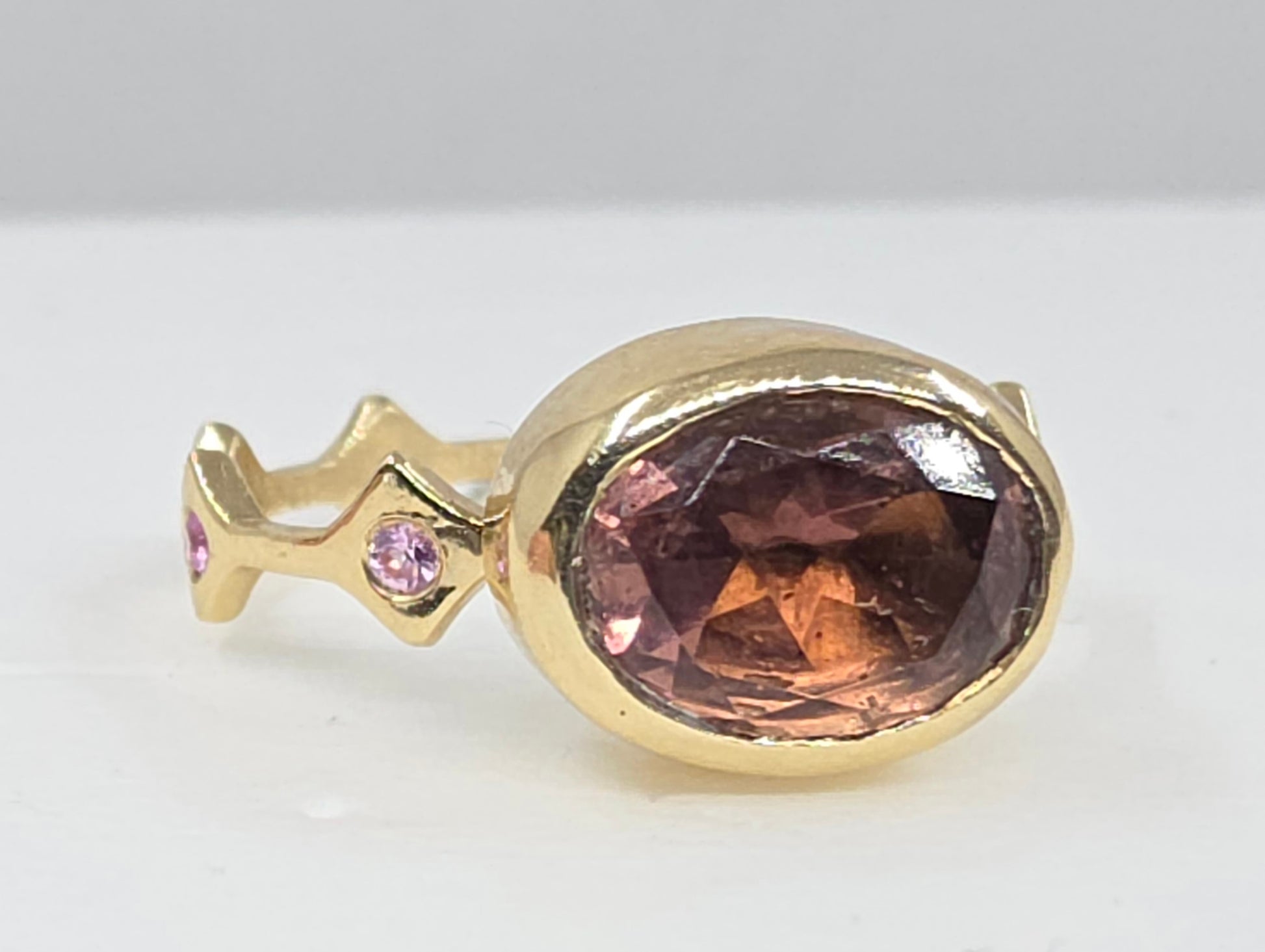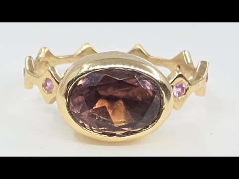 A pink tourmaline set in a 14k solid gold band, with pink sapphire accent stones. Two solid gold stacking bands are available to add to this single ring (see available options)