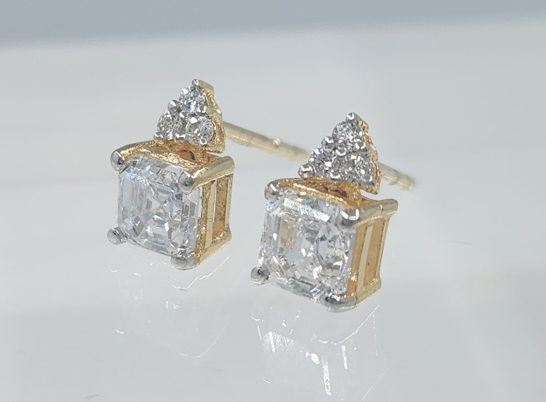 A princess cut diamond stud earrings. The earrings have a hinge, allowing the larger diamond to dangle and have movement.