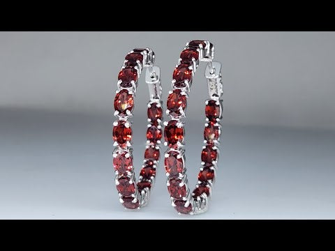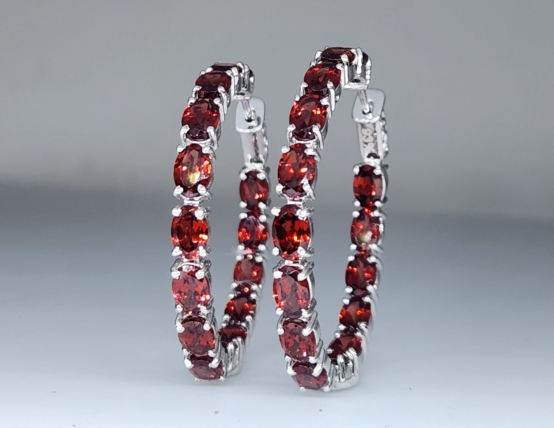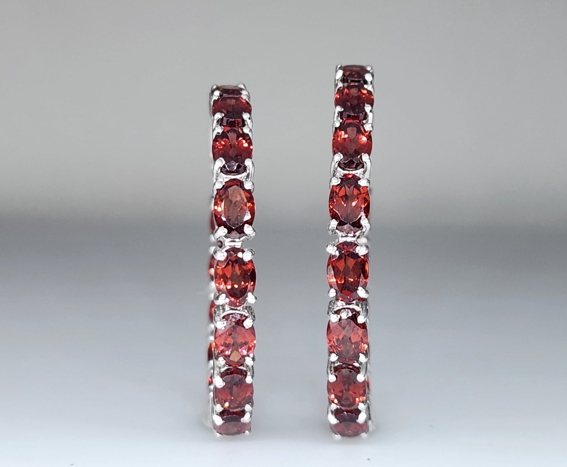 A pair of red garnet gemstone sterling silver hoop earrings.