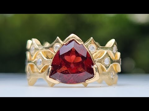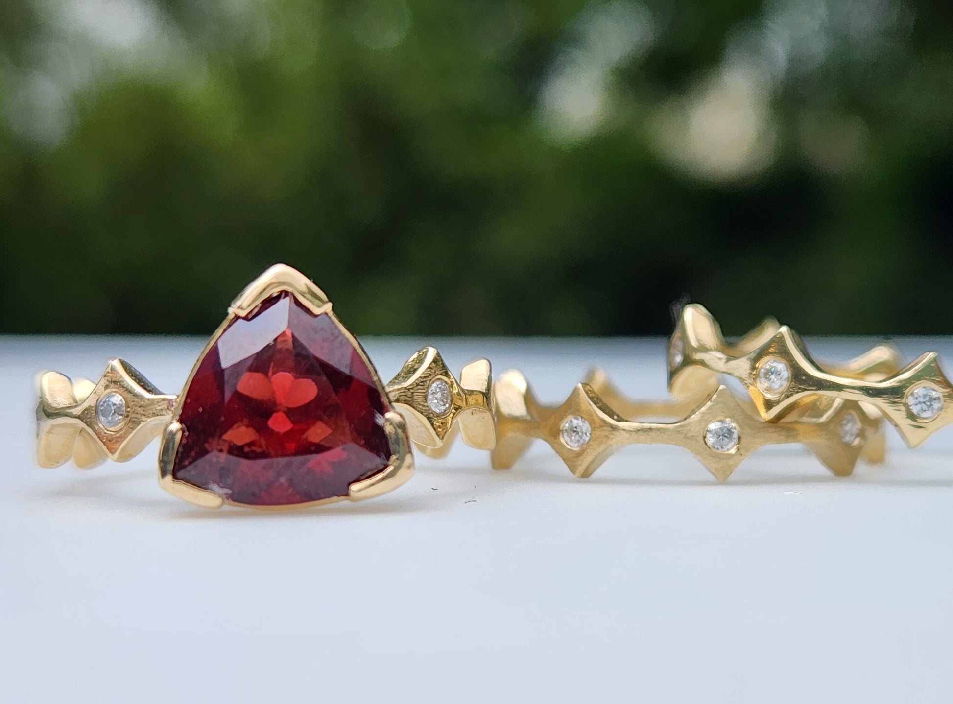 Gemstones: trillion cut red garnet, moissanite accent stones.