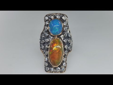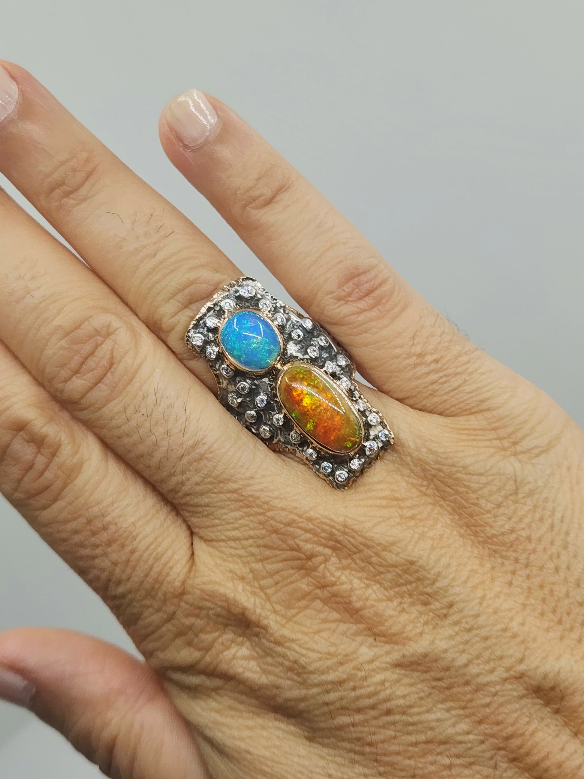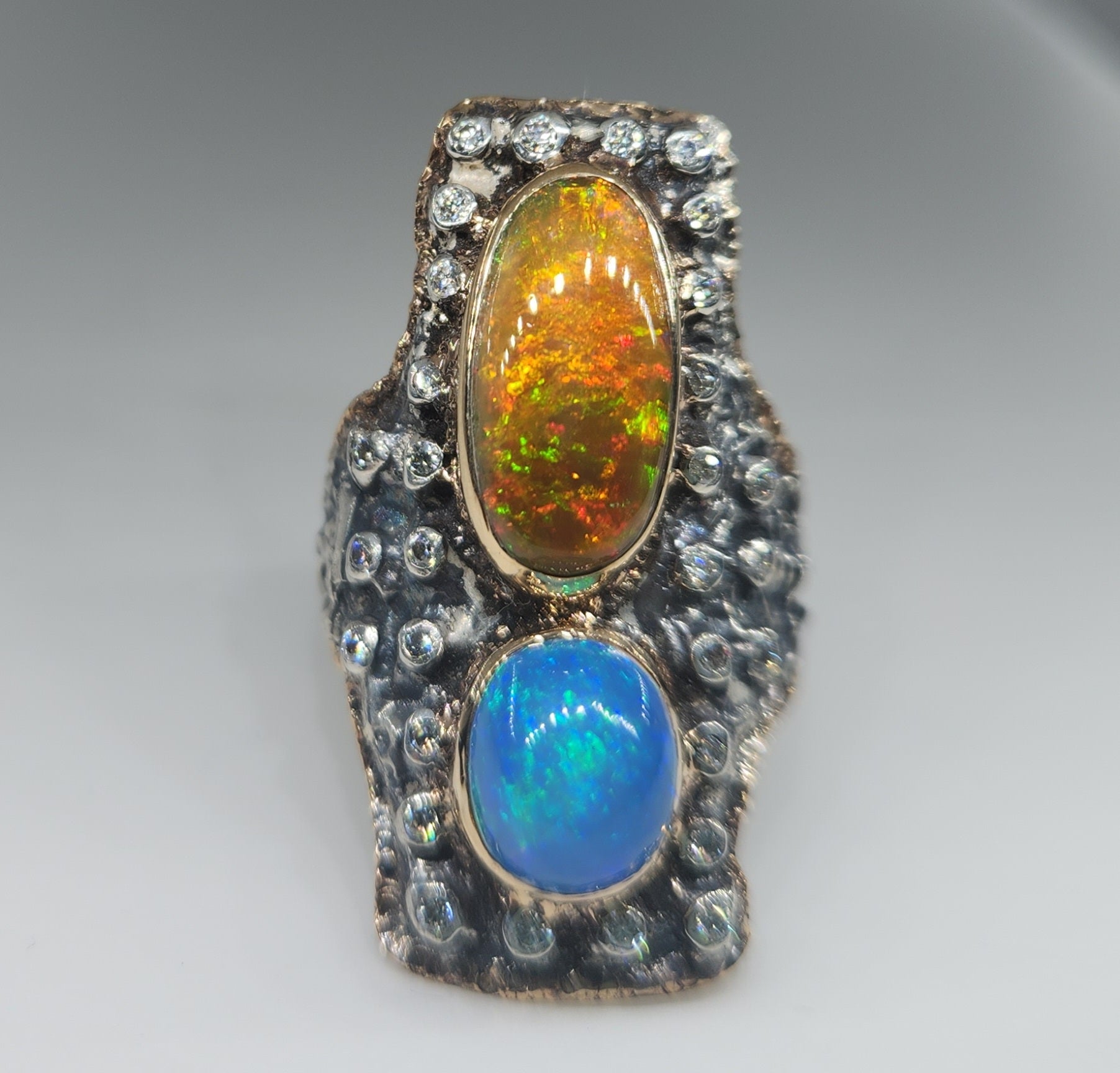 Two bright and colorful blue Ethiopian opals , set in a Sterling Silver ring with 14k gold fill accent and bezels. The opals are surrounded by white moissanite accent stones.
