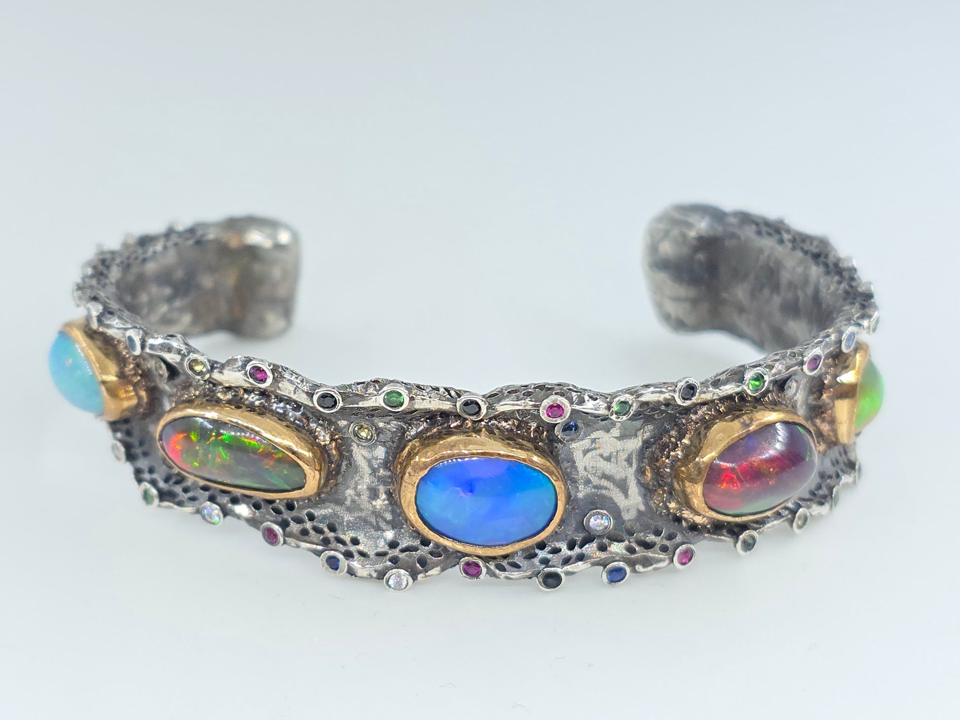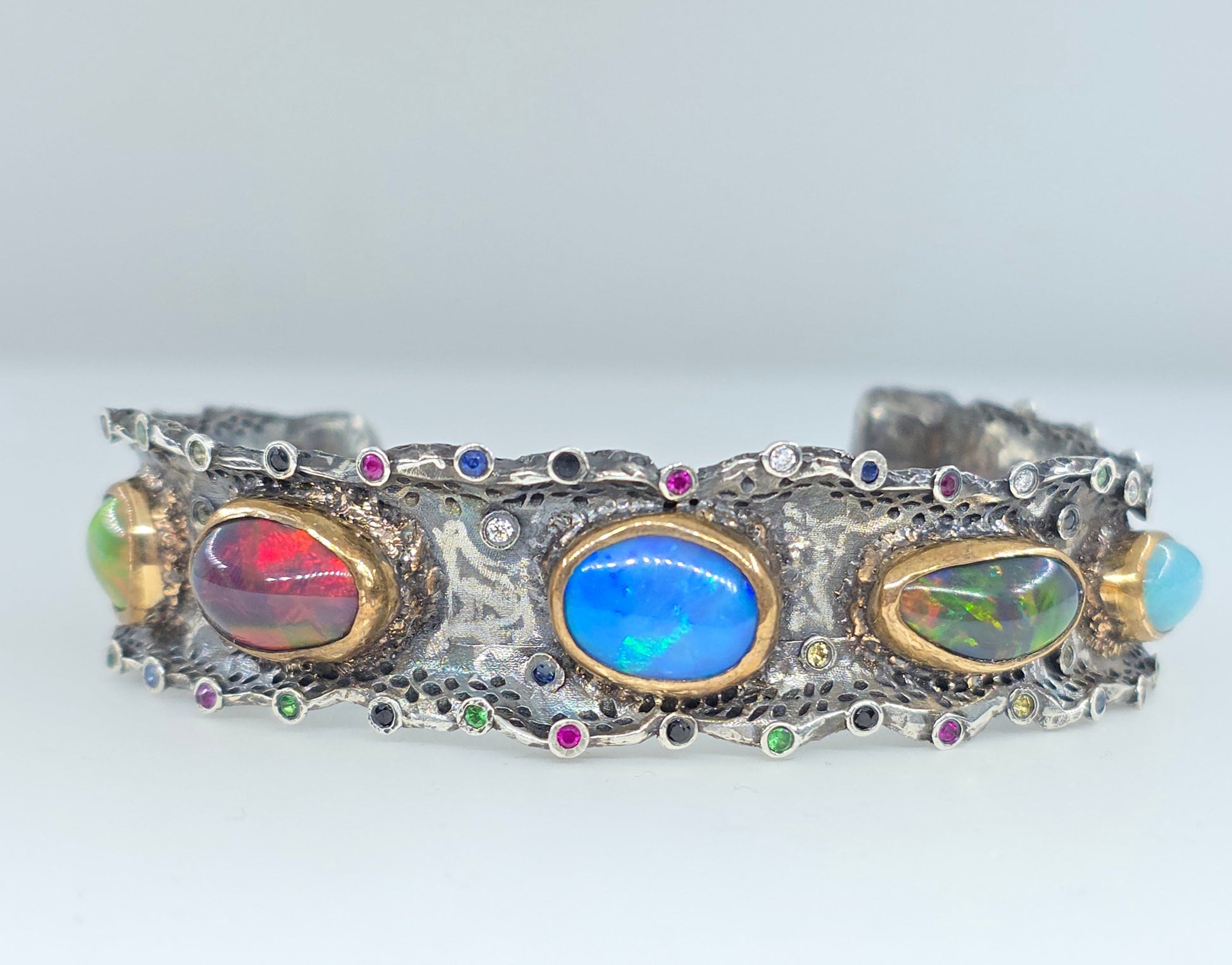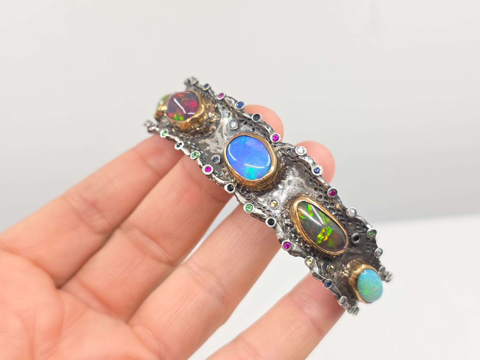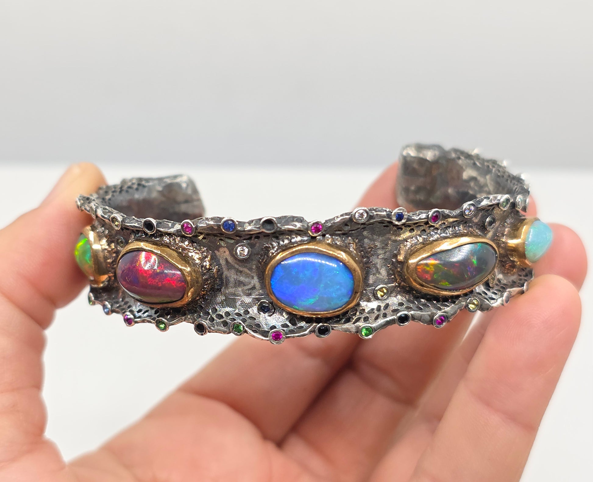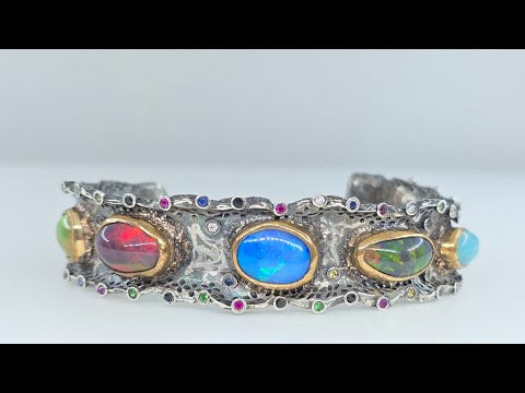 A Sterling Silver cuff bracelet set with 5 colorful opals in gold fill bezels. The bracelet has a collection of various accent stones: moissanite ruby, sapphire, and green tsavorite garnet. Take a look at the item video for a closer look.
