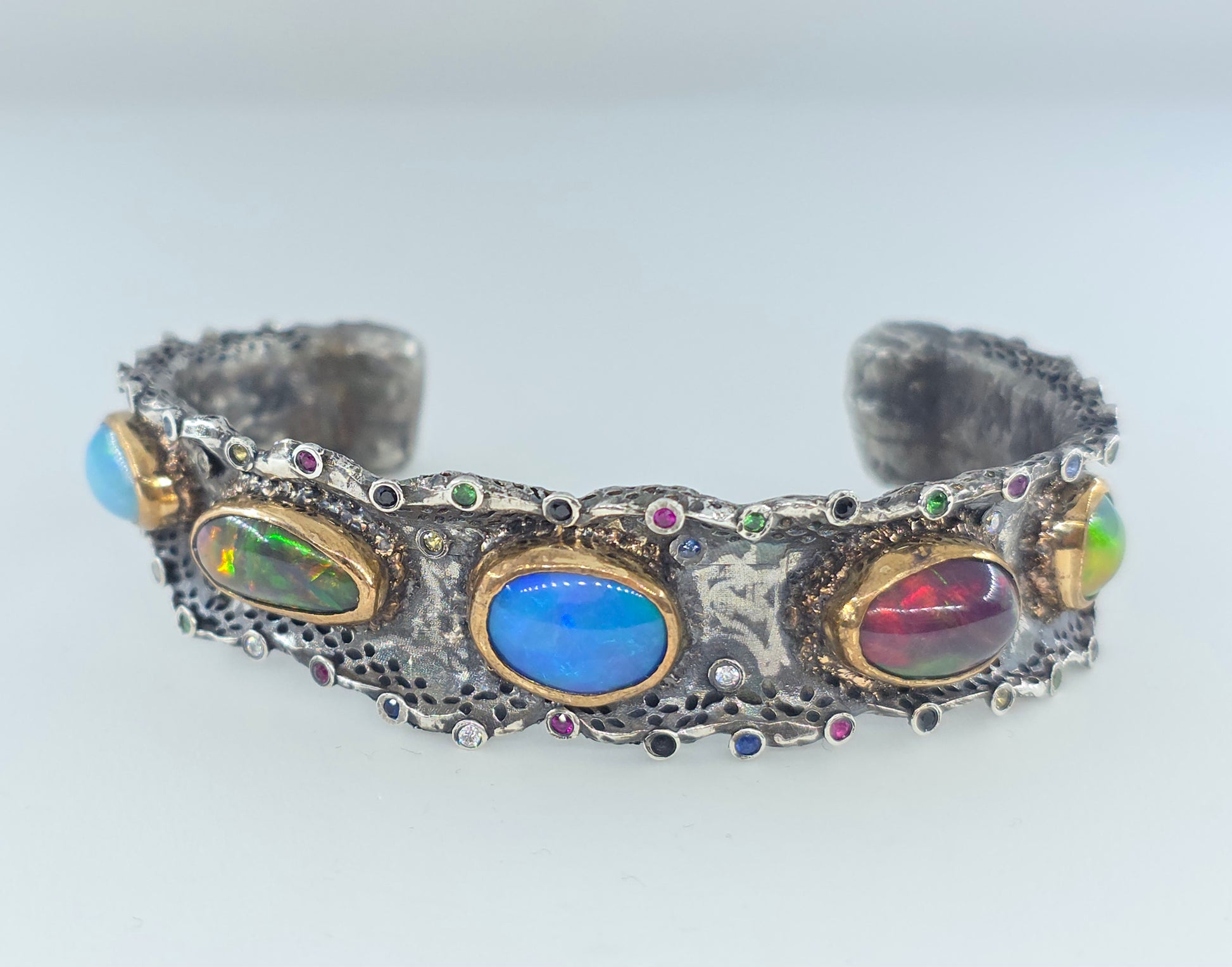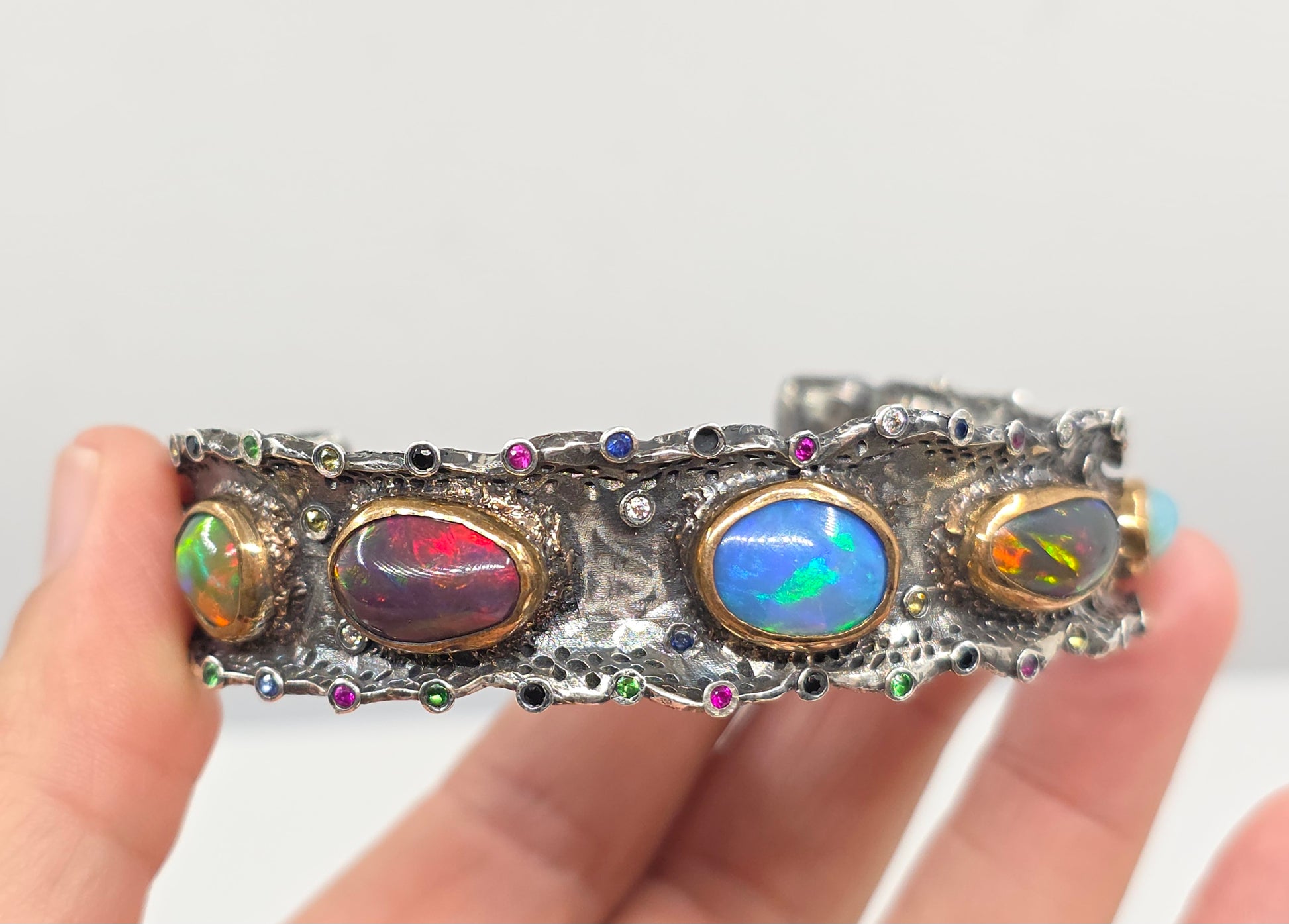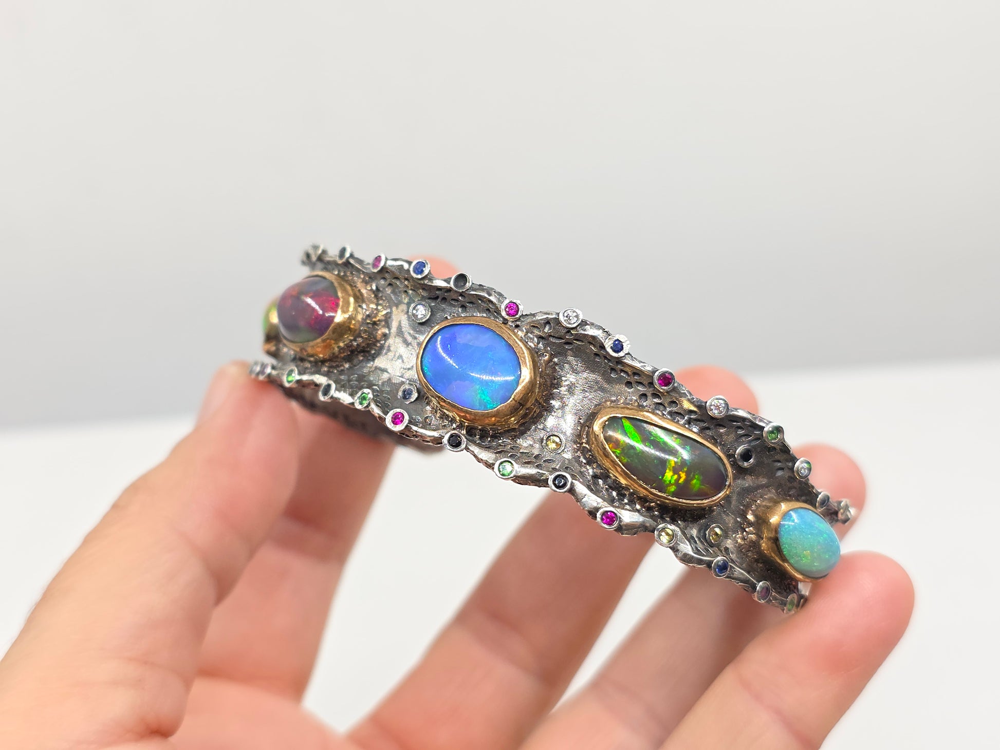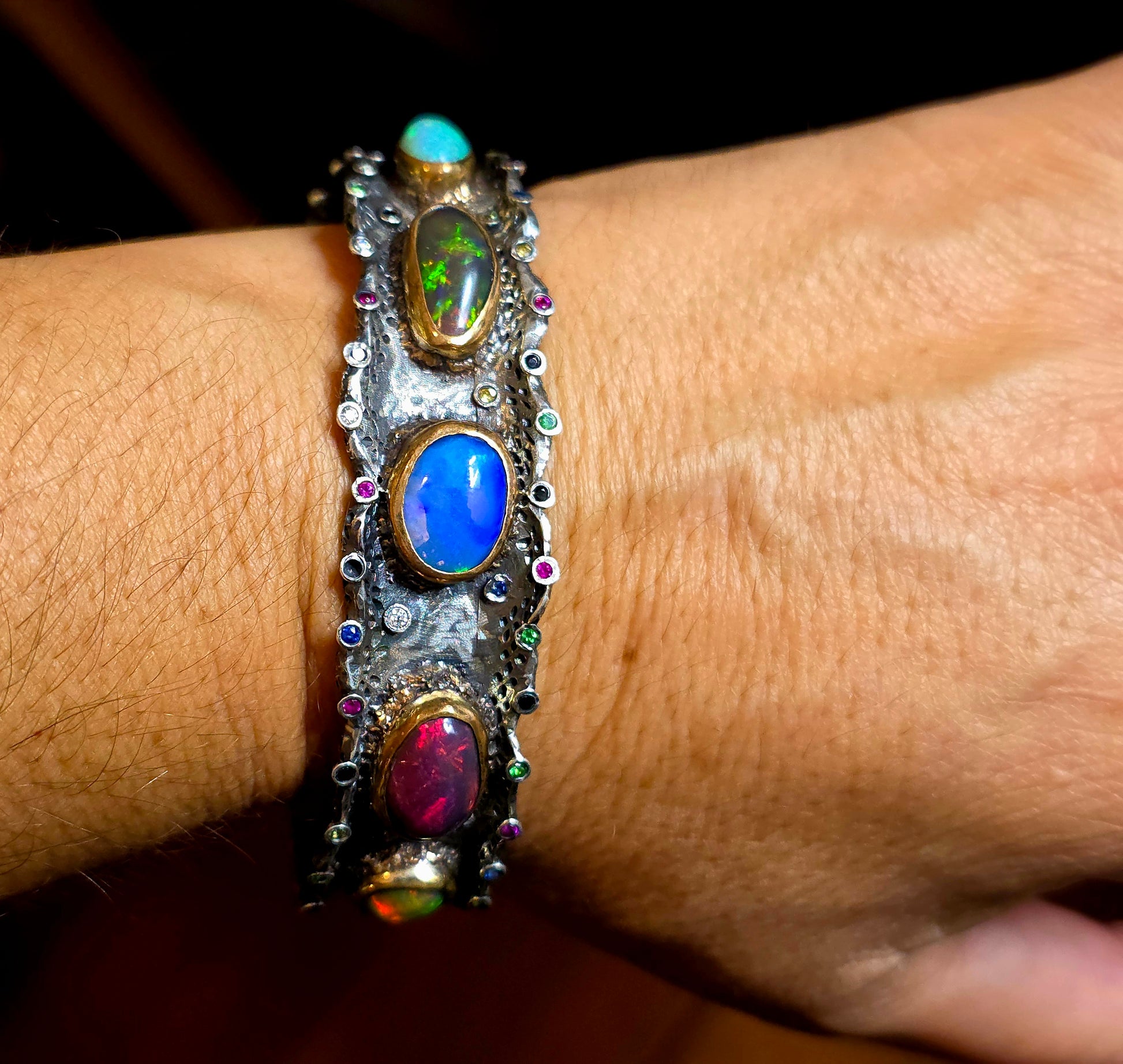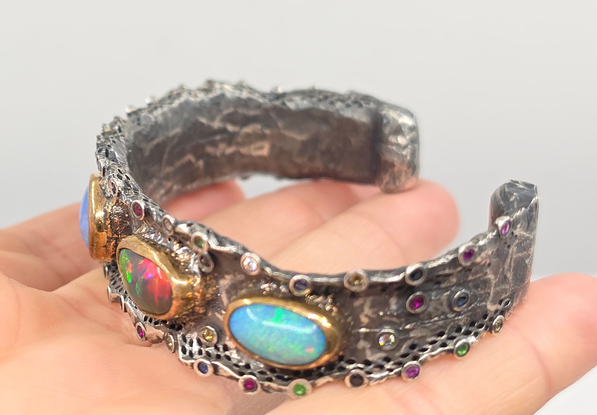 A Sterling Silver cuff bracelet set with 5 colorful opals in gold fill bezels. The bracelet has a collection of various accent stones: moissanite ruby, sapphire, and green tsavorite garnet. Take a look at the item video for a closer look.