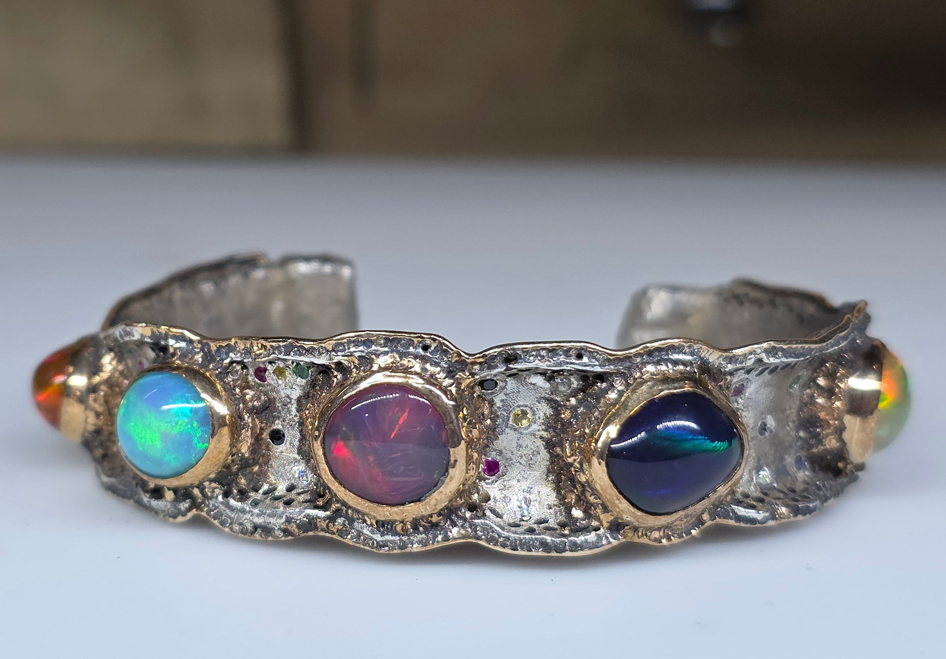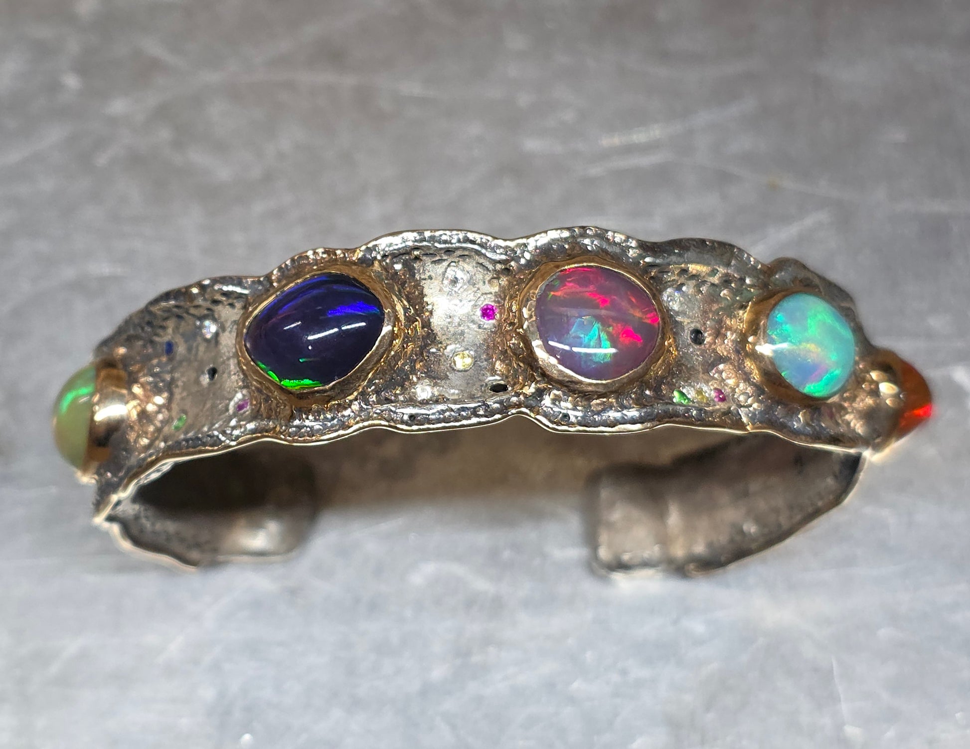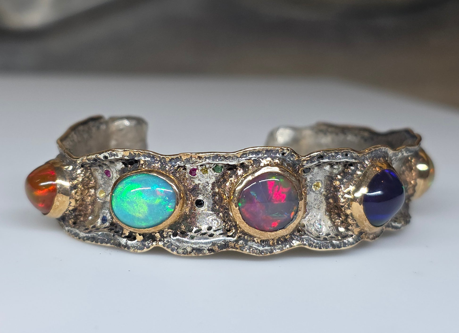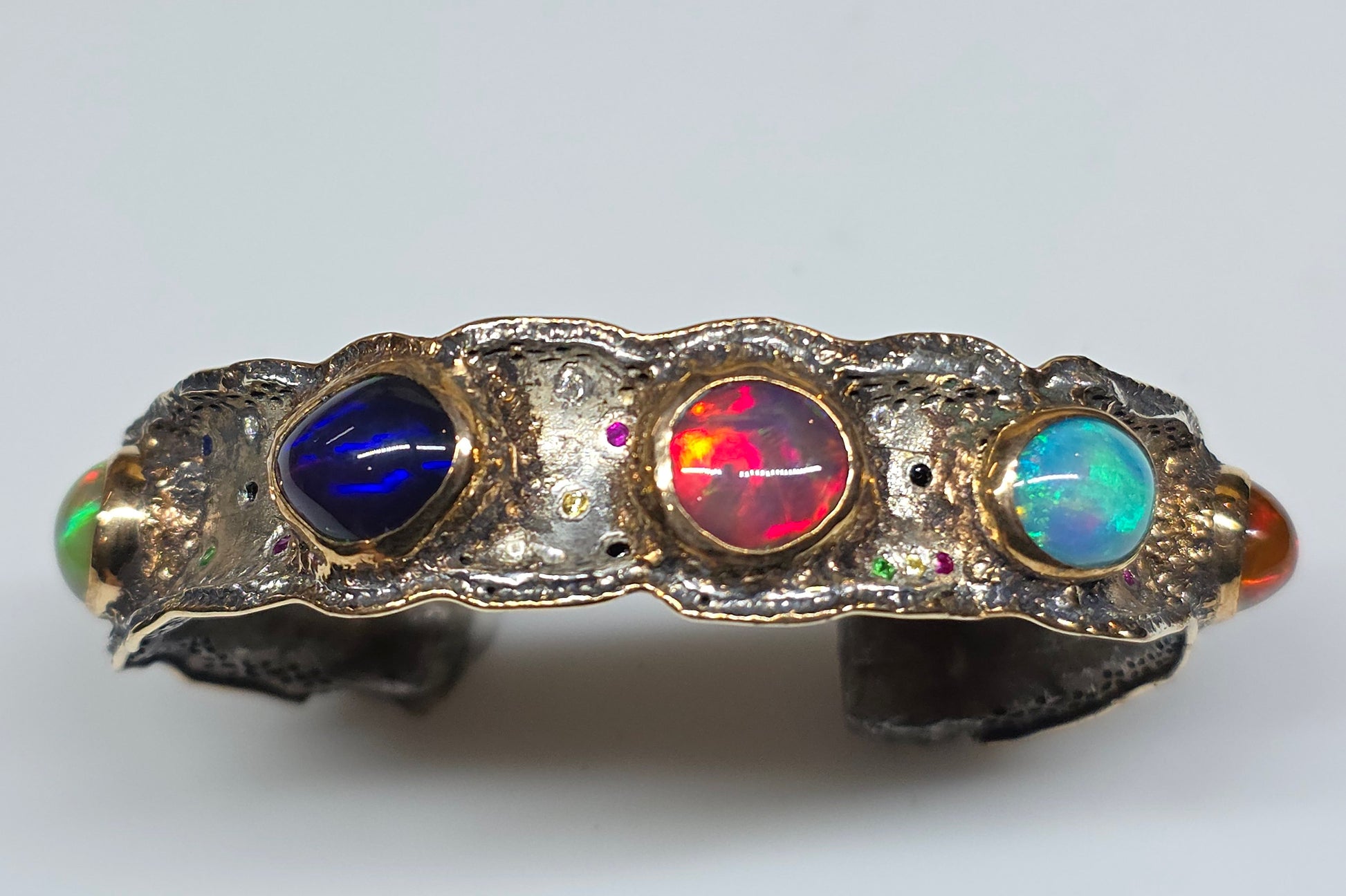 A Sterling Silver cuff bracelet set with 5 colorful opals, and a collection of various accent stones: ruby, sapphire, and green tsavorite garnet. Gold fill bezels the 5 opals and also lines the outer rims of the bracelet. Take a look at the item video for a closer look.