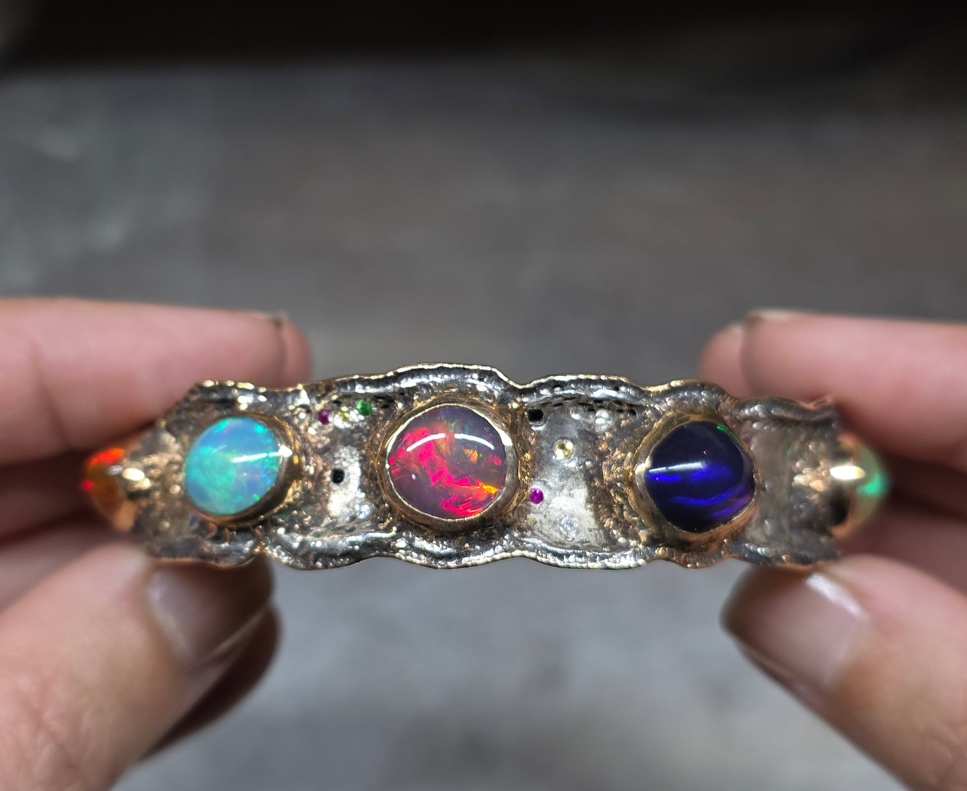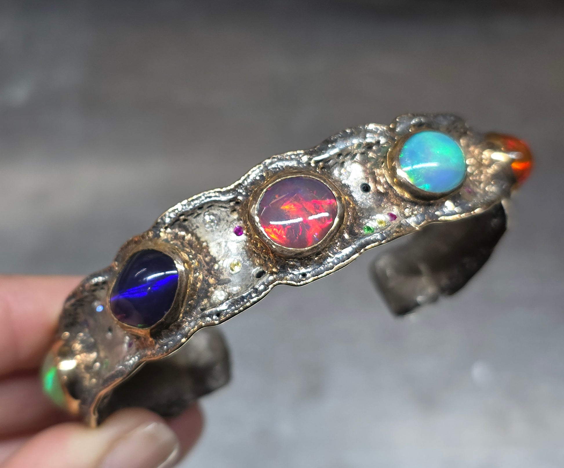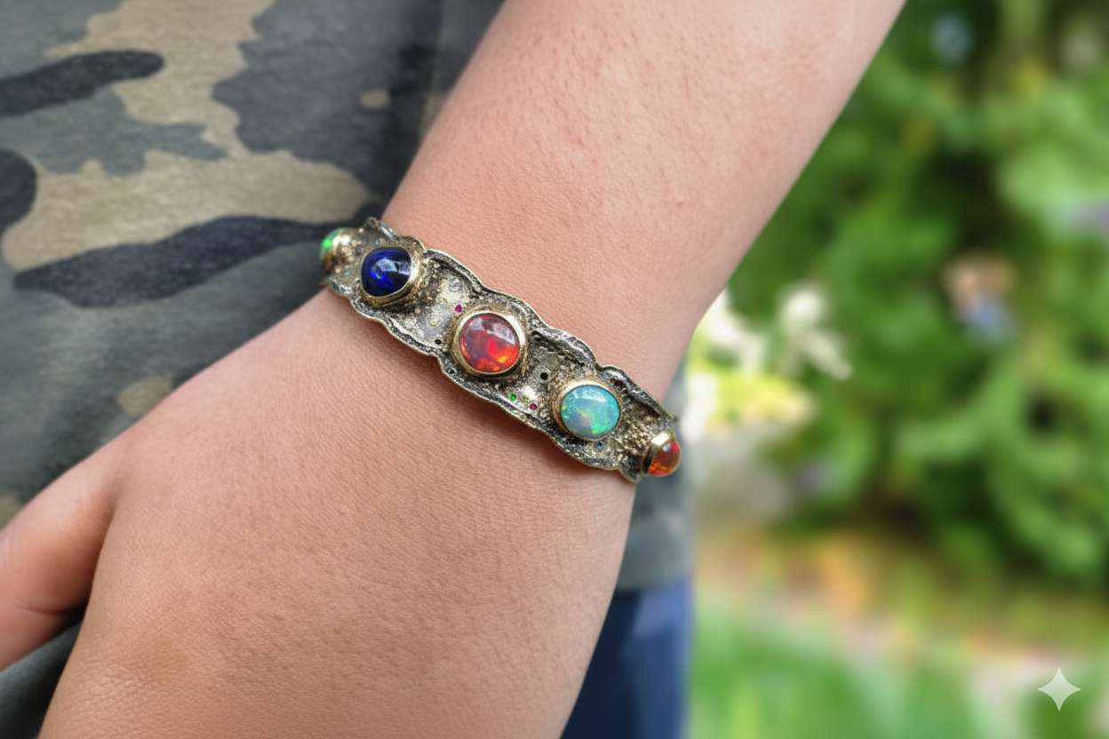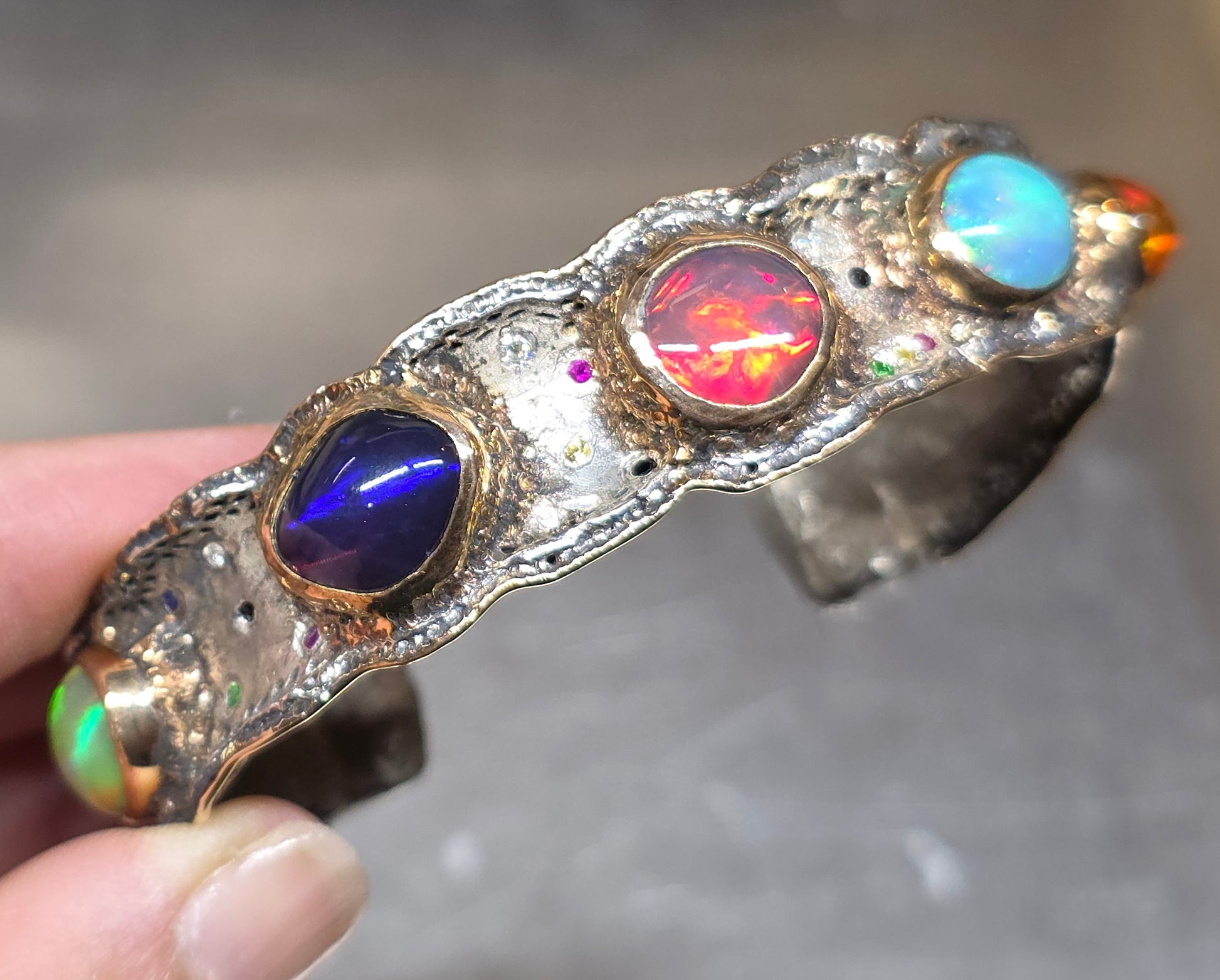 A Sterling Silver cuff bracelet set with 5 colorful opals, and a collection of various accent stones: ruby, sapphire, and green tsavorite garnet. Gold fill bezels the 5 opals and also lines the outer rims of the bracelet. Take a look at the item video for a closer look.