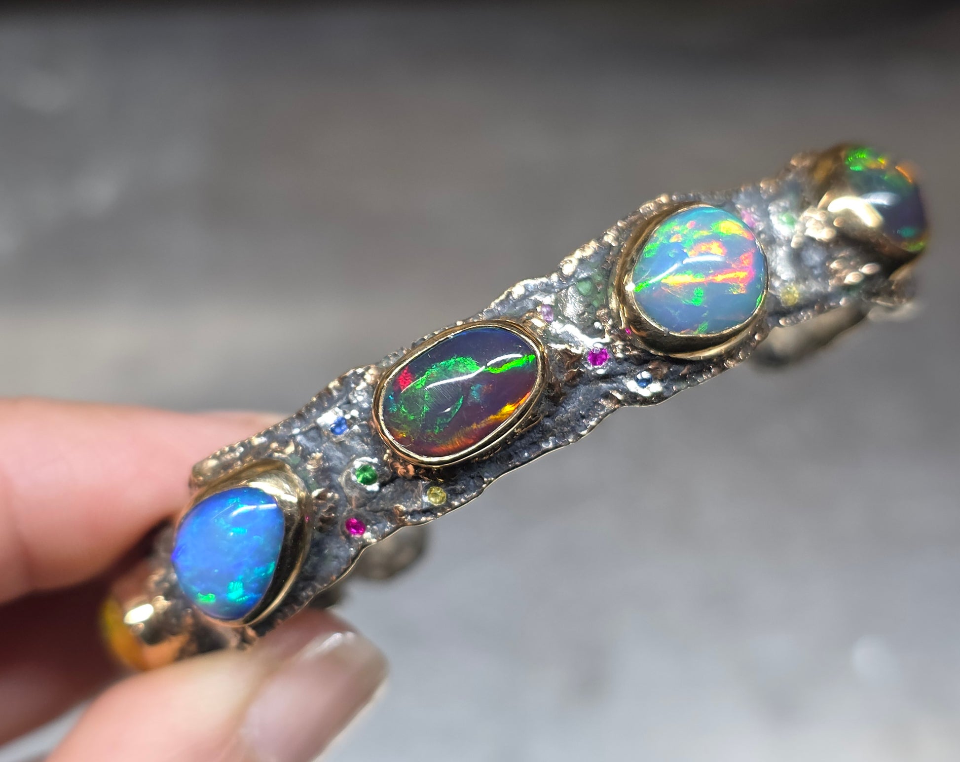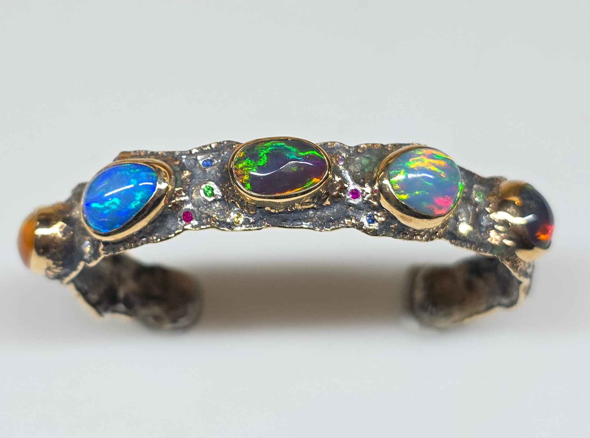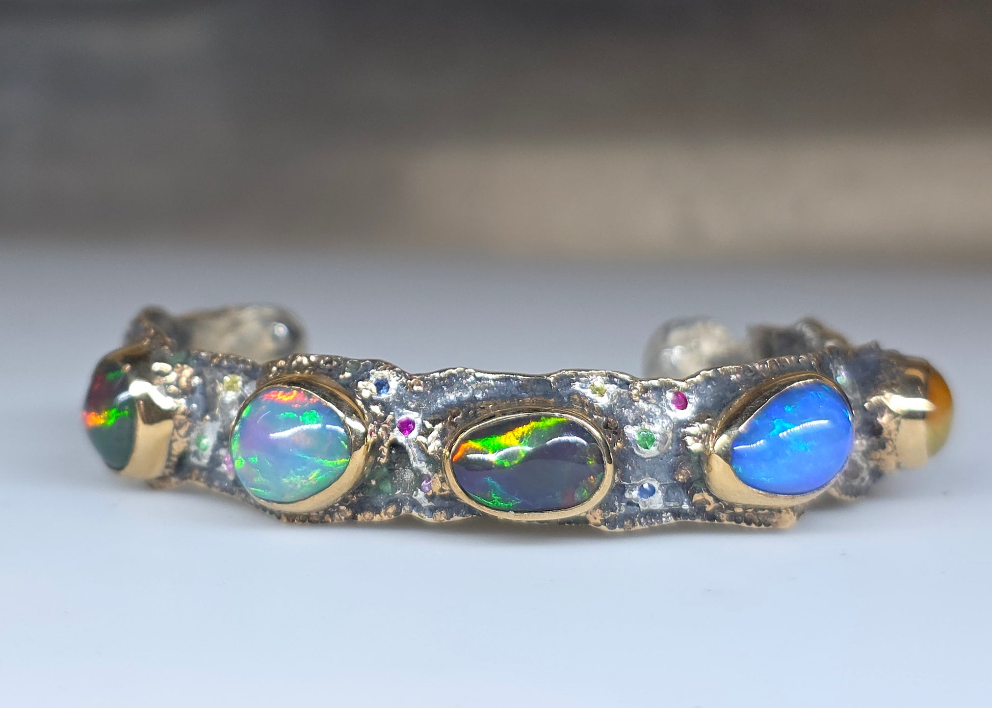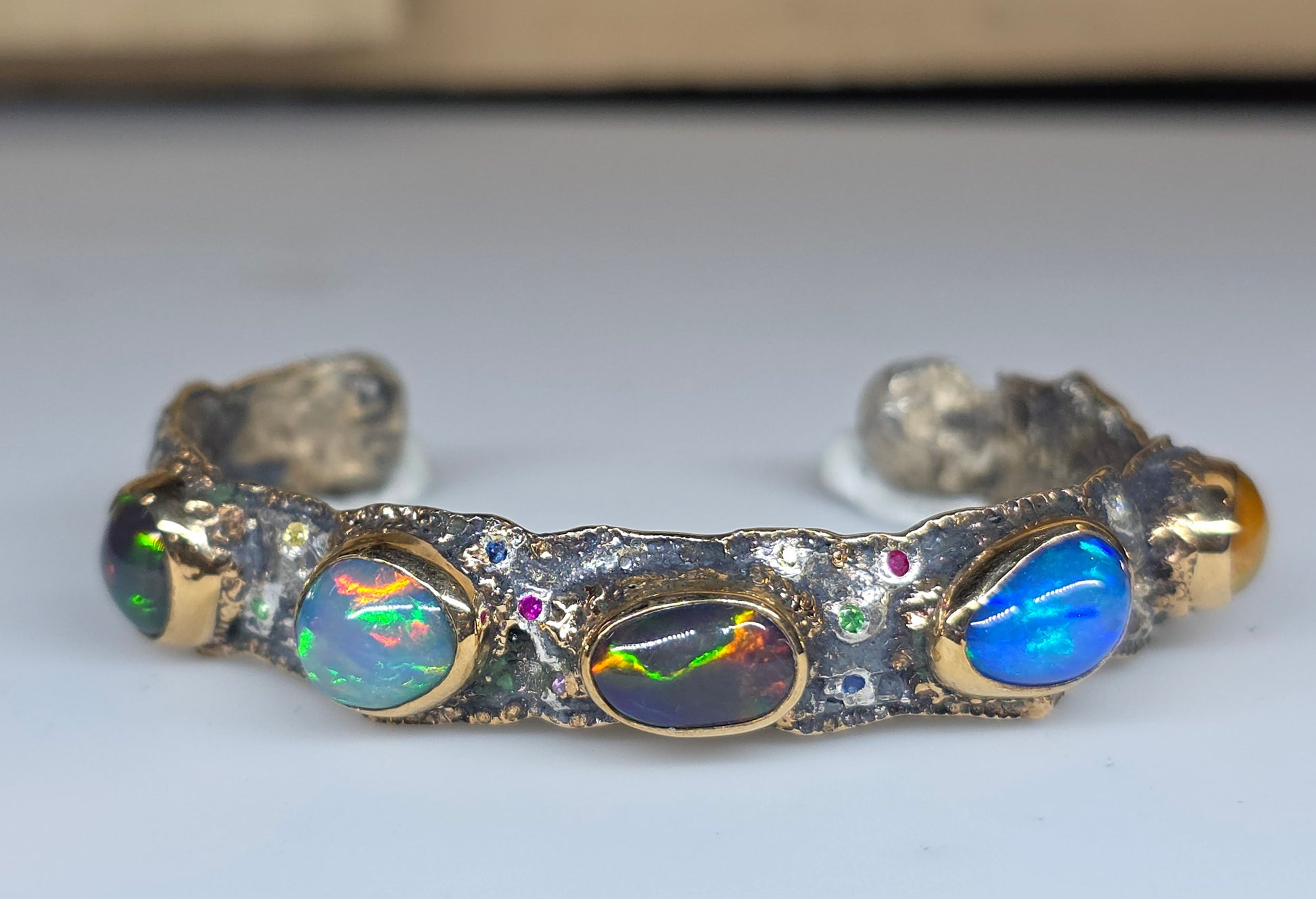 A Sterling Silver cuff bracelet set with 5 colorful opals, and a collection of various accent stones: ruby, sapphire, and green tsavorite garnet. Gold fill bezels the 5 opals and also lines the outer rims of the bracelet. Take a look at the item video for a closer look.